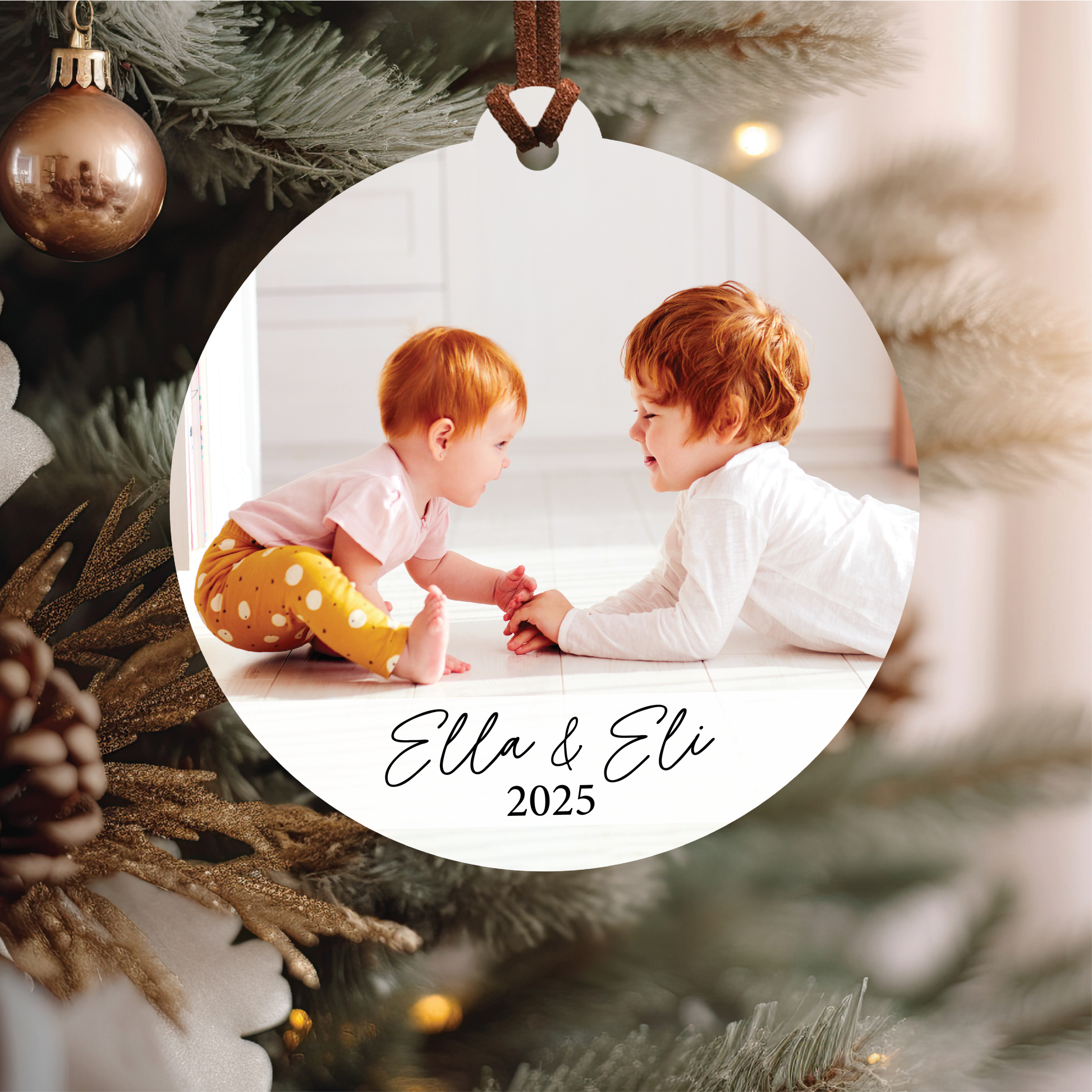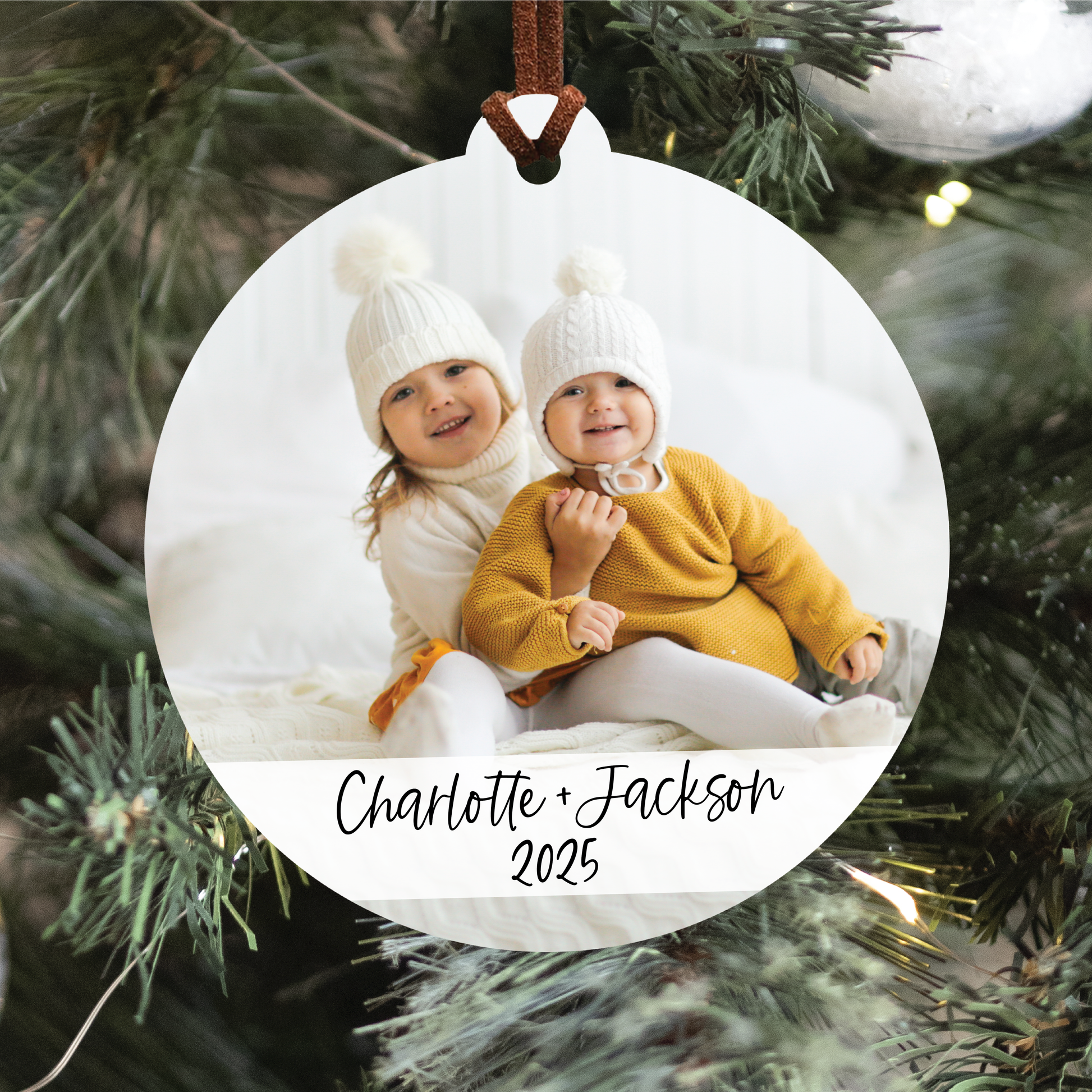 Each ornament is laser cut from 1/8" white acrylic and then printed with permanent ink. They are finished with a brown suede string for a modern look. One side will be printed with your photo and text; the other side will be white.