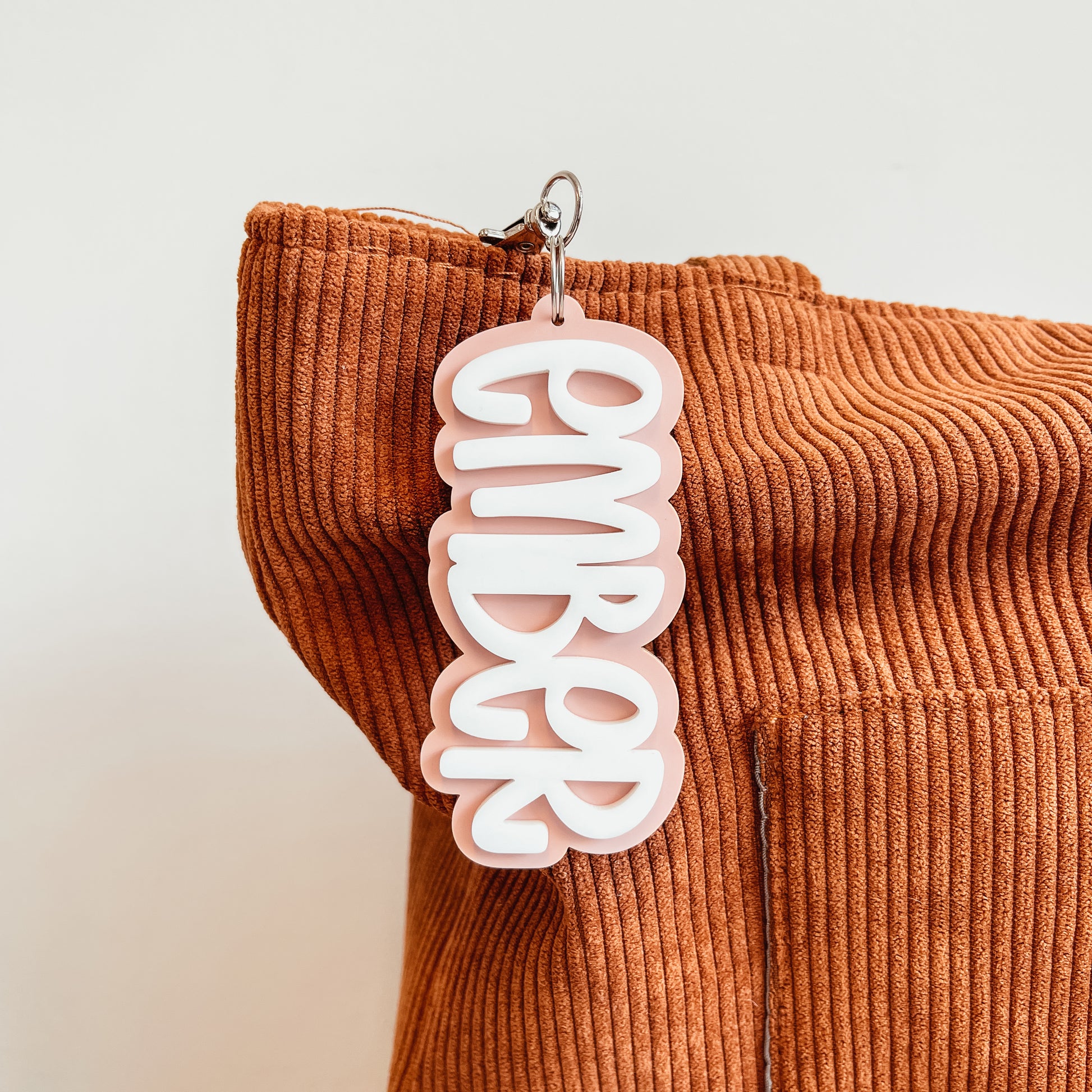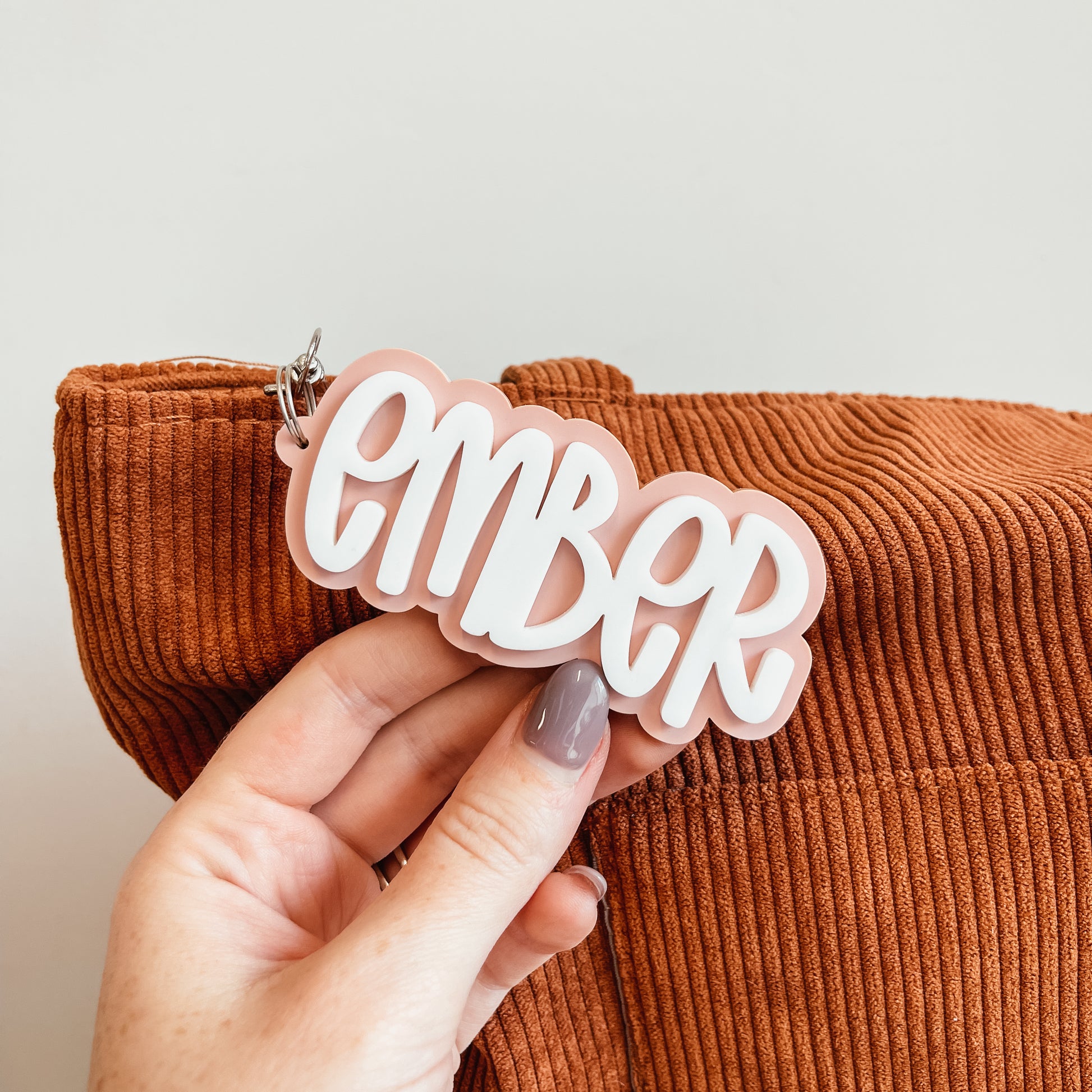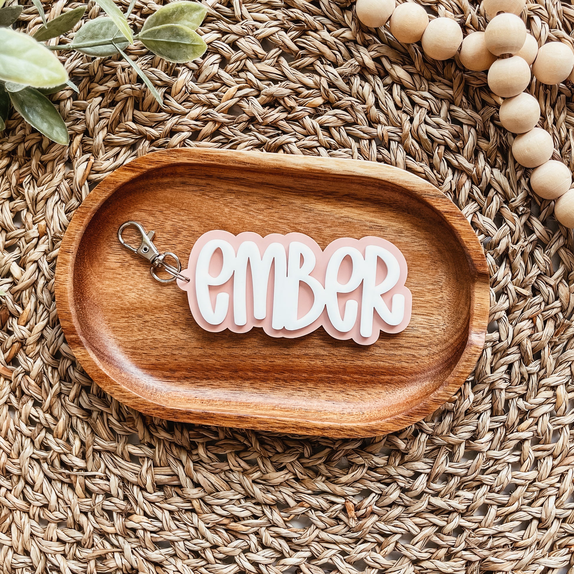 Each keychain is made of two layers of acrylic. The name is white and the base is cut in the colour of your choice.