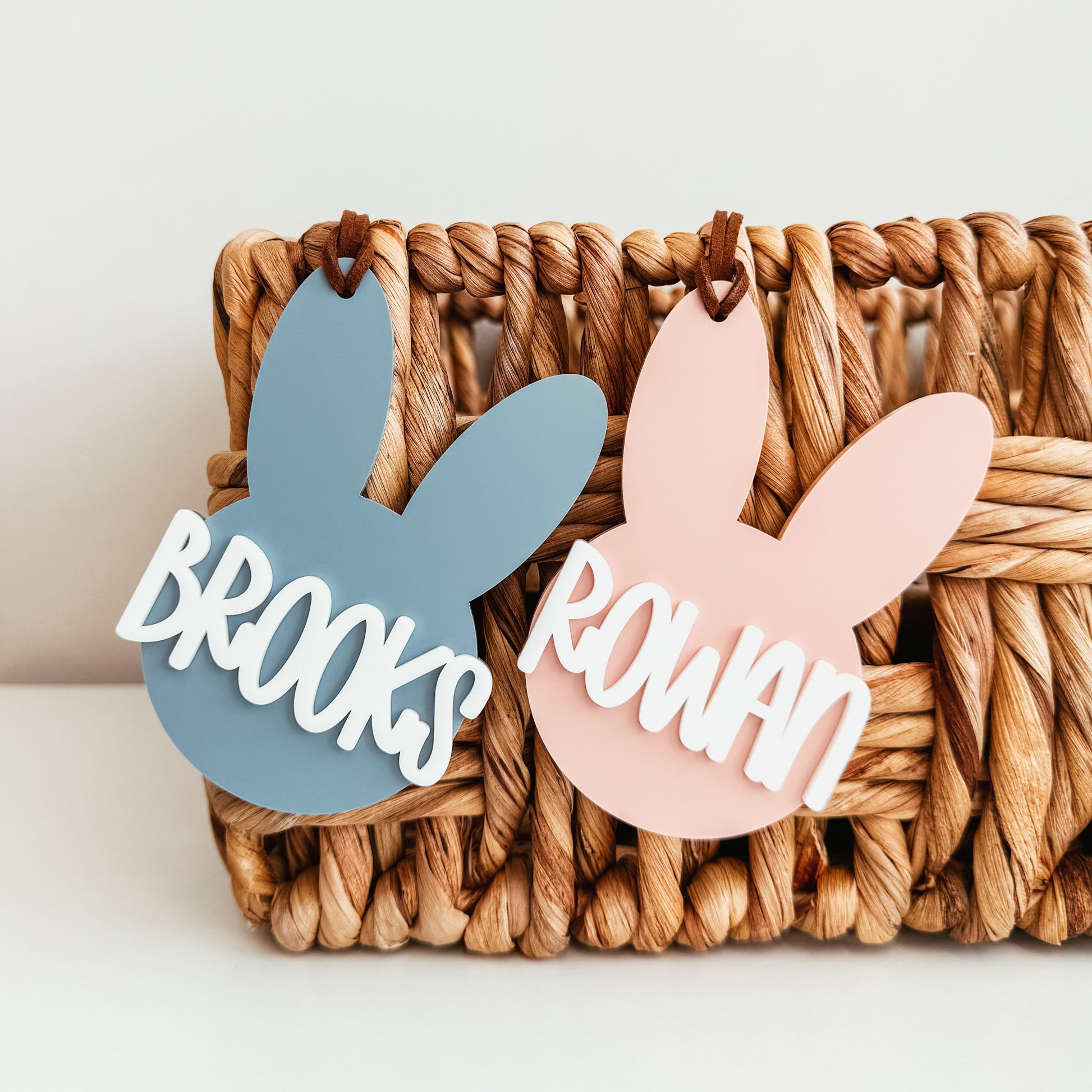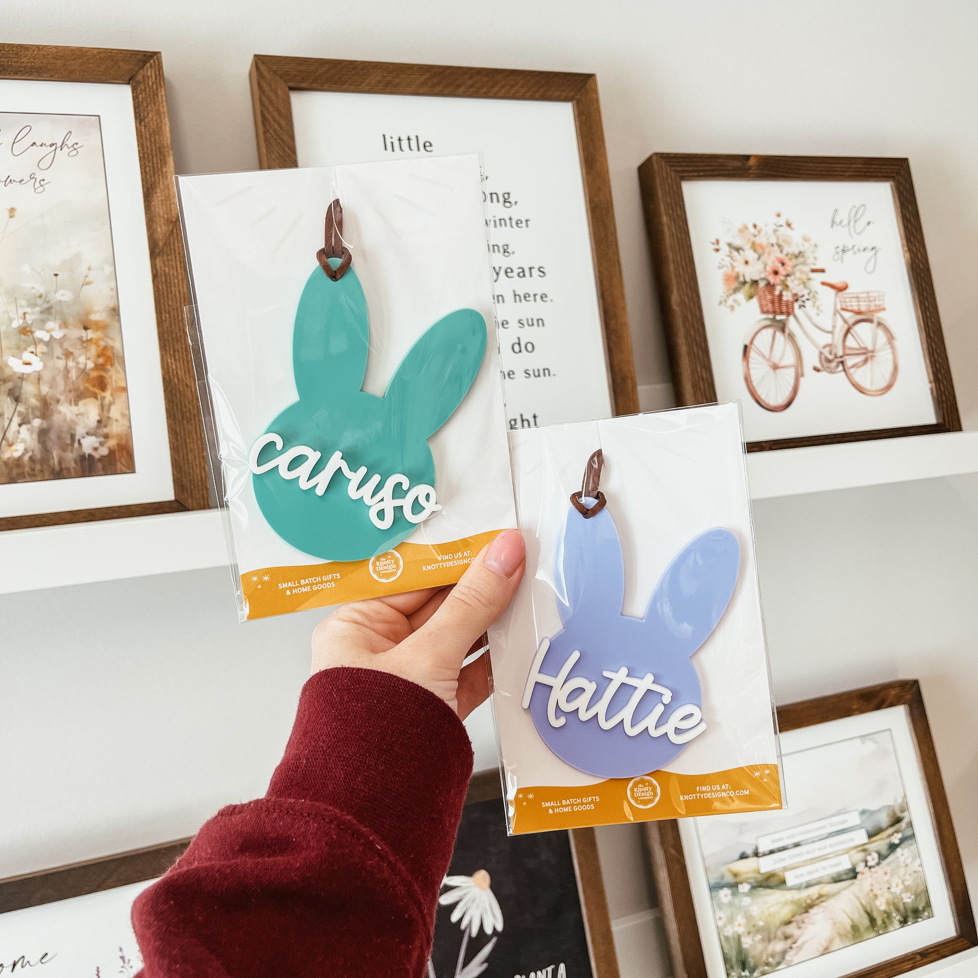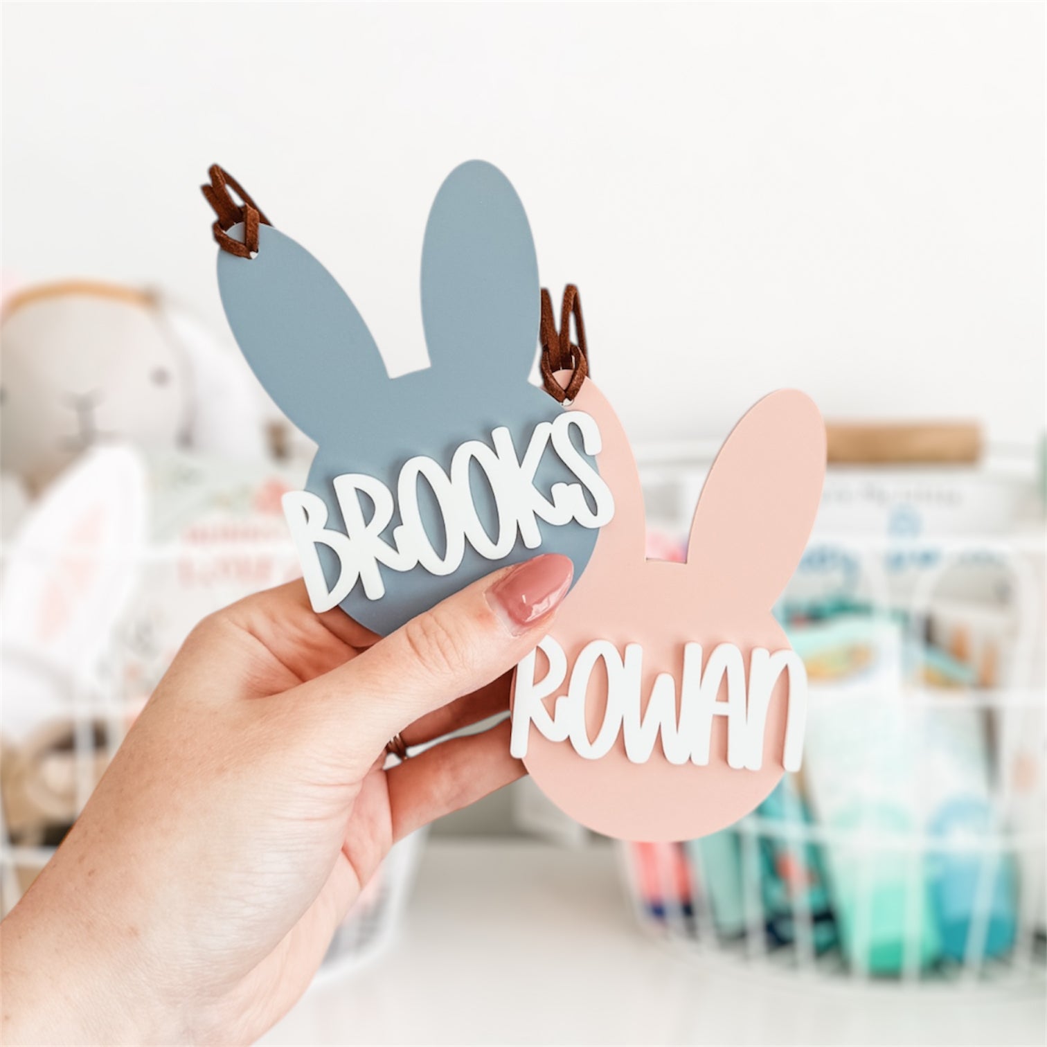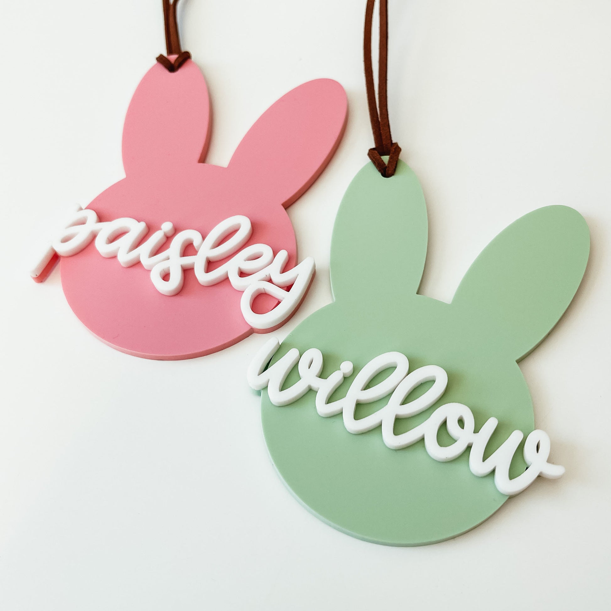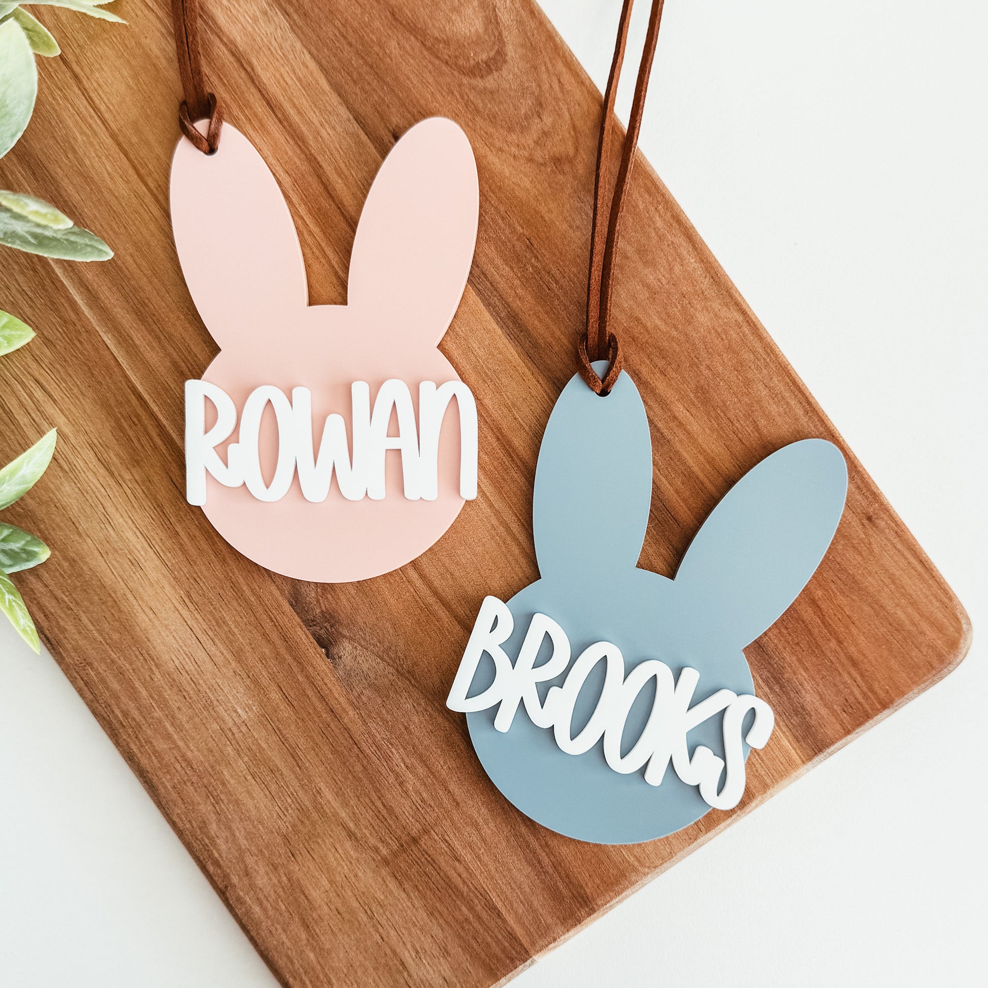 Each tag is laser cut from two layers of 1/8 thick acrylic and features a 3D name in white. Choose the colour for the bunny-shaped background!