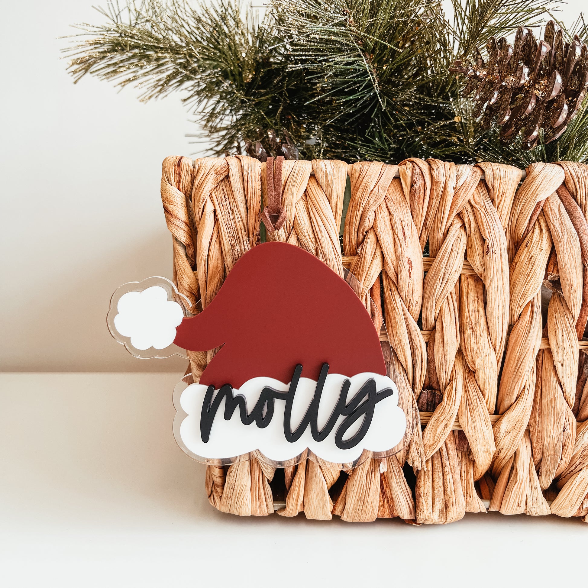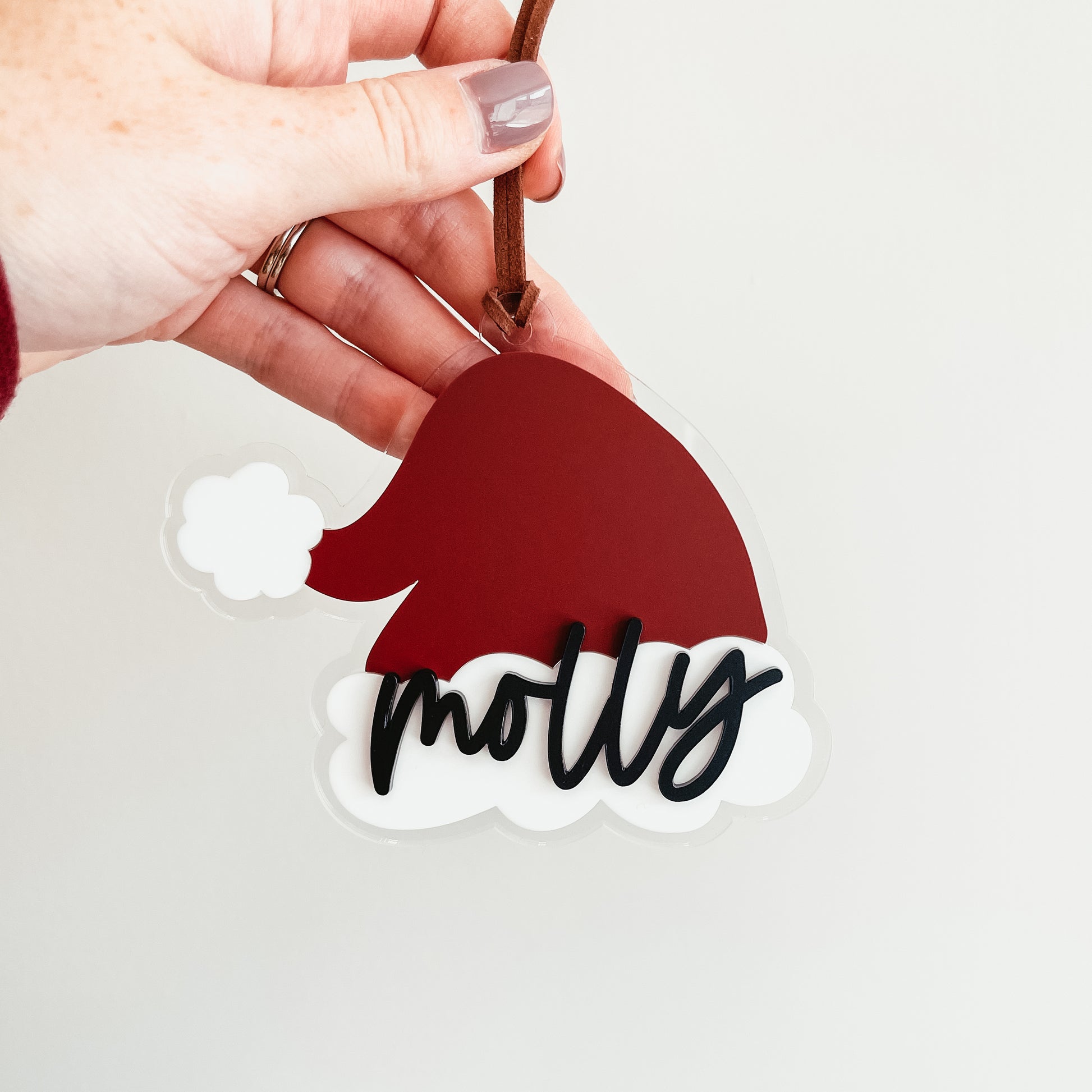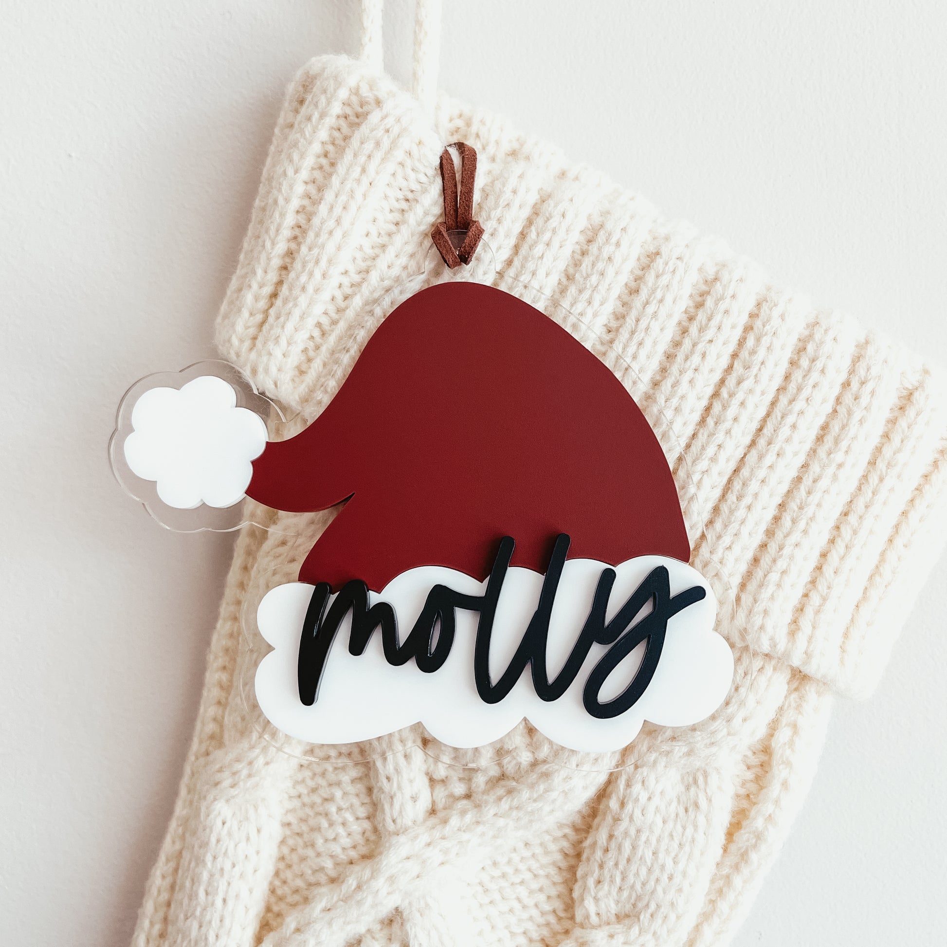 Each Santa hat stocking tag is made three layers of acrylic for a 3D effect. The back of the ornament is cut from clear acrylic, the second layer in white and your choice of colour, and the name in black acrylic.