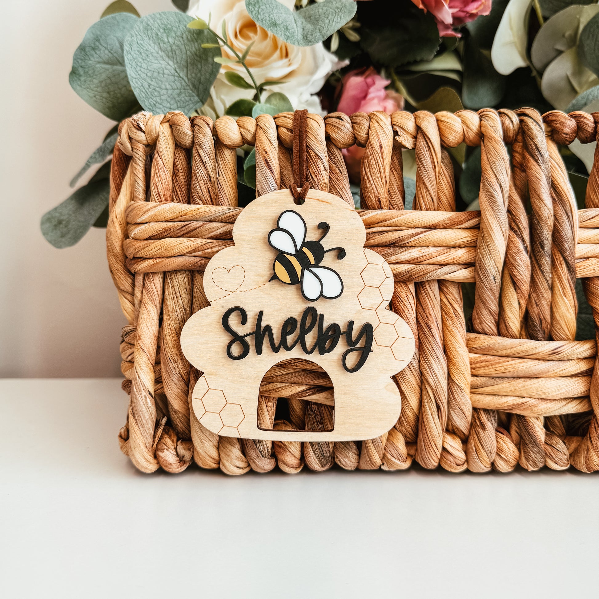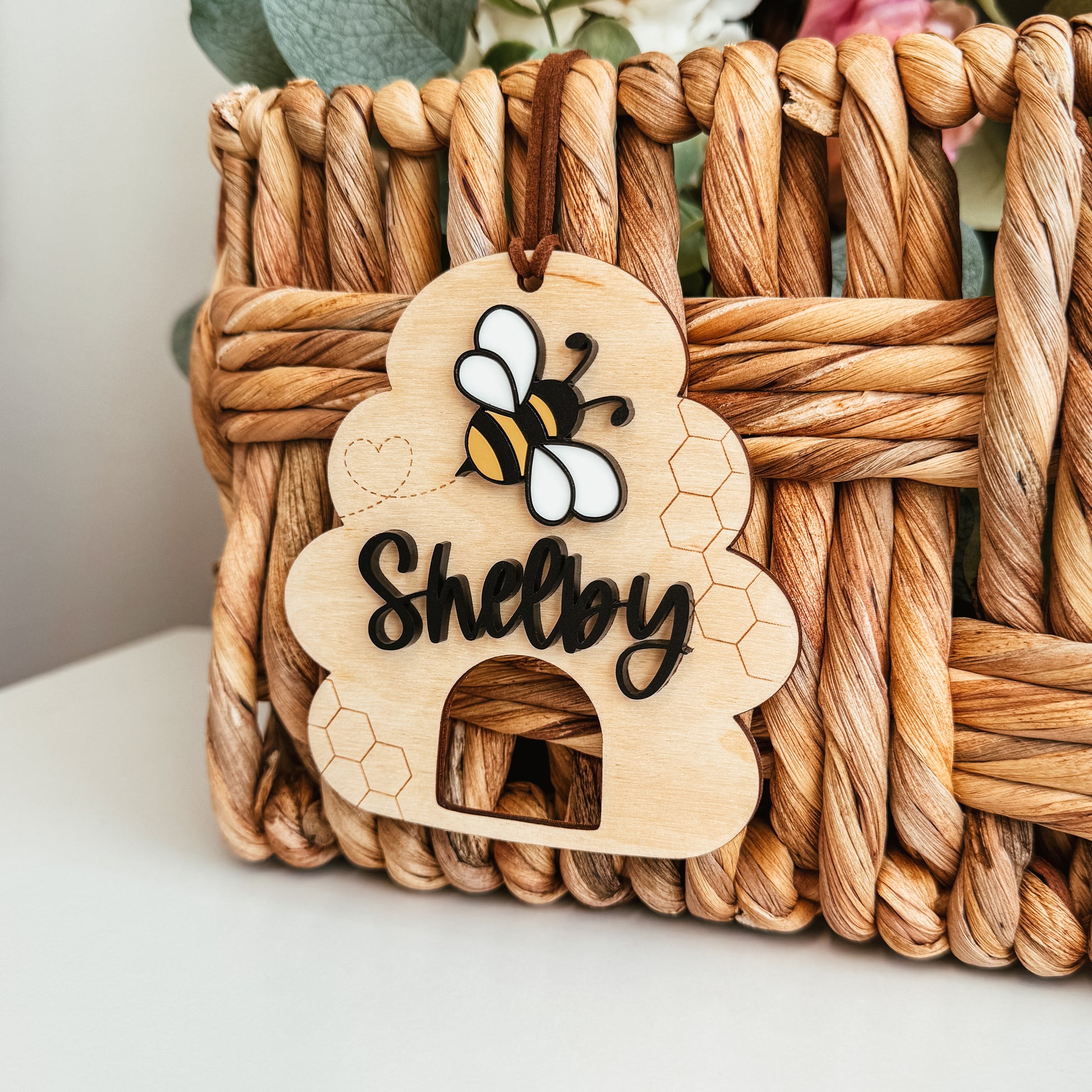 Each tag is cut from two layers of wood/acrylic. The base layer is wood, and the bee and name are cut from coloured acrylic. Choose the colour of the name!