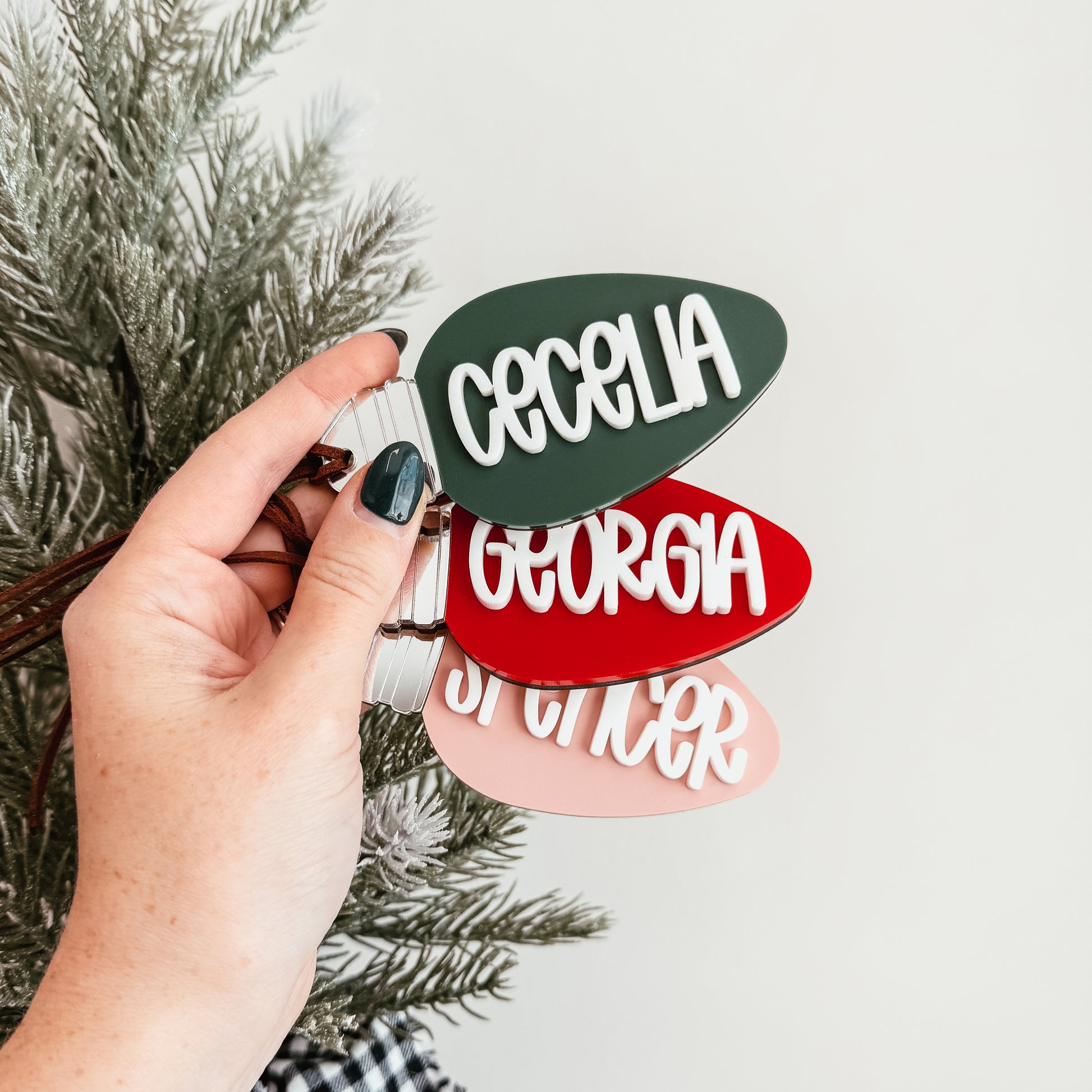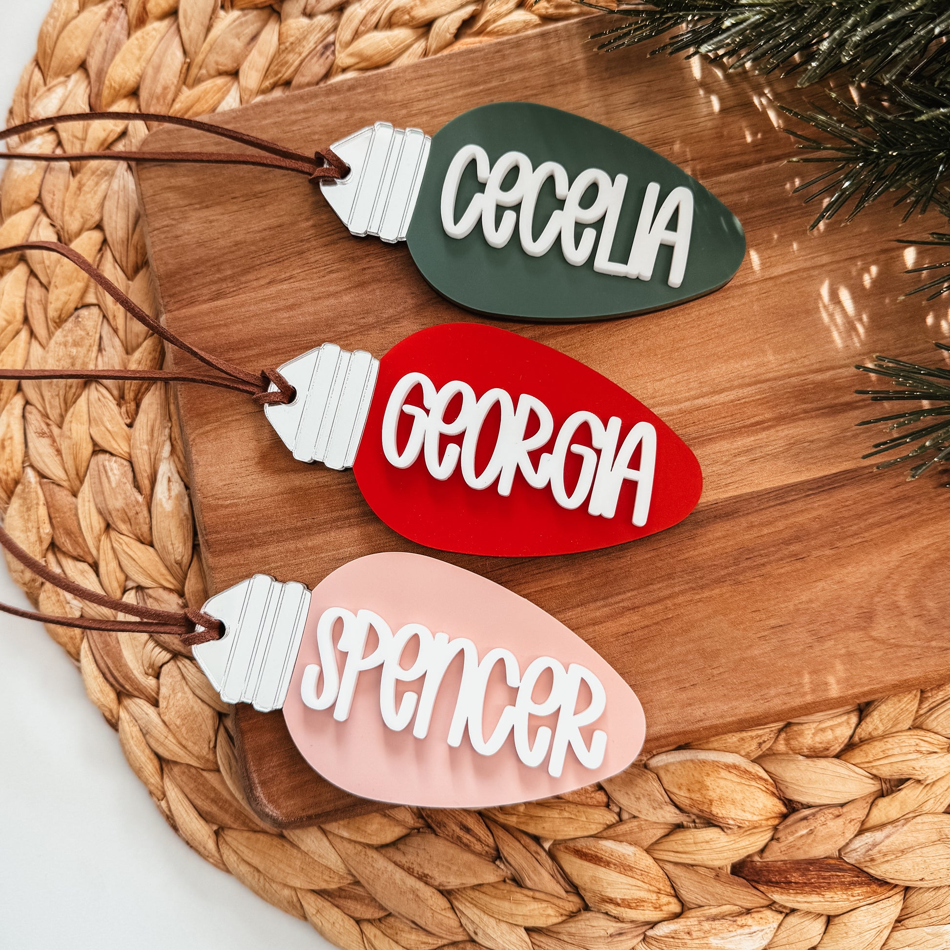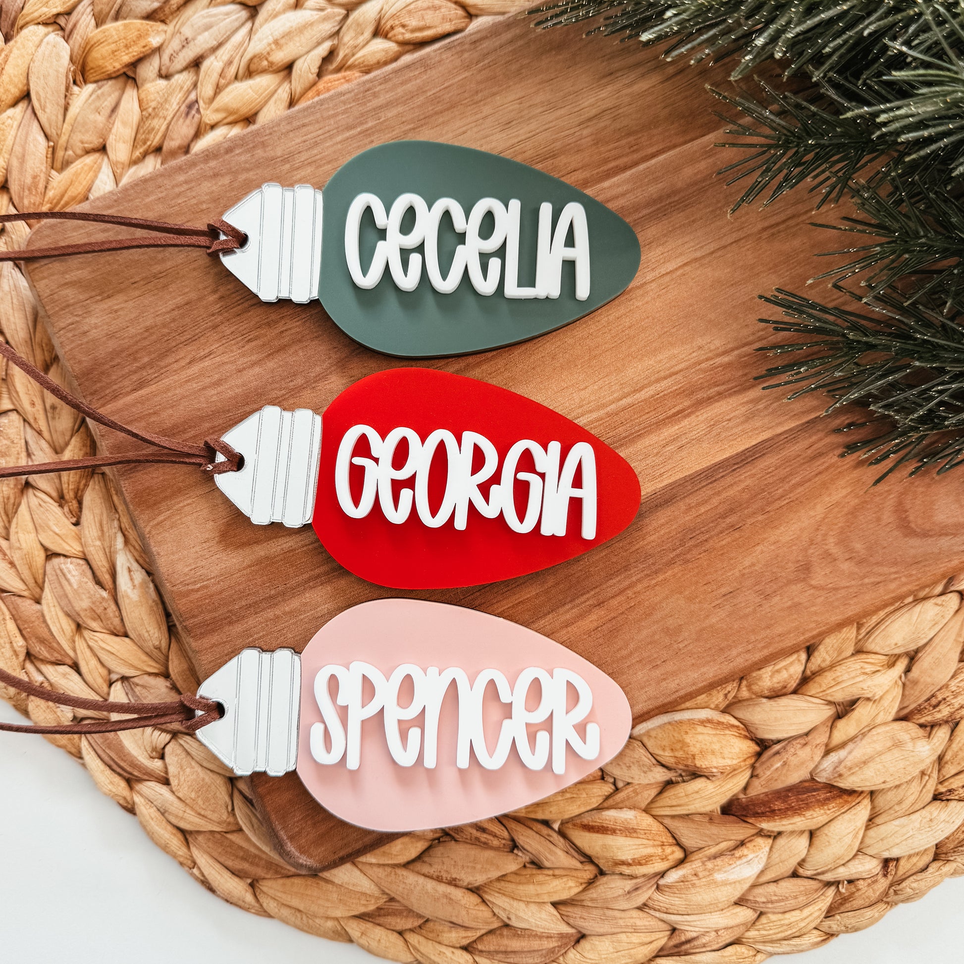 Each vintage light bulb stocking tag is made three layers of wood and acrylic for a 3D effect. The back of the ornament is cut from wood, the light bulb in the colour of your choice, and the name in white acrylic.