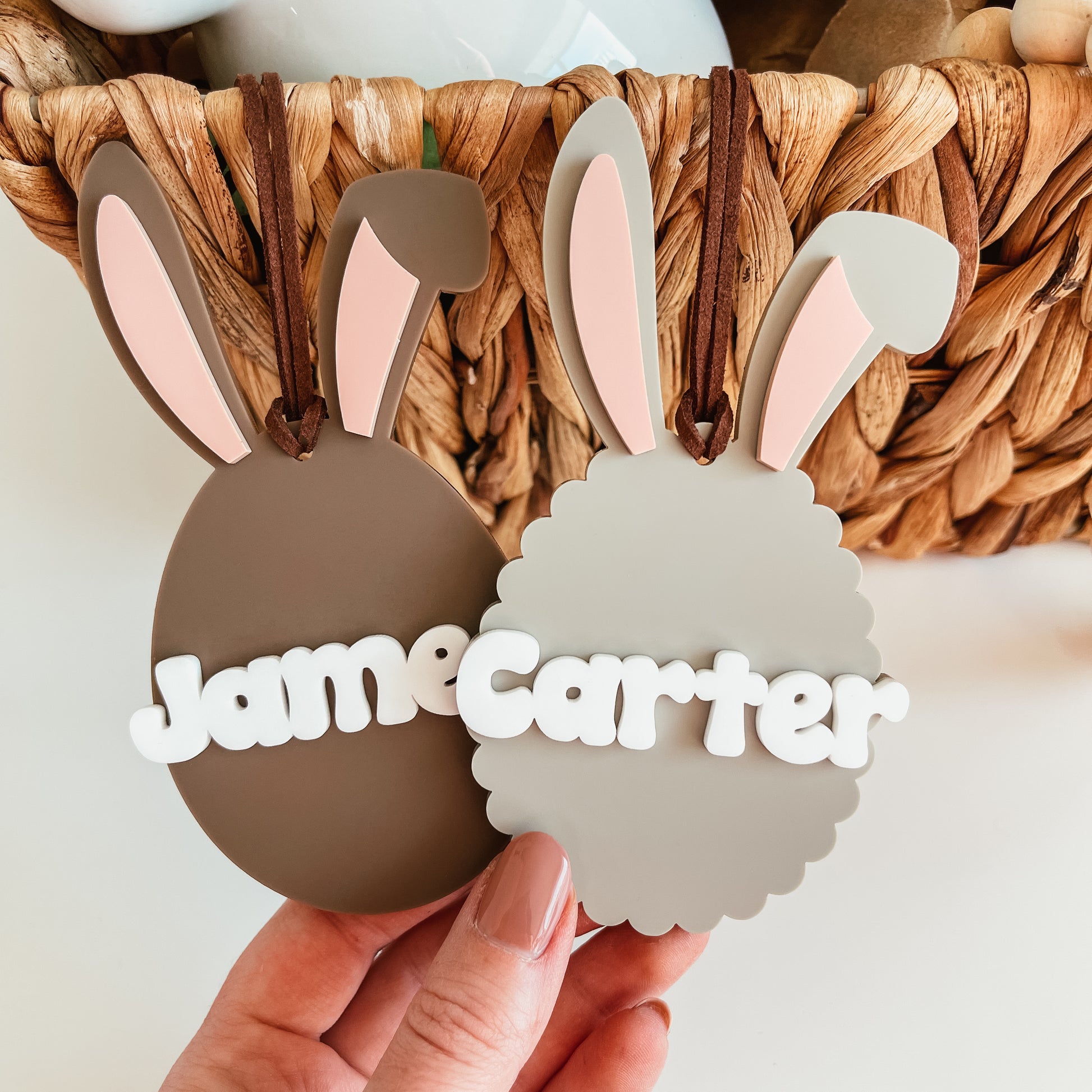 Choose from our large colour selection for the egg and ears and personalize with a name! Each Easter tag is constructed from laser-cut layers of coloured acrylic, with the ears and name in 3D.