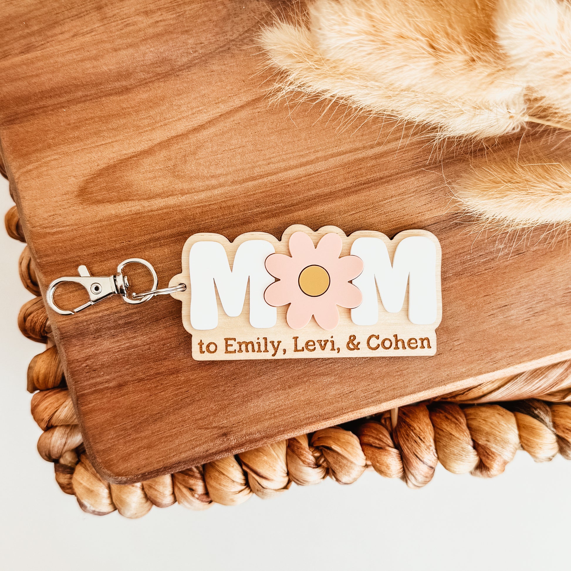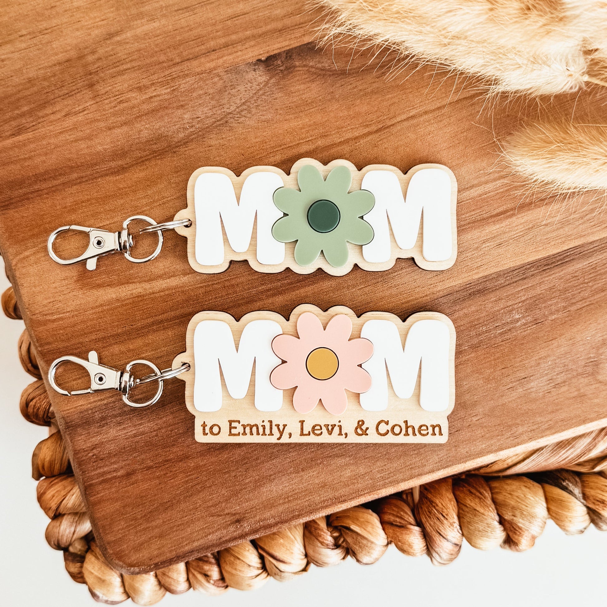 These wooden mom daisy keychains make the perfect gift for Mother's Day! Personalize with your choice of names and colours for the 3D flower.