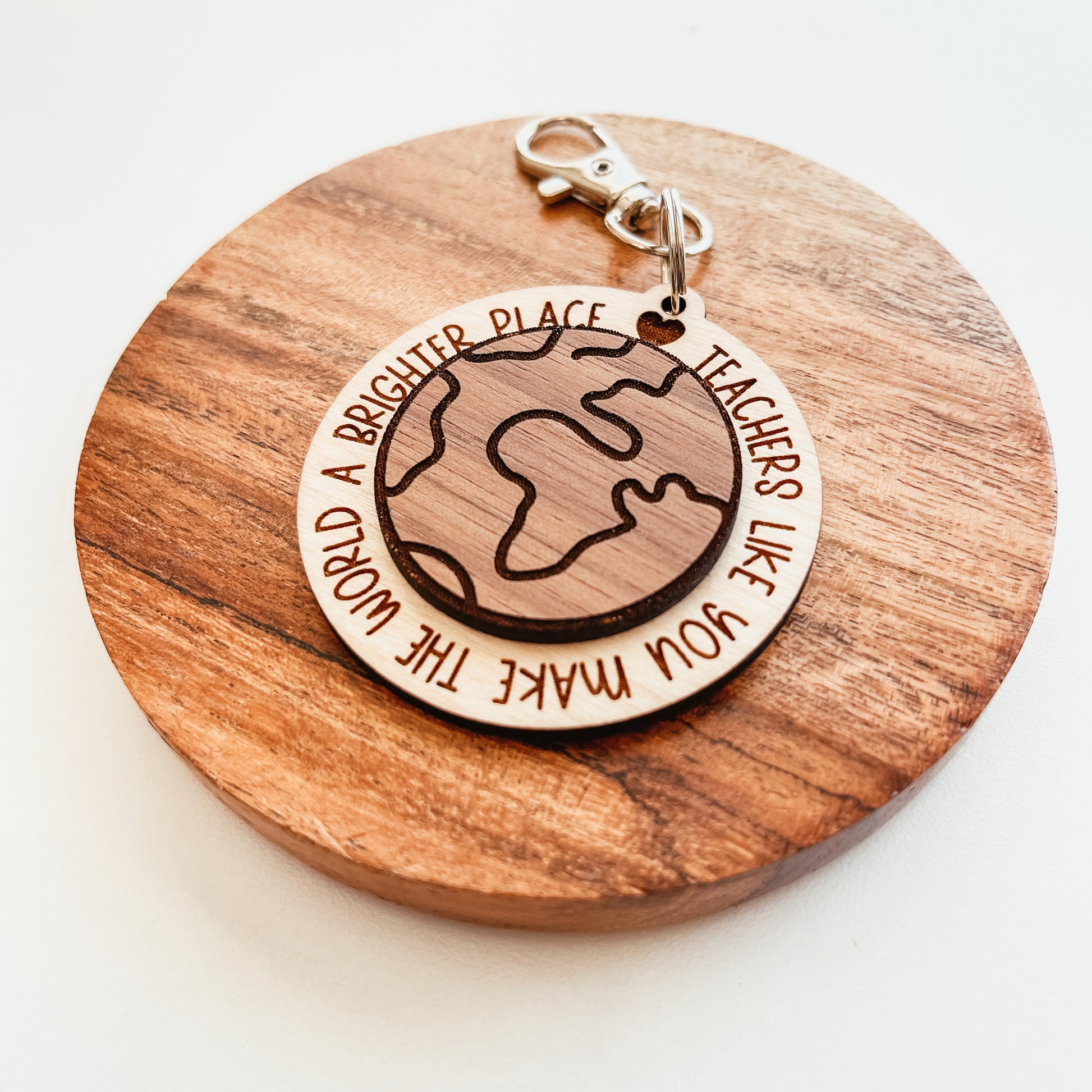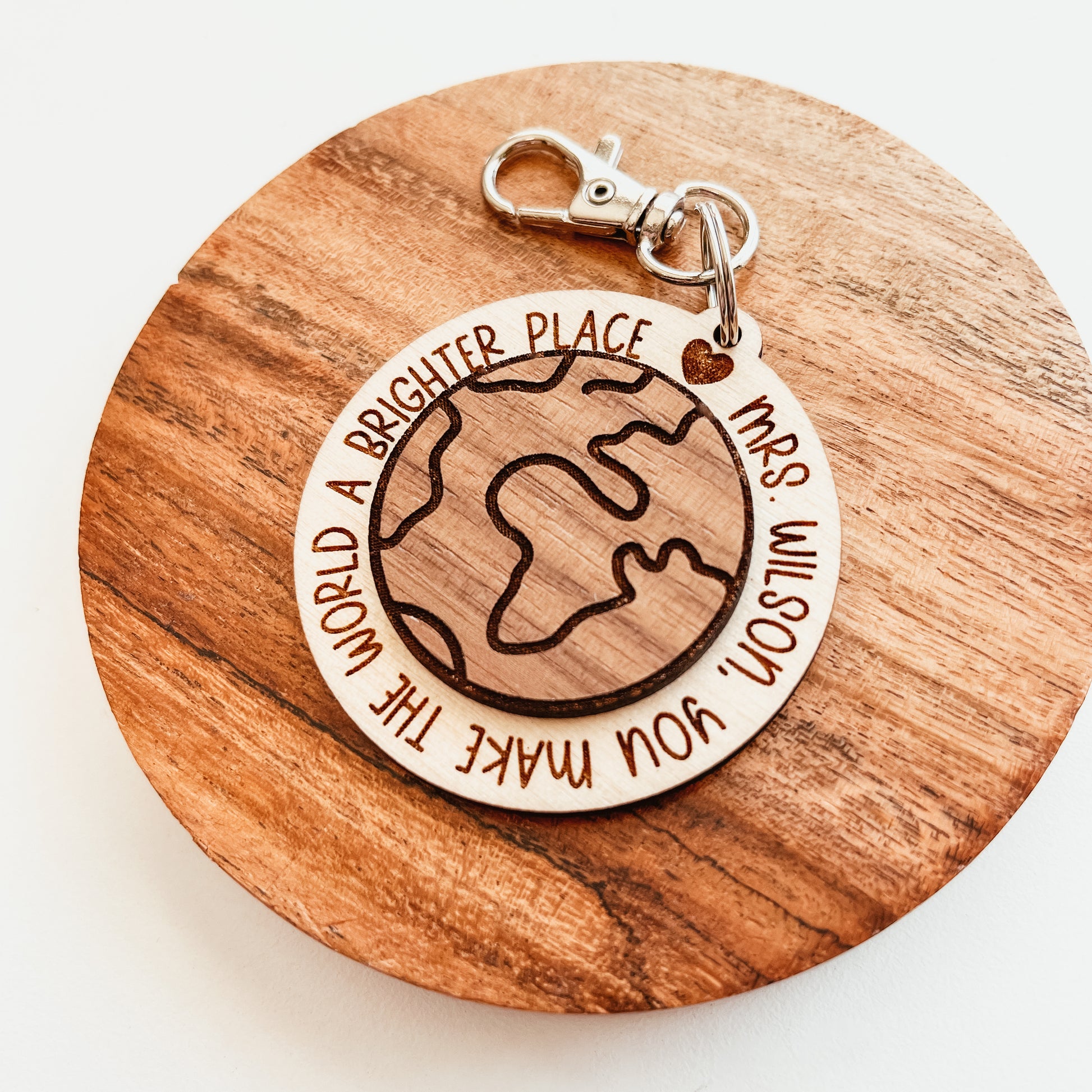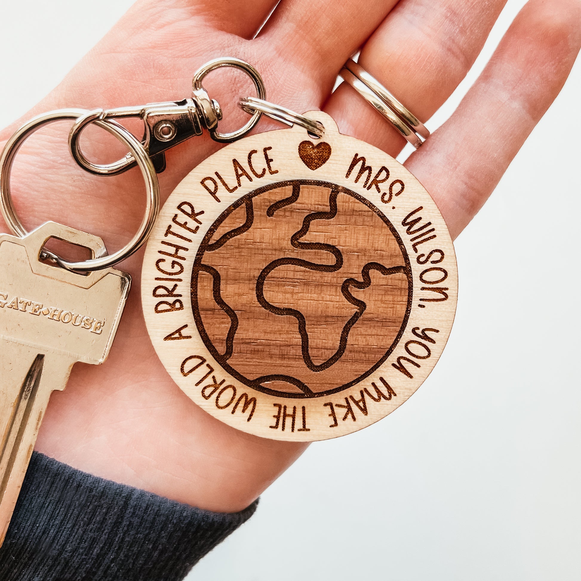Our wooden keychains are cut from premium-grade, laminated maple wood and engraved with our studio laser for a permanent finish that will not fade or rub off. Finished with a 3D walnut earth.