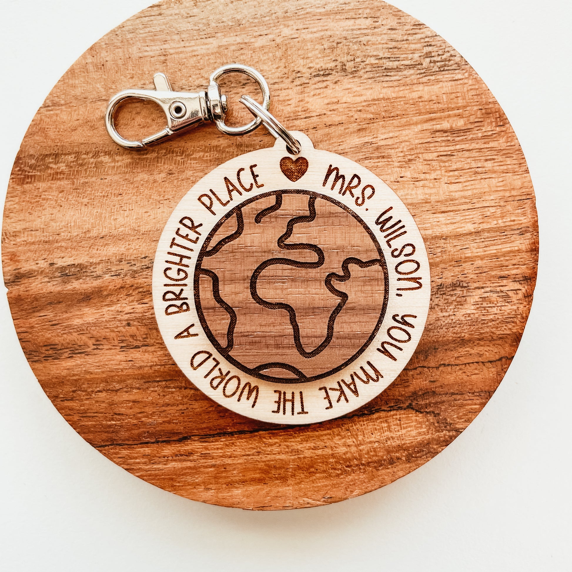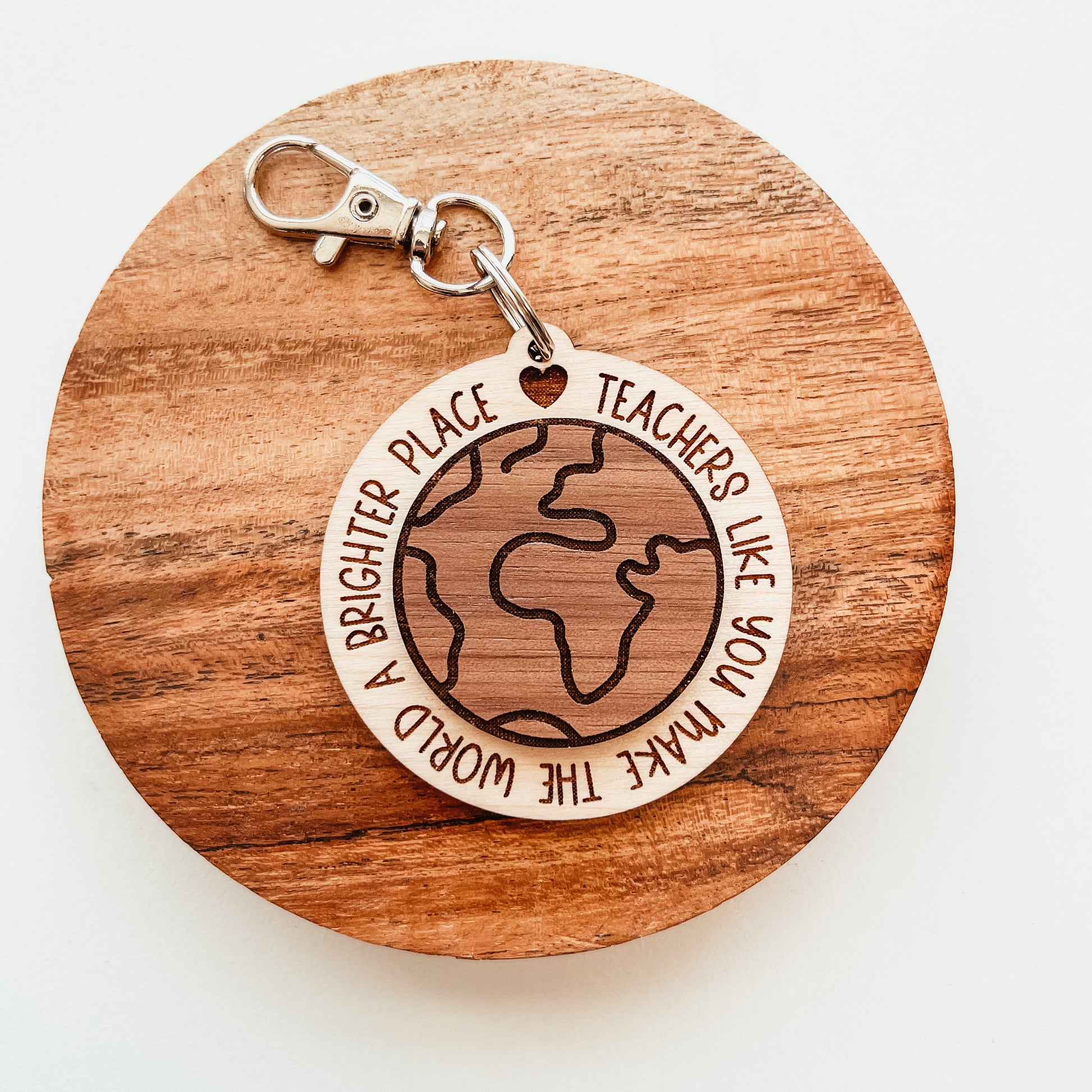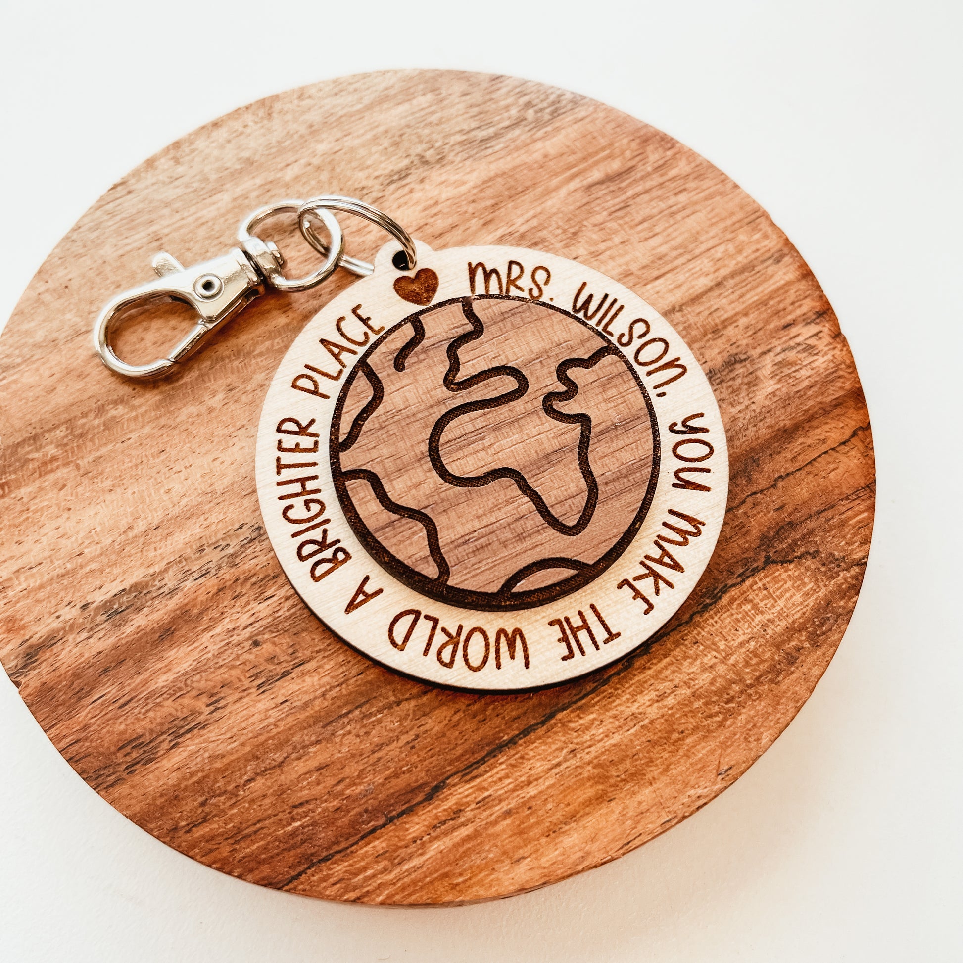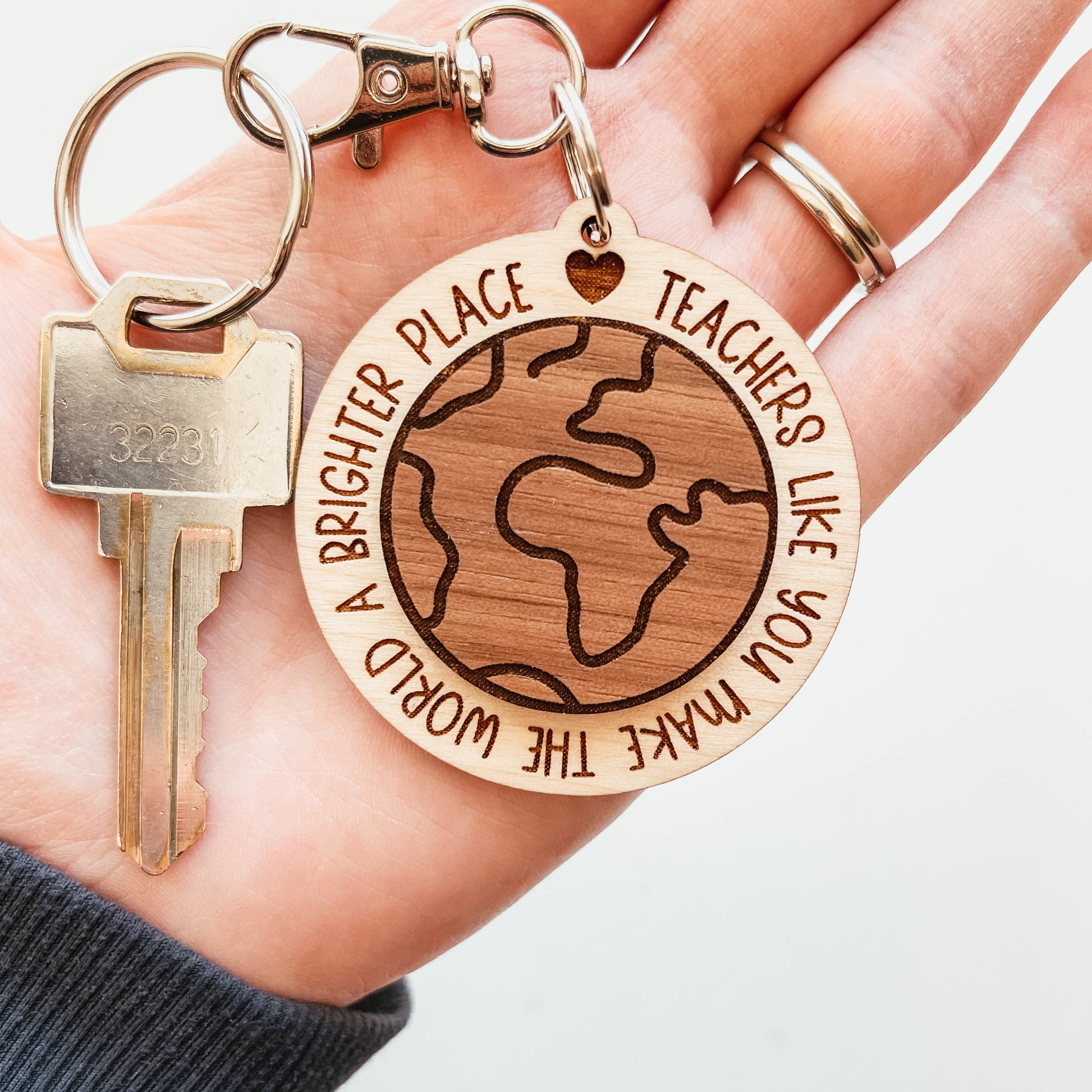 Our wooden keychains are cut from premium-grade, laminated maple wood and engraved with our studio laser for a permanent finish that will not fade or rub off. Finished with a 3D walnut earth.