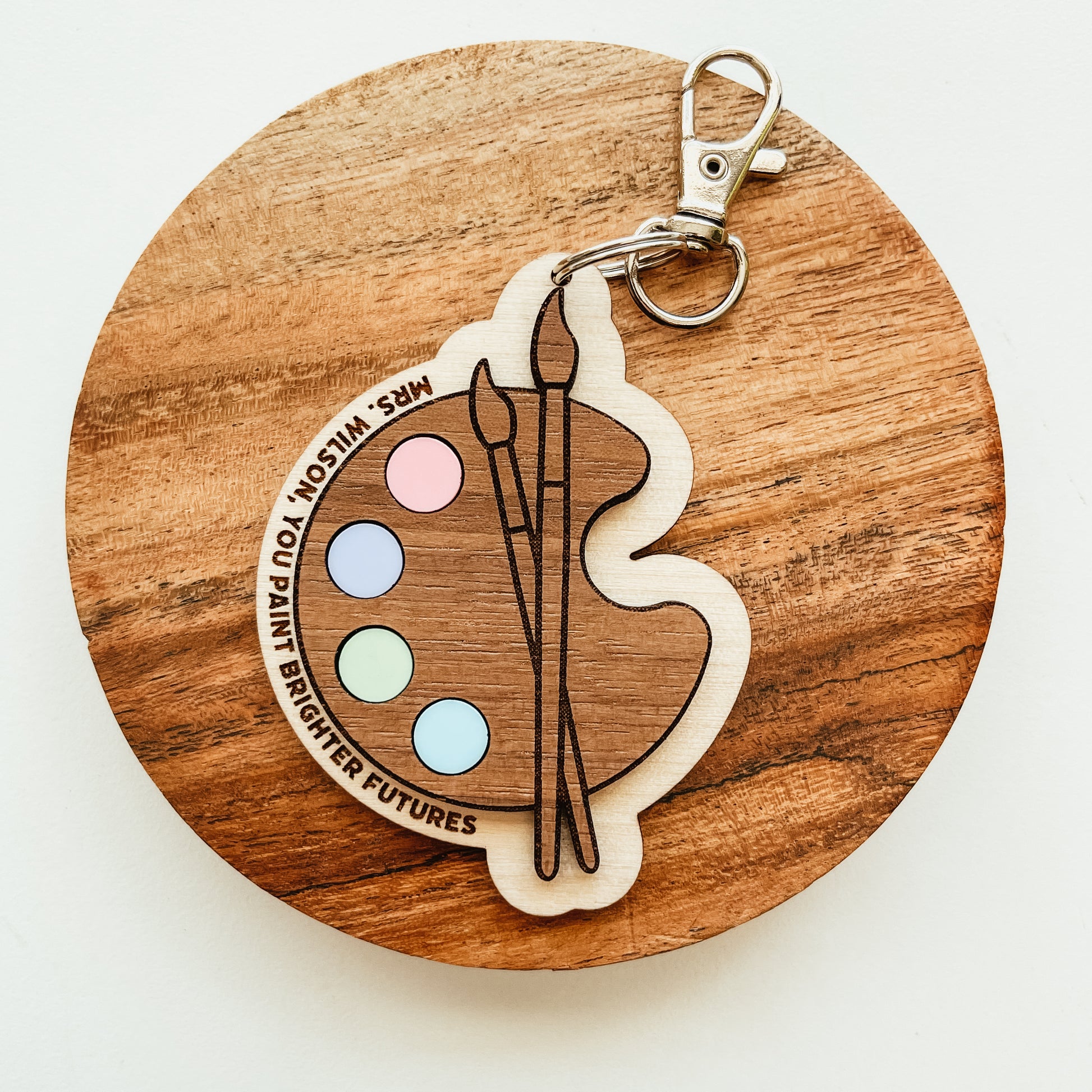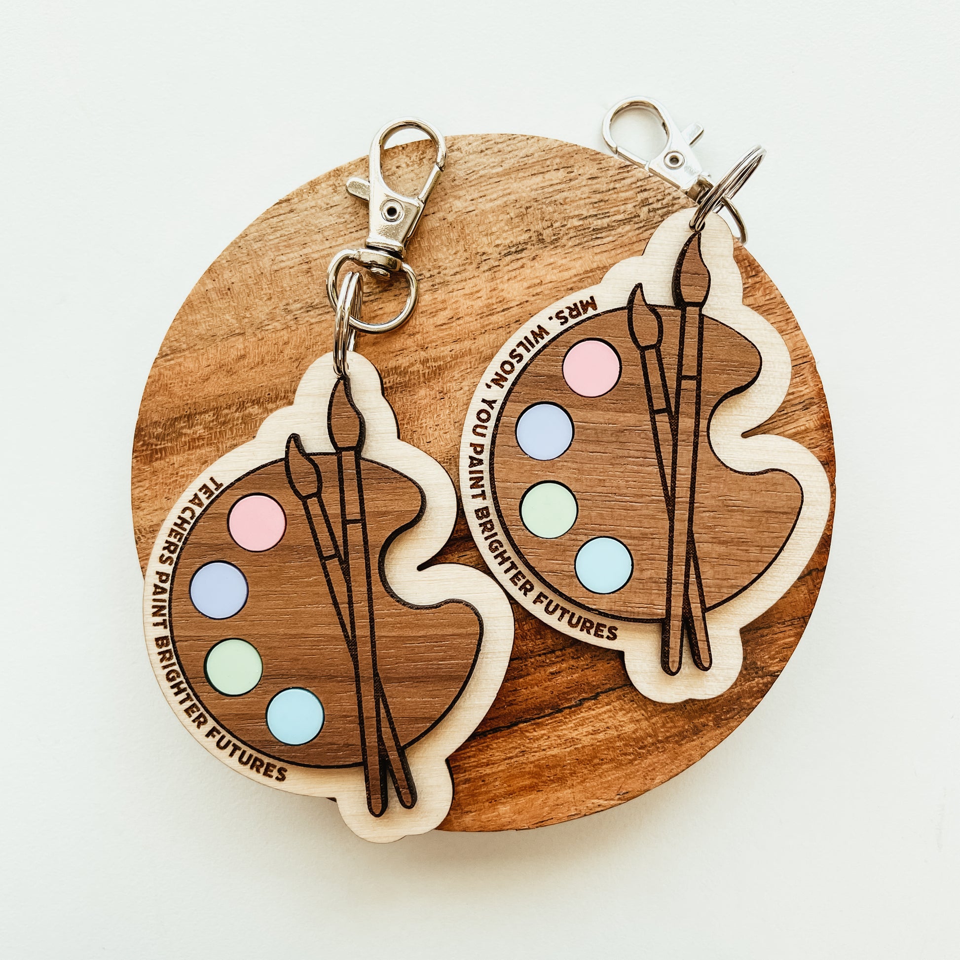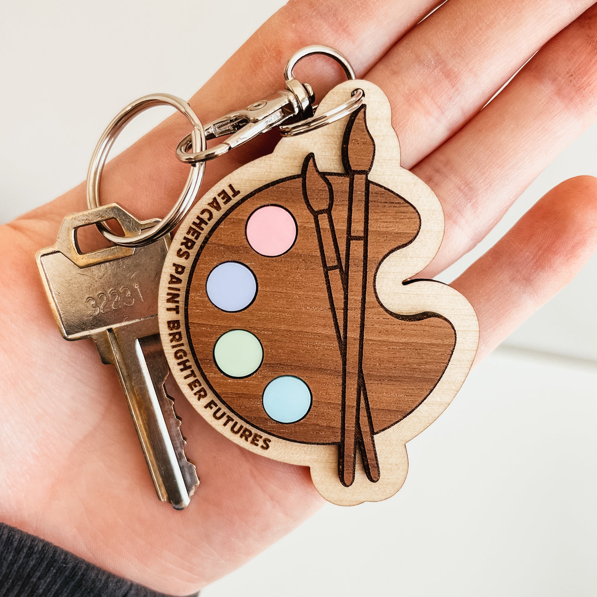 Our wooden keychains are cut from premium-grade, laminated maple wood and engraved with our studio laser for a permanent finish that will not fade or rub off. Finished with a 3D walnut paint palette and acrylic paint inserts.