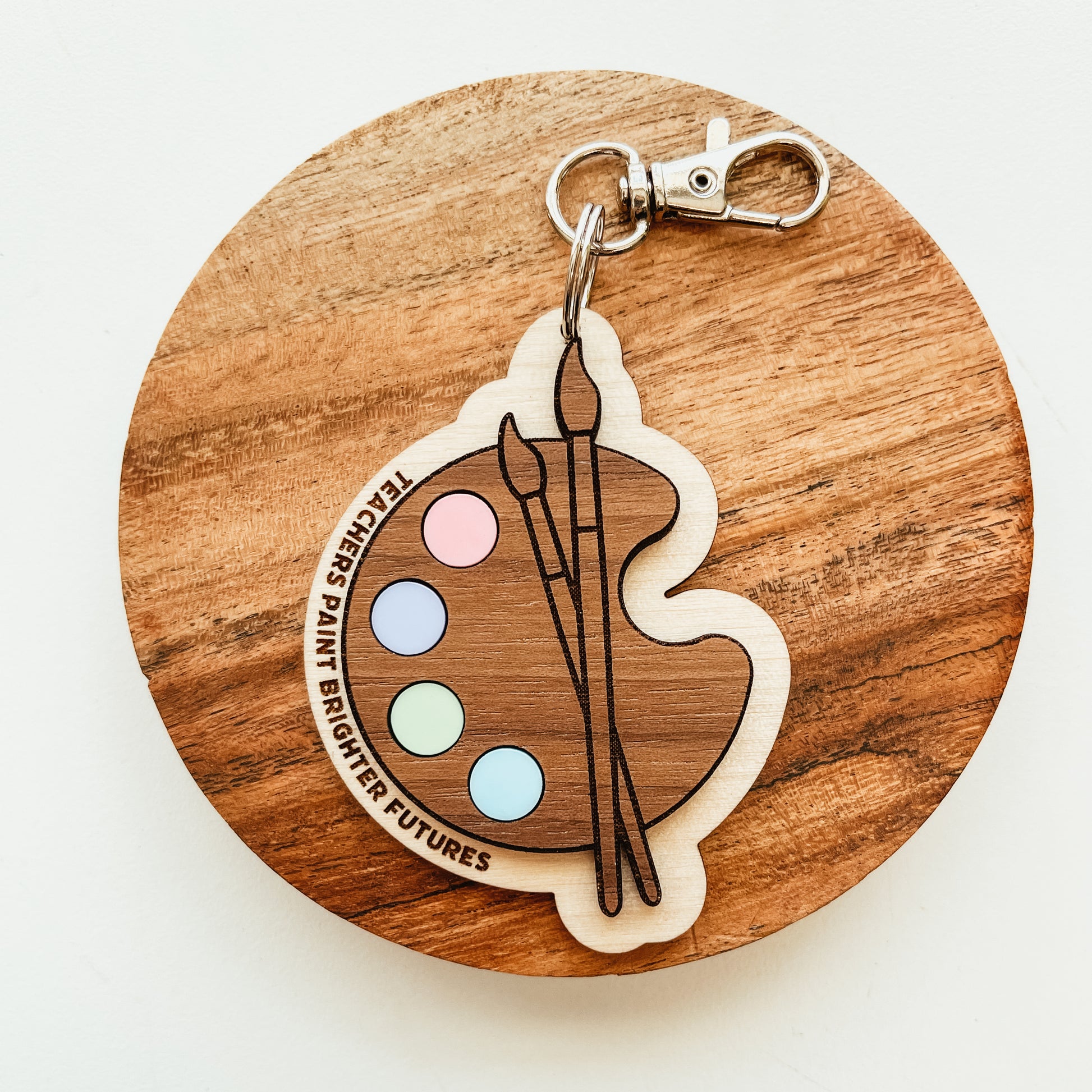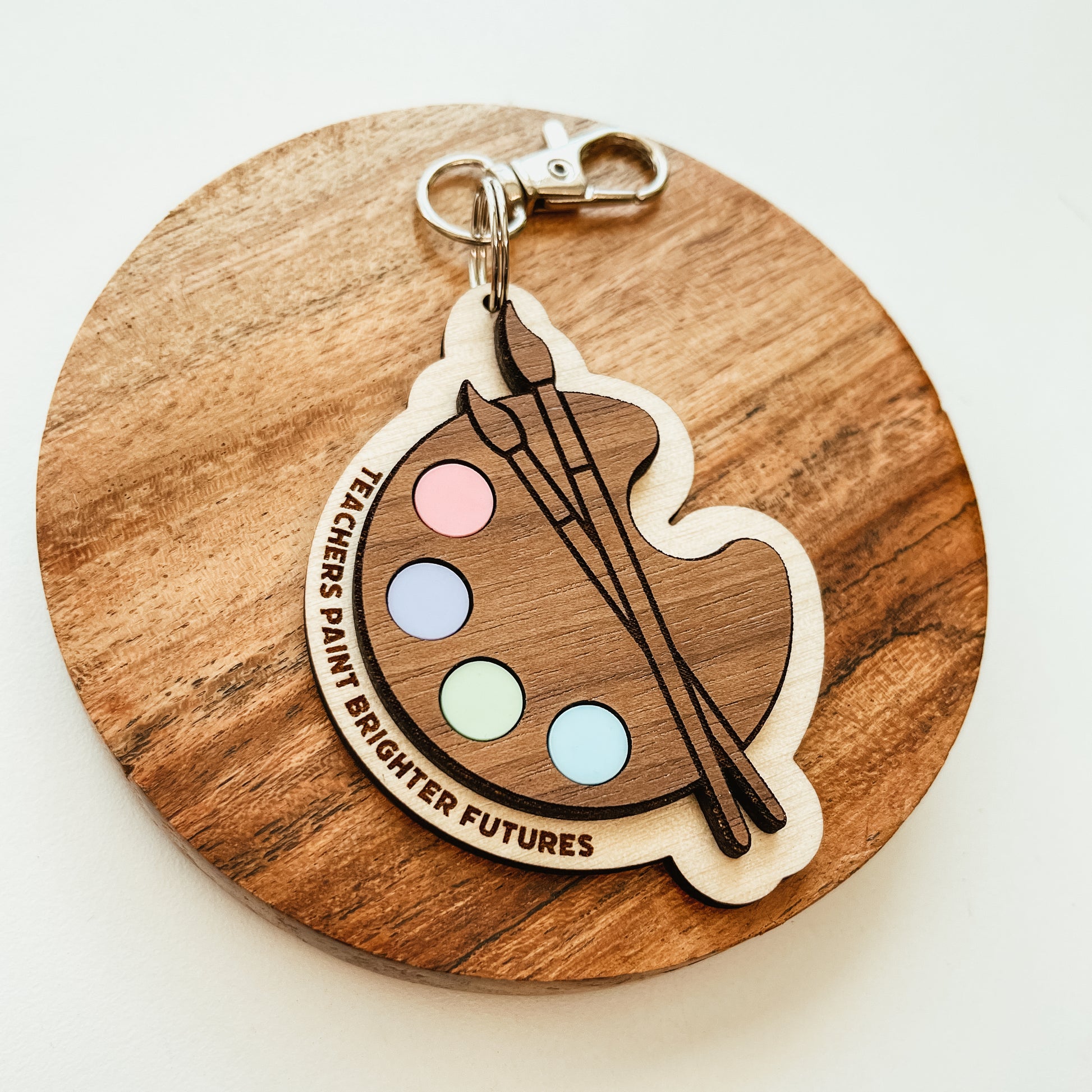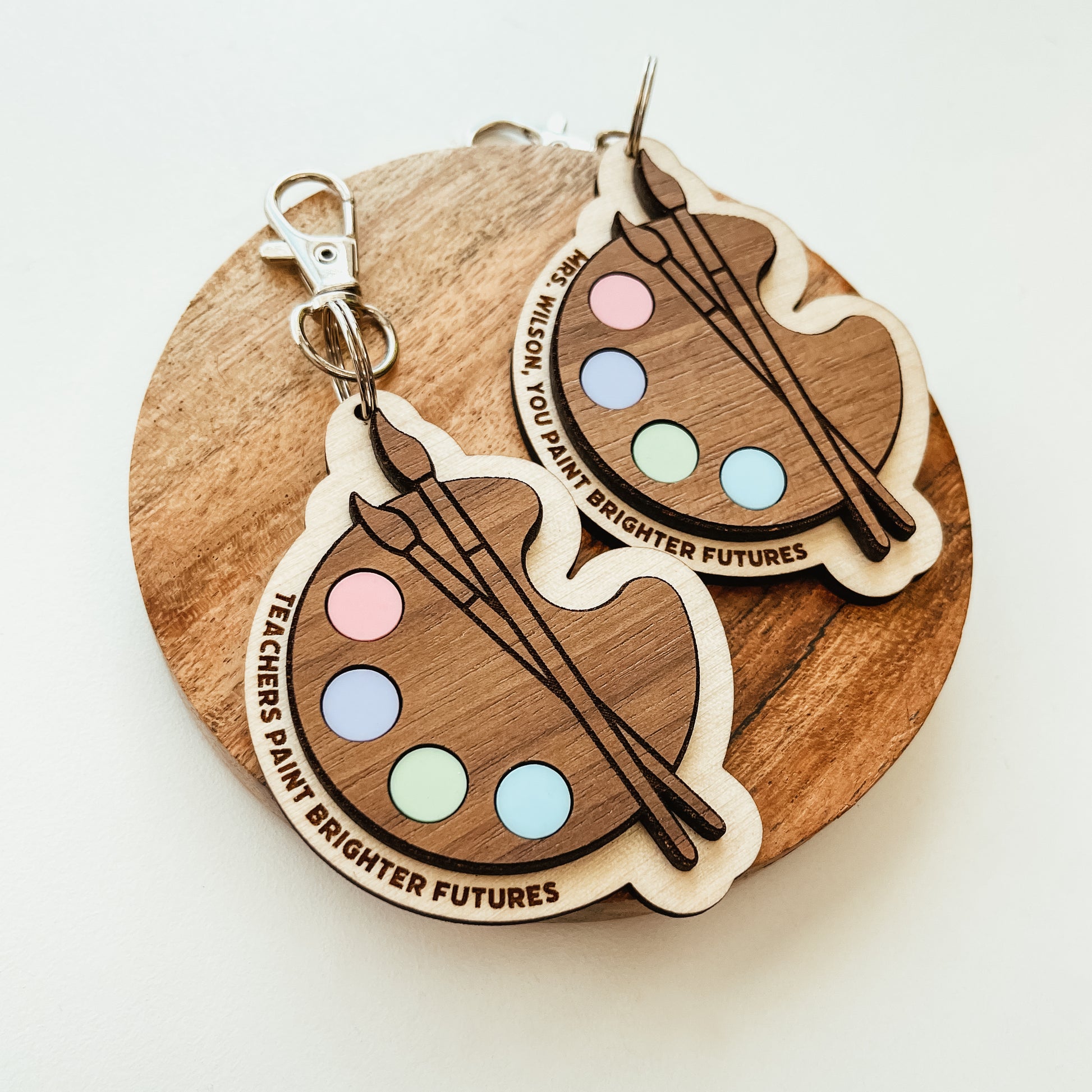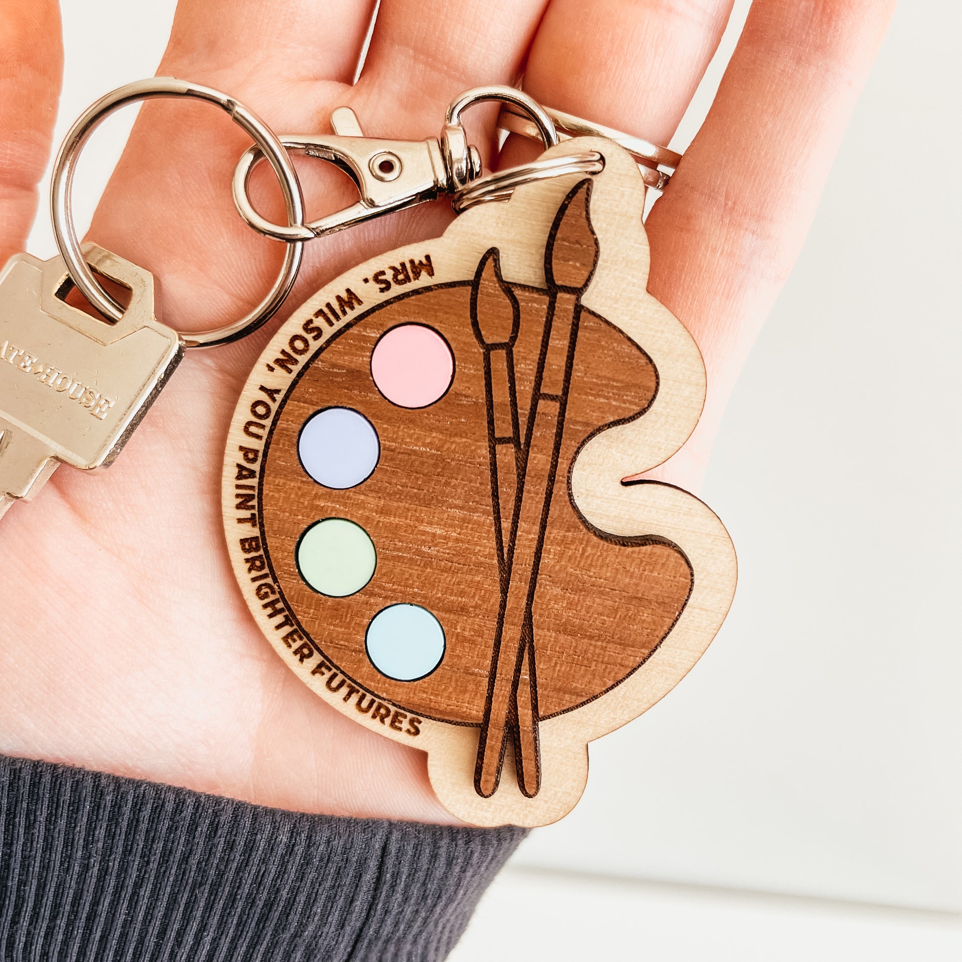 Our wooden keychains are cut from premium-grade, laminated maple wood and engraved with our studio laser for a permanent finish that will not fade or rub off. Finished with a 3D walnut paint palette and acrylic paint inserts.