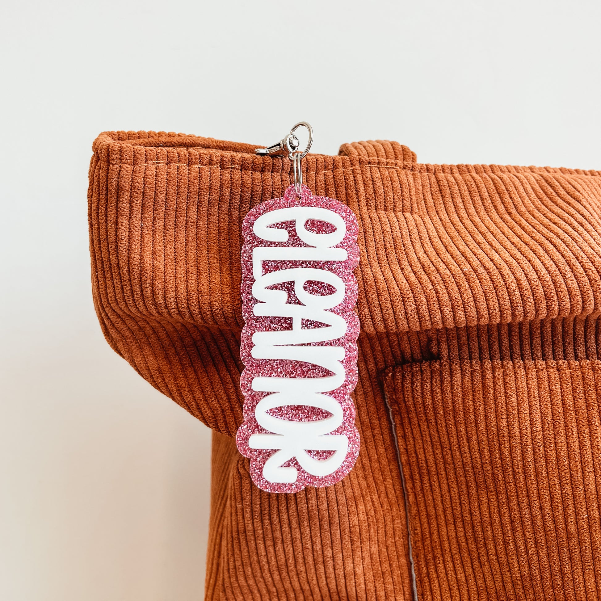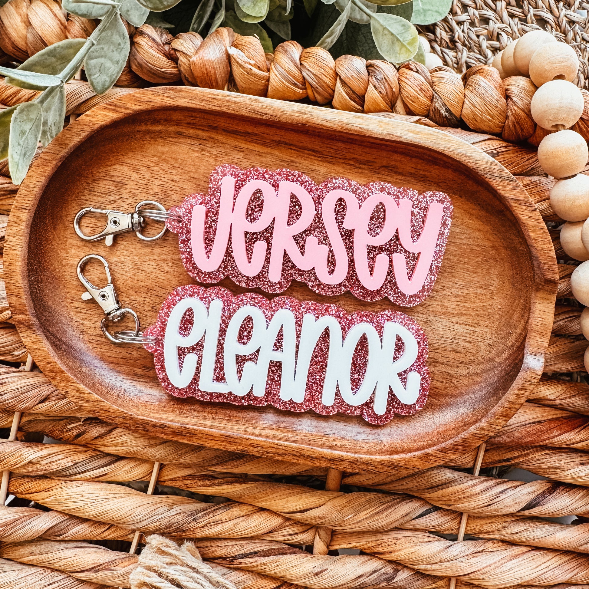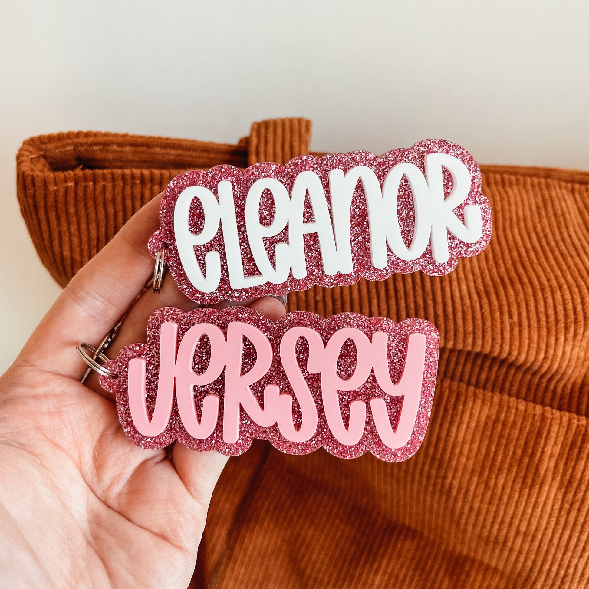 Each keychain is made of two layers of acrylic. The name is white or pink and the base is pink glitter acrylic.