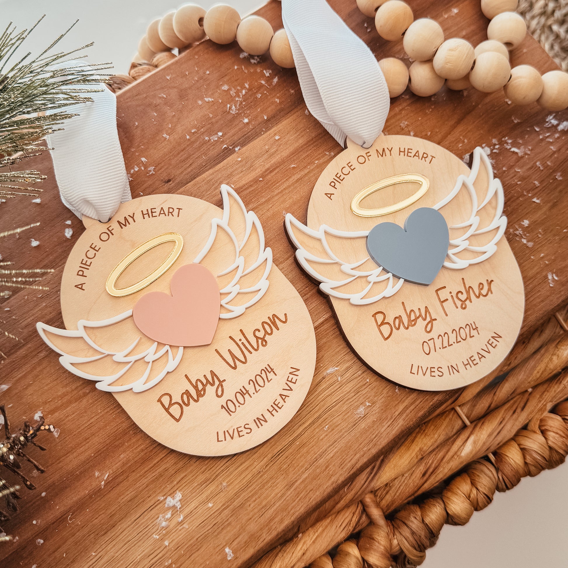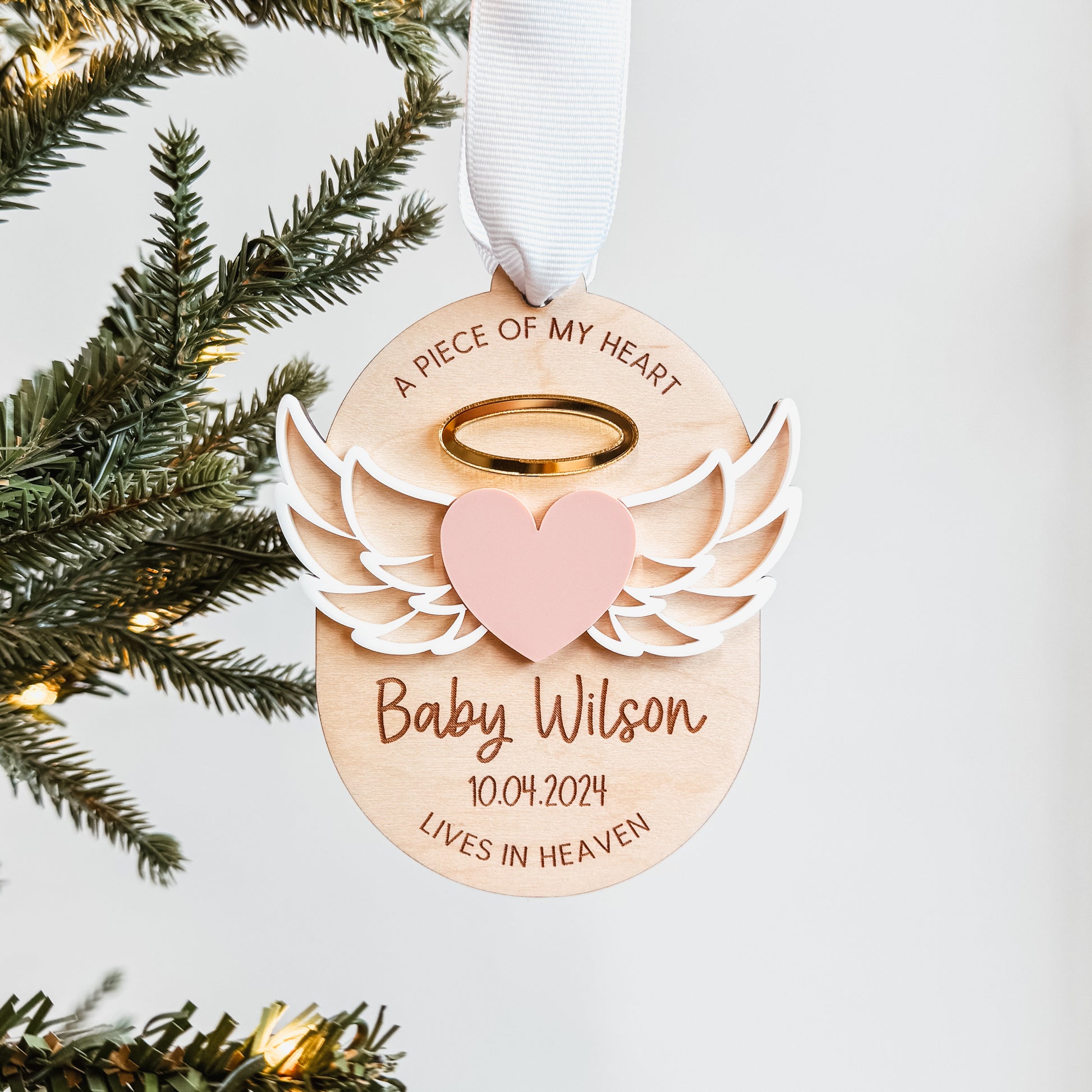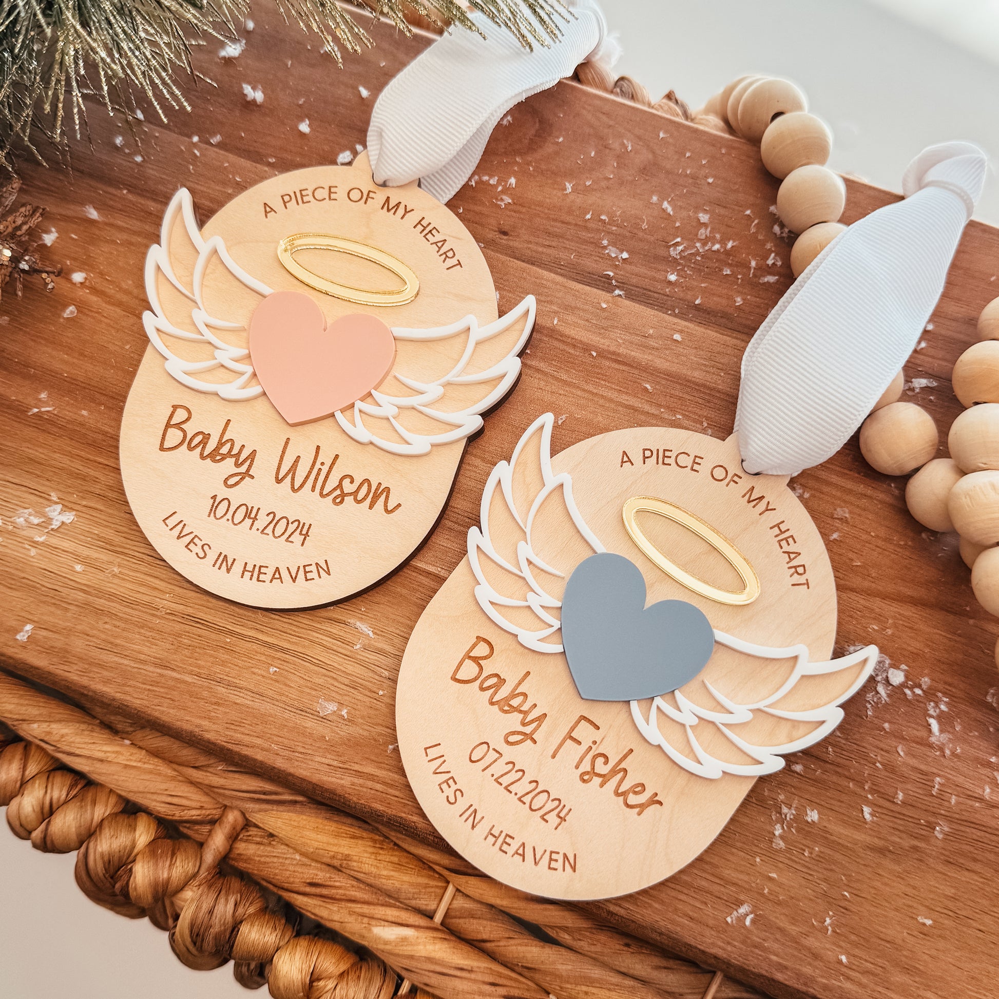 Each memorial Christmas ornament is laser cut and engraved using natural maple wood. They are completed with a 3D pair of angel wings, heart in your choice of colour, mirror acrylic halo, and a white ribbon for hanging.