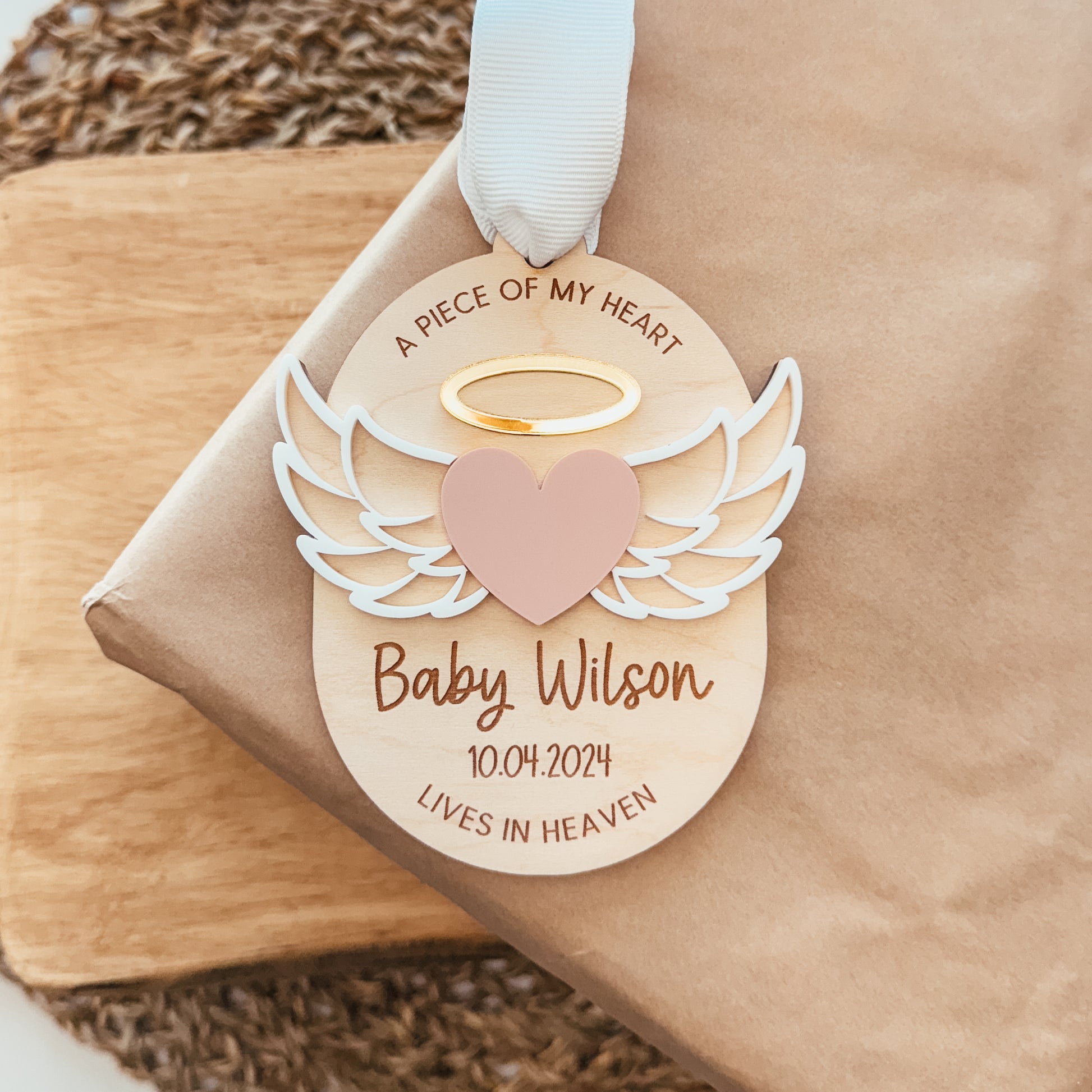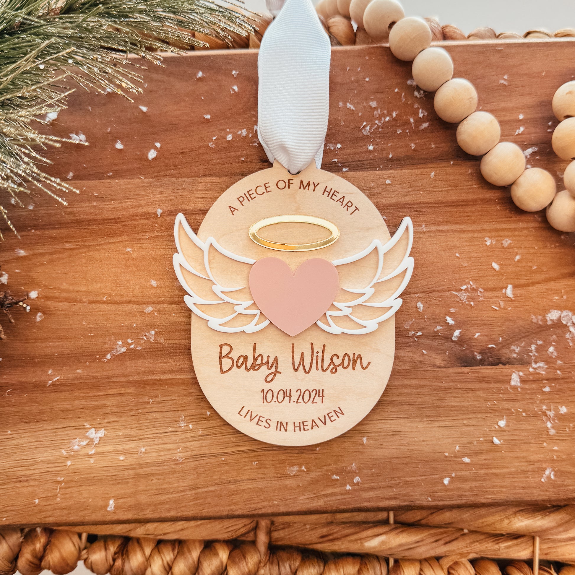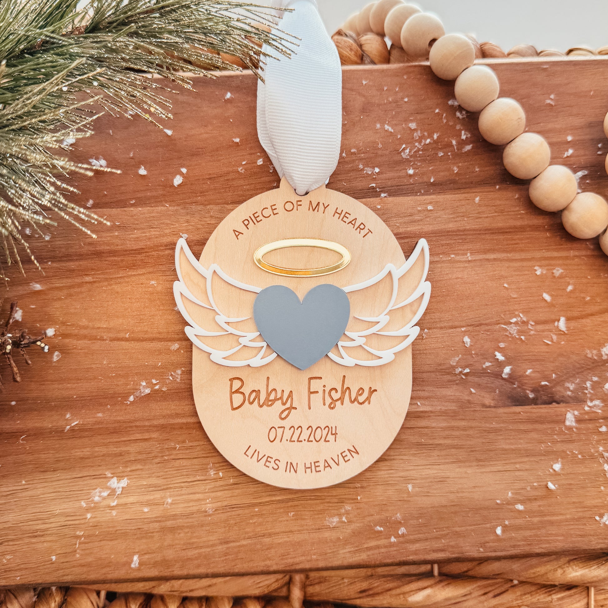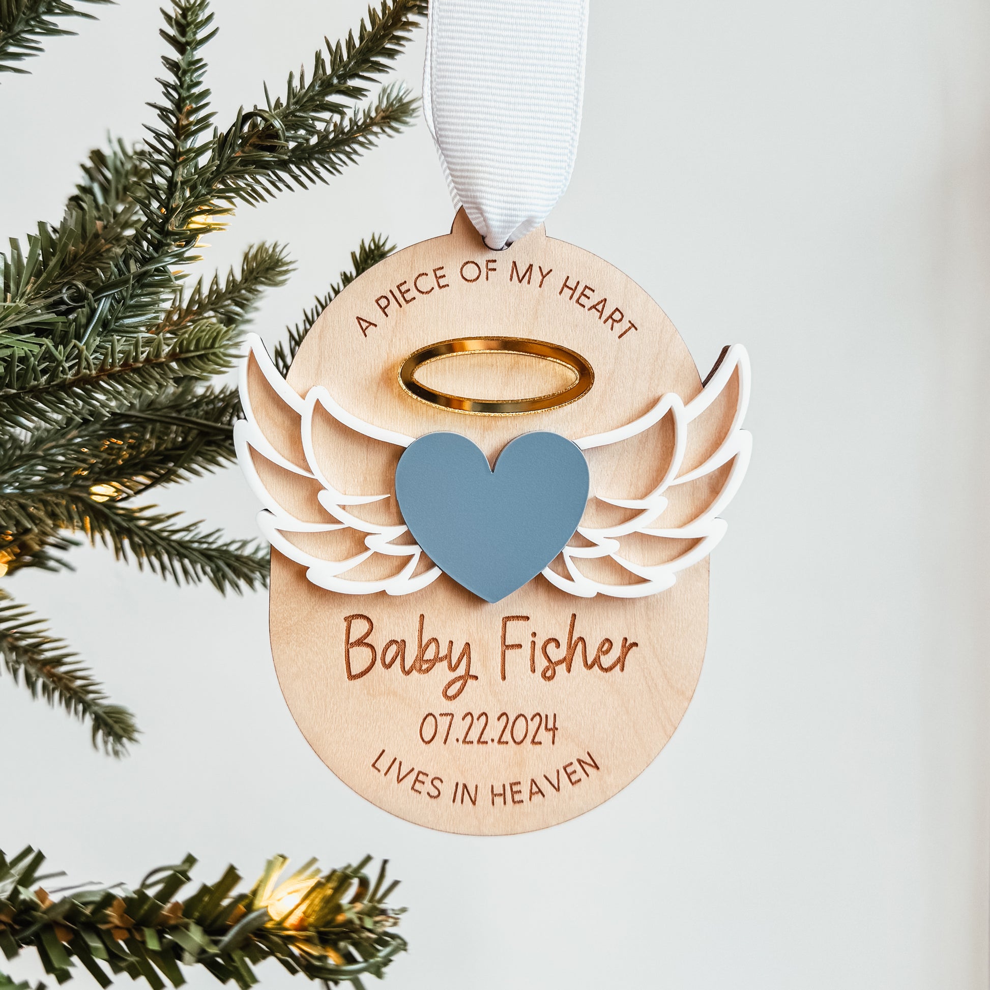 Each memorial Christmas ornament is laser cut and engraved using natural maple wood. They are completed with a 3D pair of angel wings, heart in your choice of colour, mirror acrylic halo, and a white ribbon for hanging.