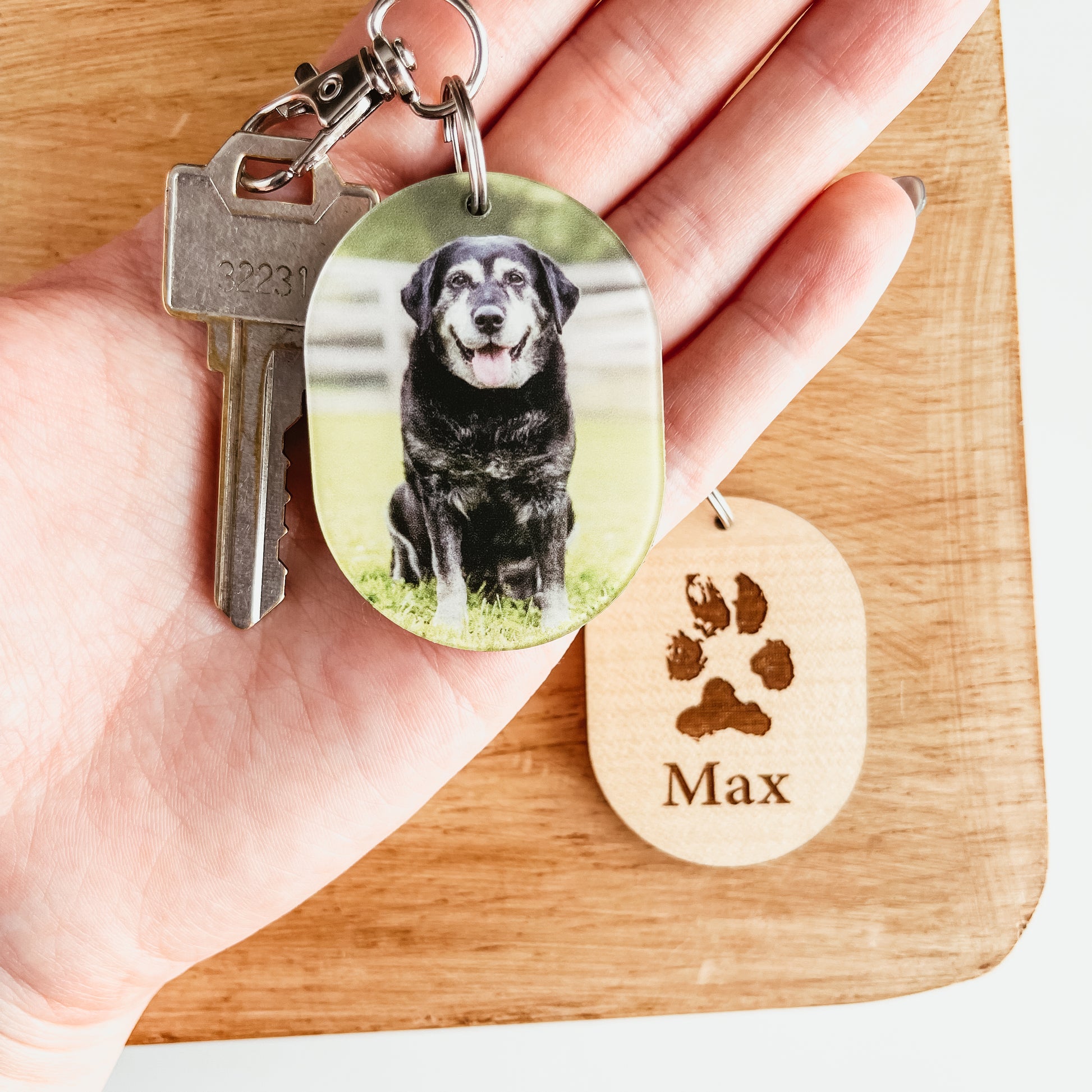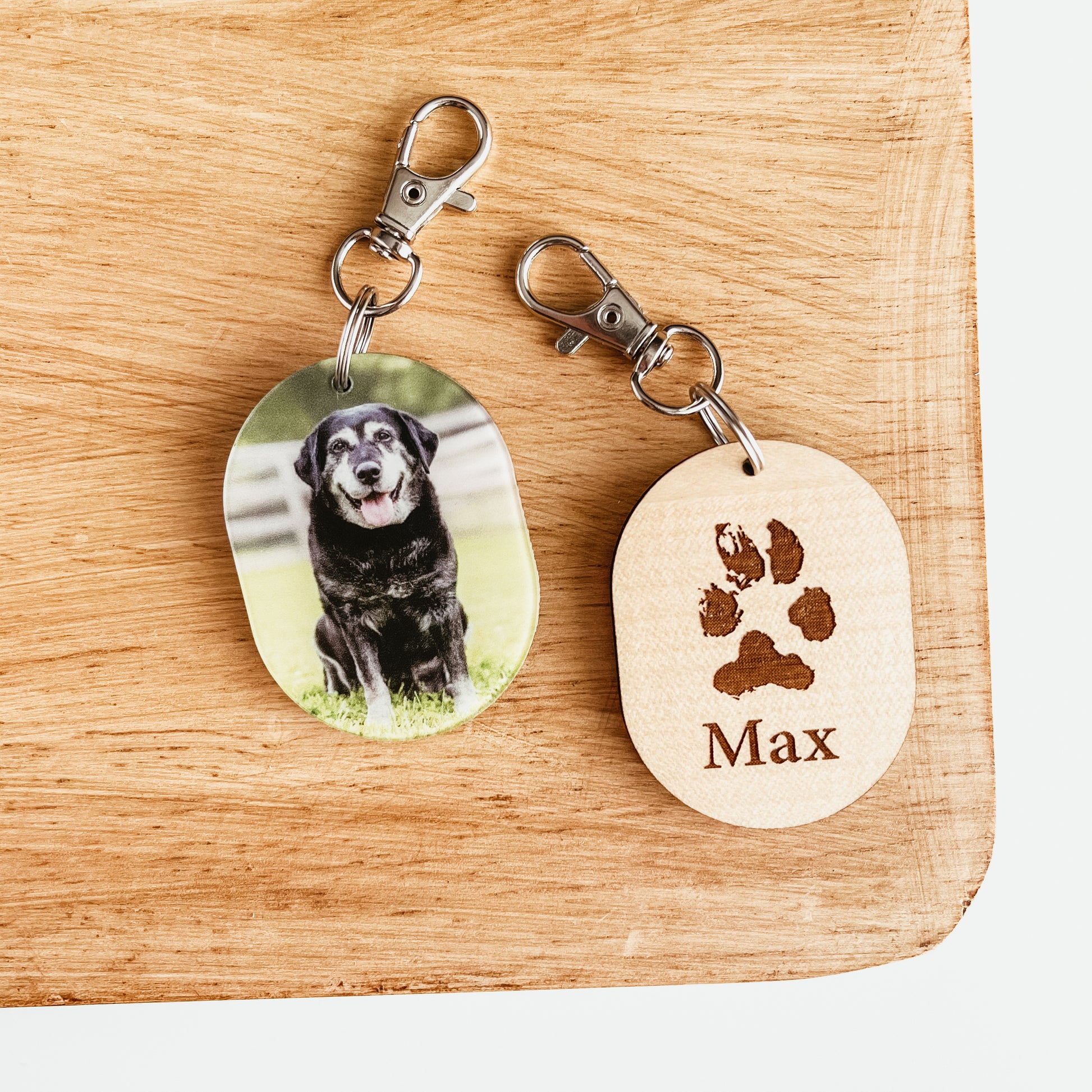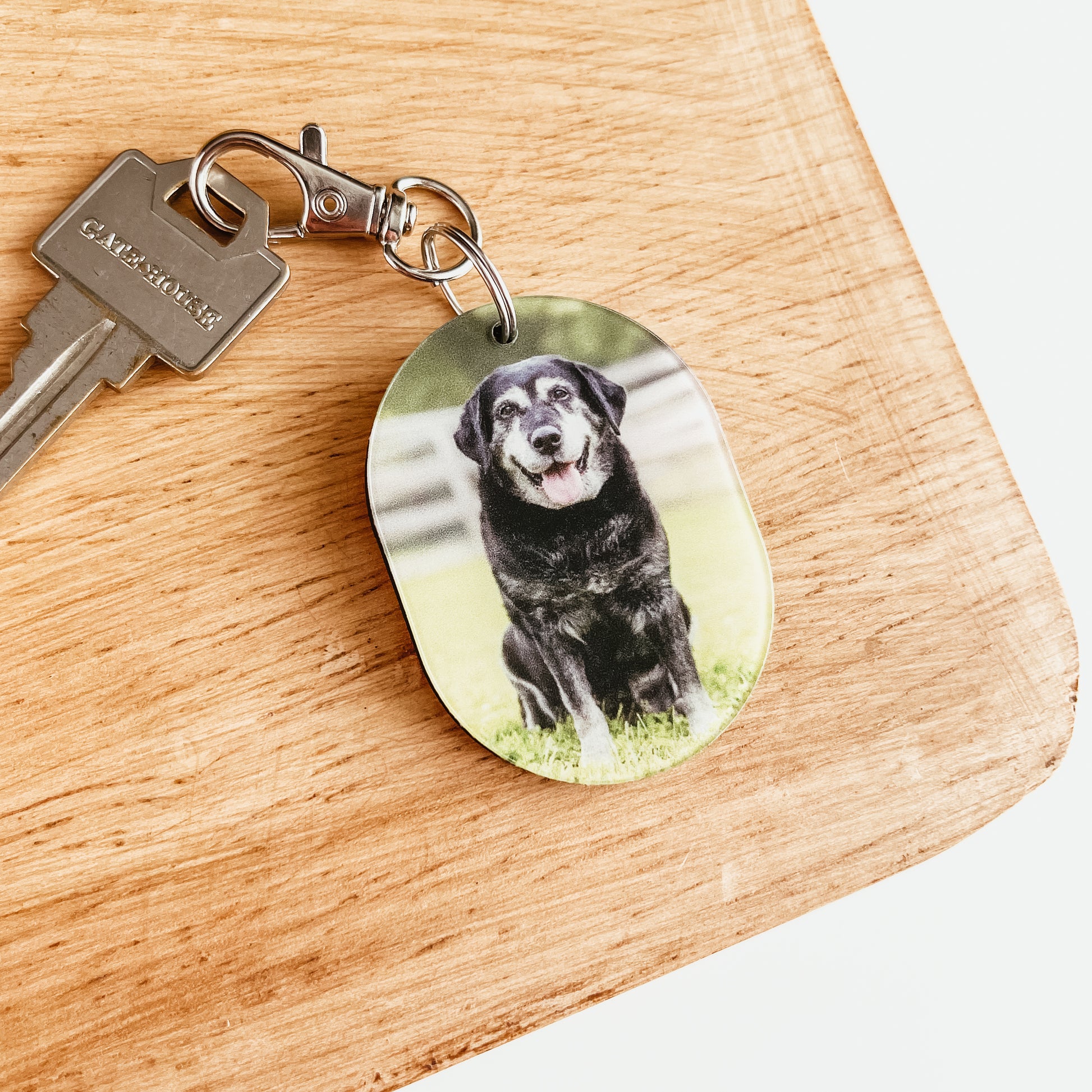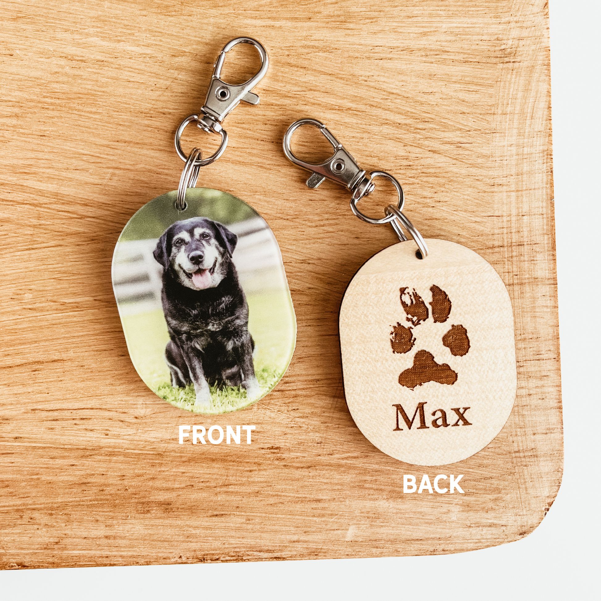 Carry your beloved pet with you with one of our personalized pet memorial photo keychains. This style from our collection of custom photo keyrings also makes a great gift for someone who has lost a pet. Personalized with a photo of your pet on the front and their actual paw print and name on the back.