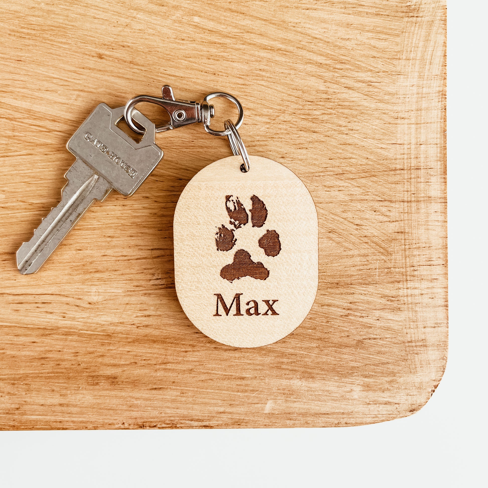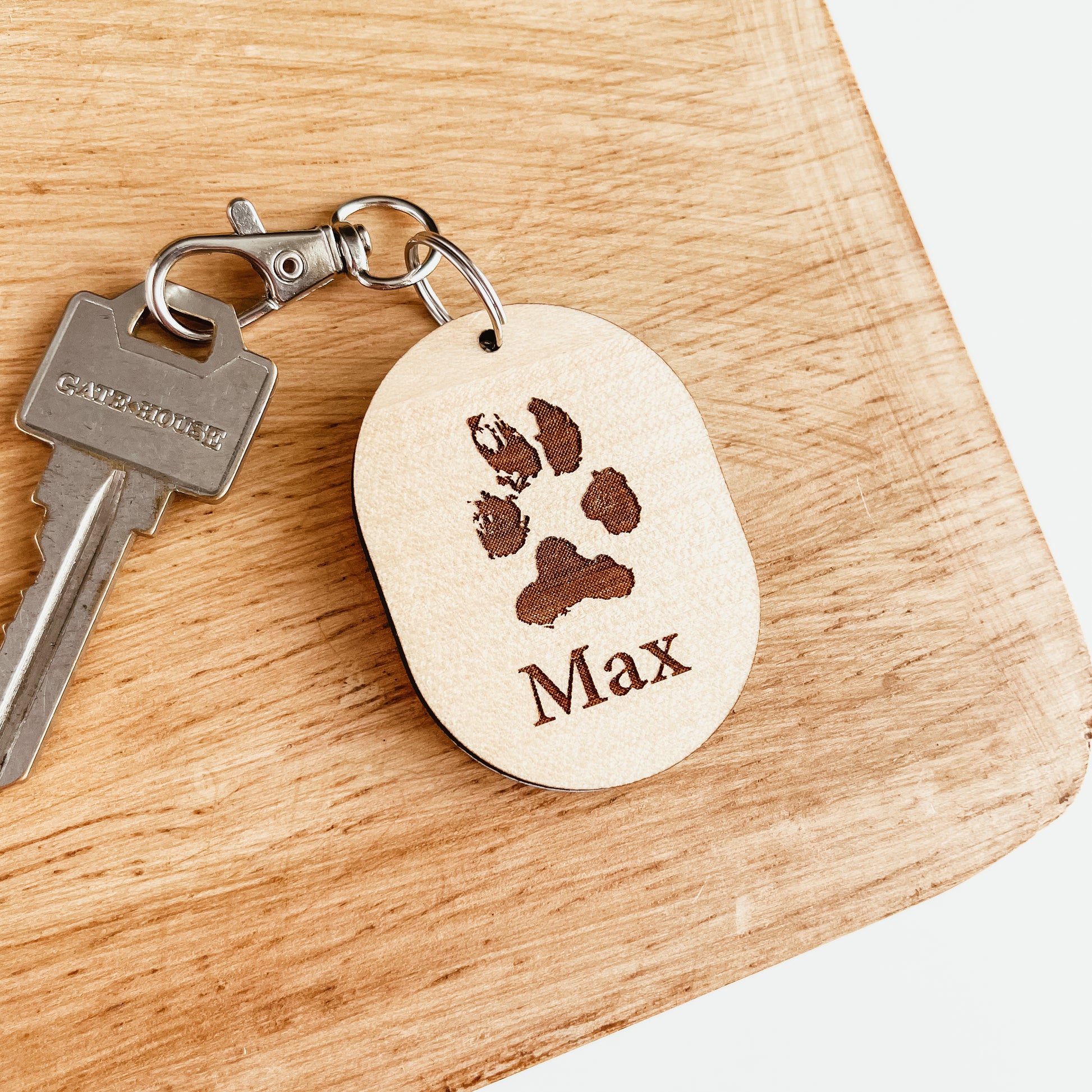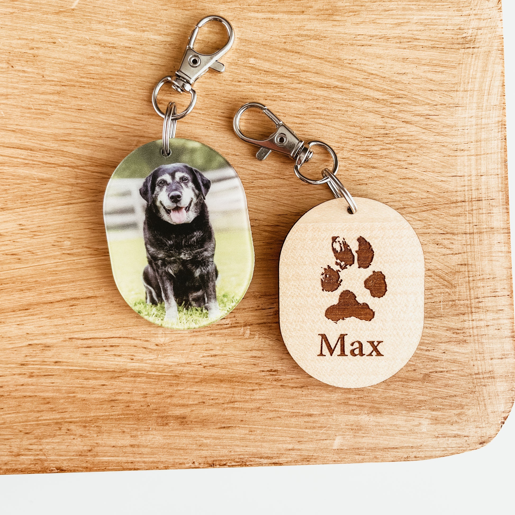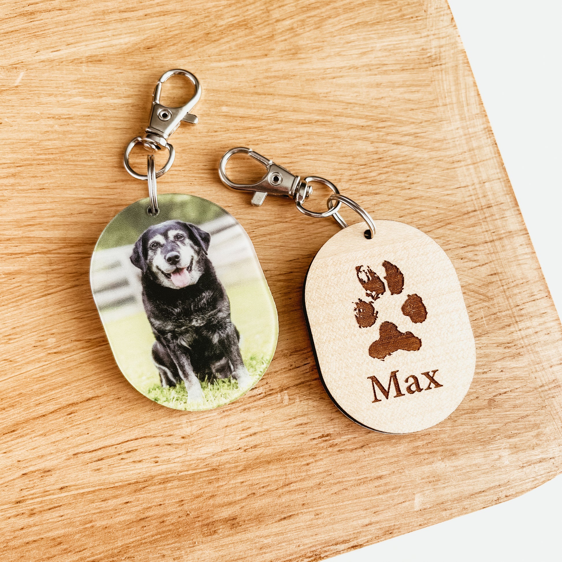 Carry your beloved pet with you with one of our personalized pet memorial photo keychains. This style from our collection of custom photo keyrings also makes a great gift for someone who has lost a pet. Personalized with a photo of your pet on the front and their actual paw print and name on the back.