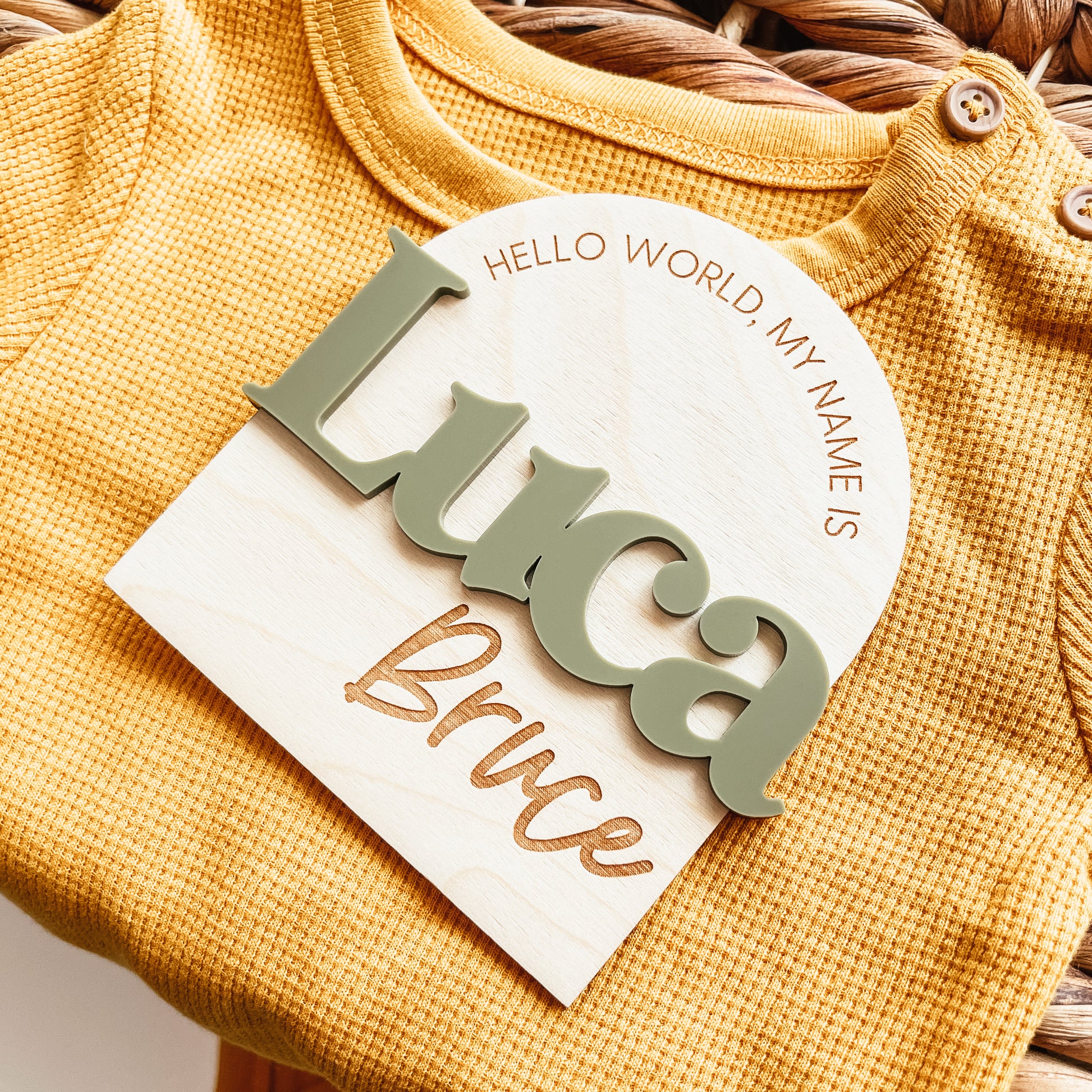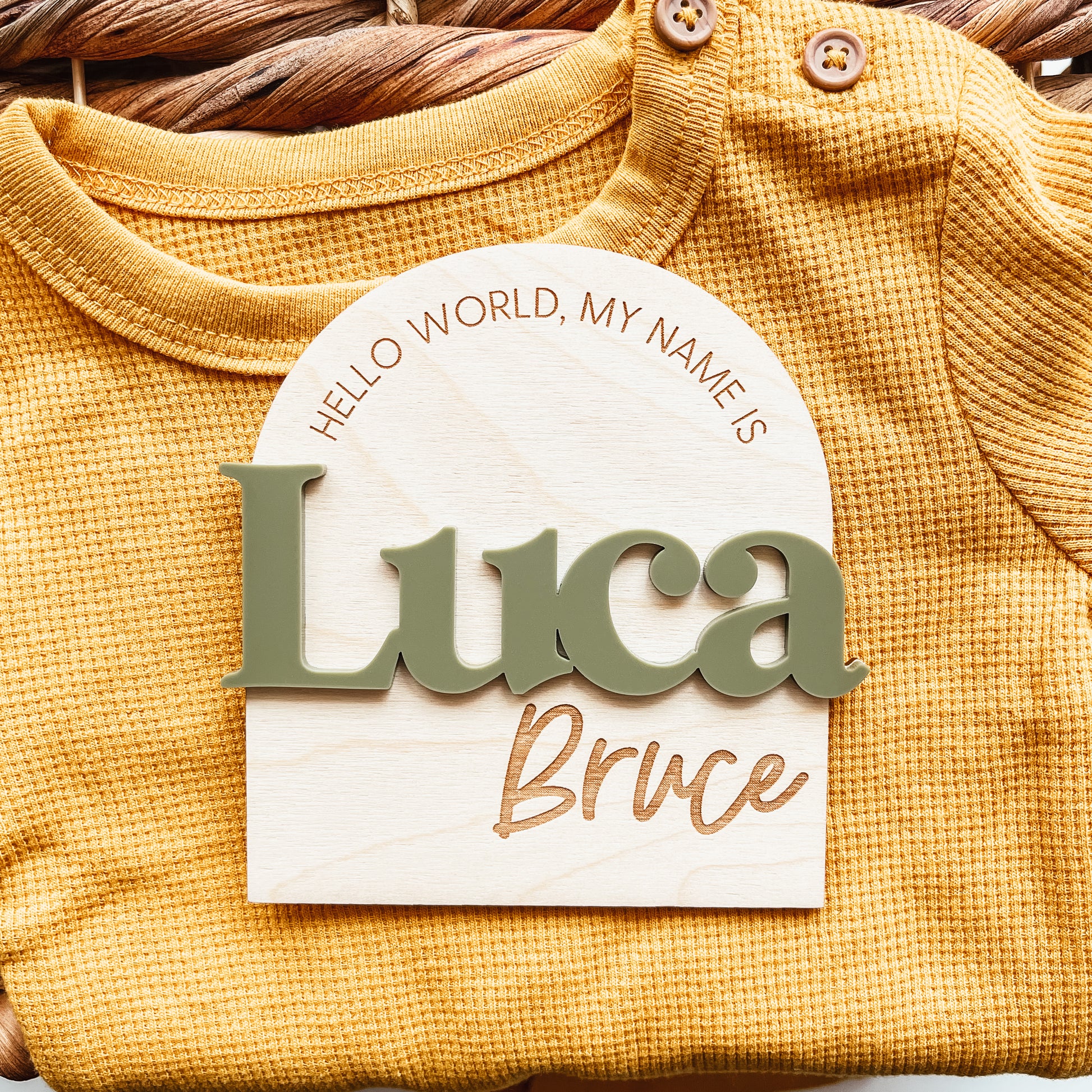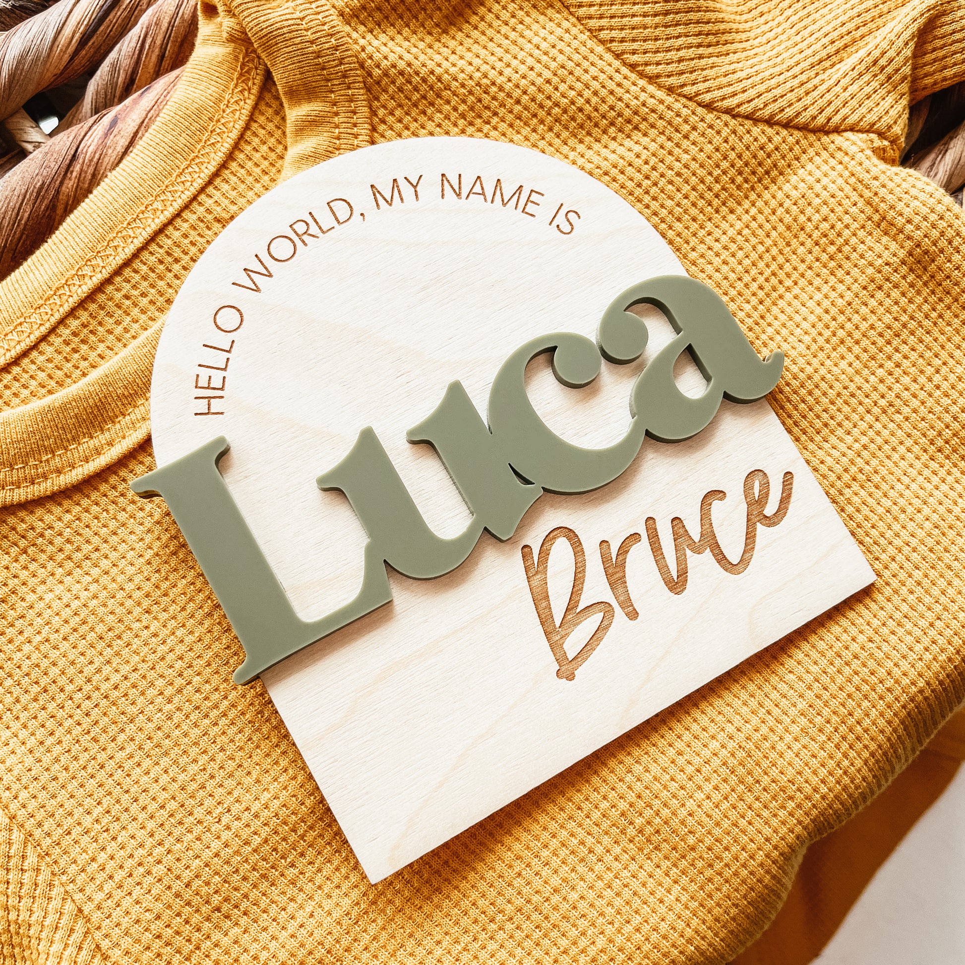 This birth announcement sign features 3D lettering for the first name in the colour of your choice. The remainder of the design is engraved.