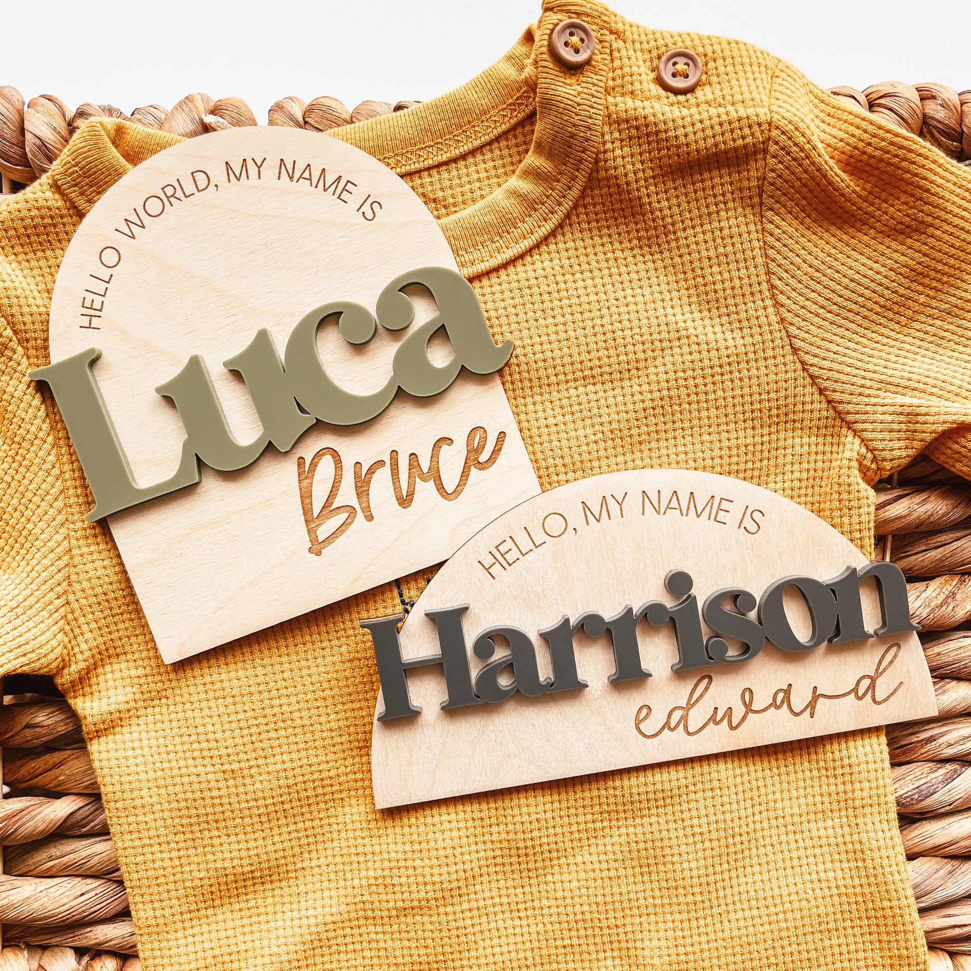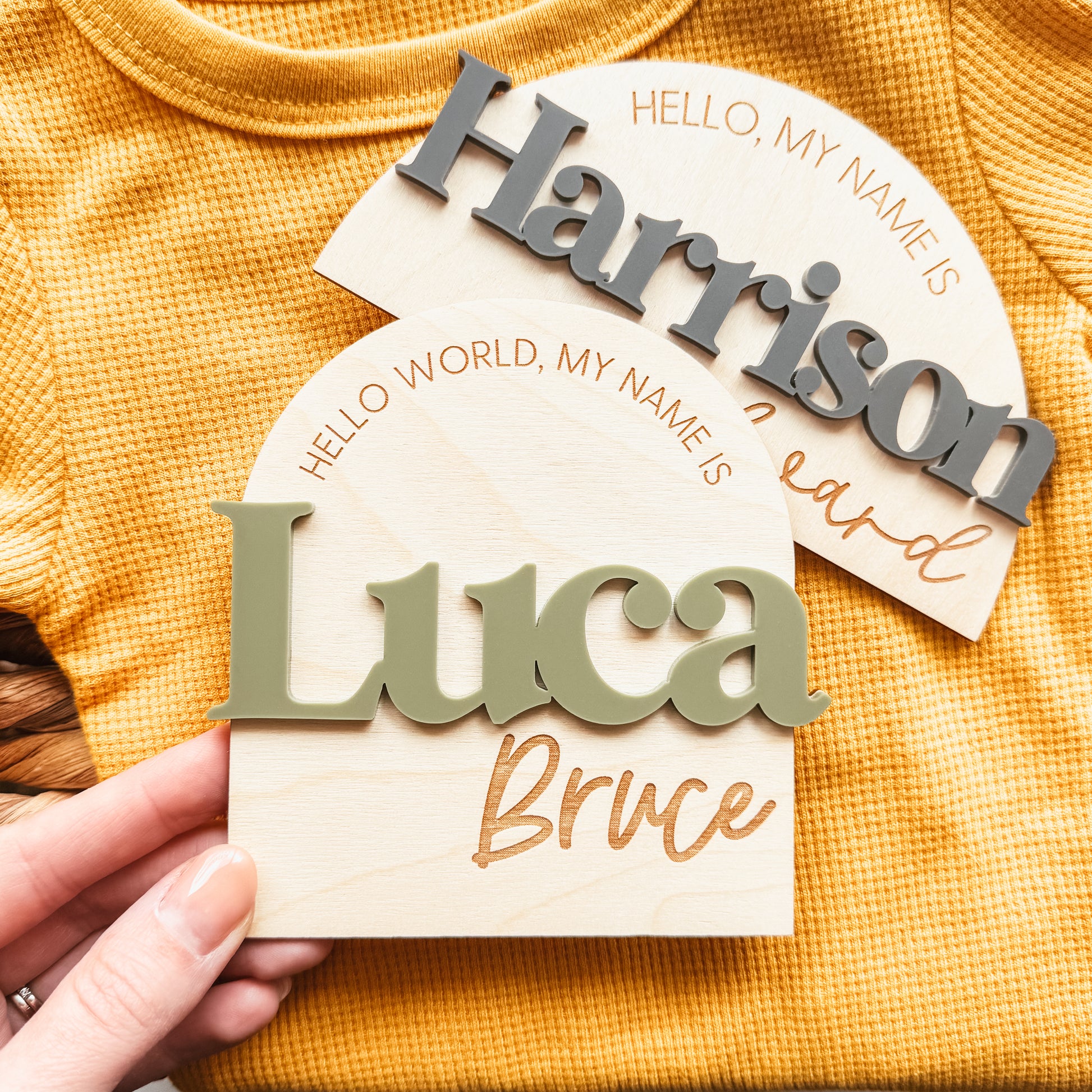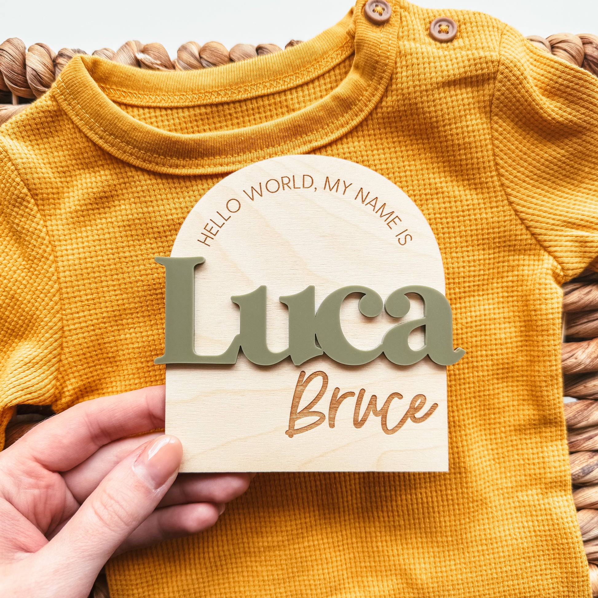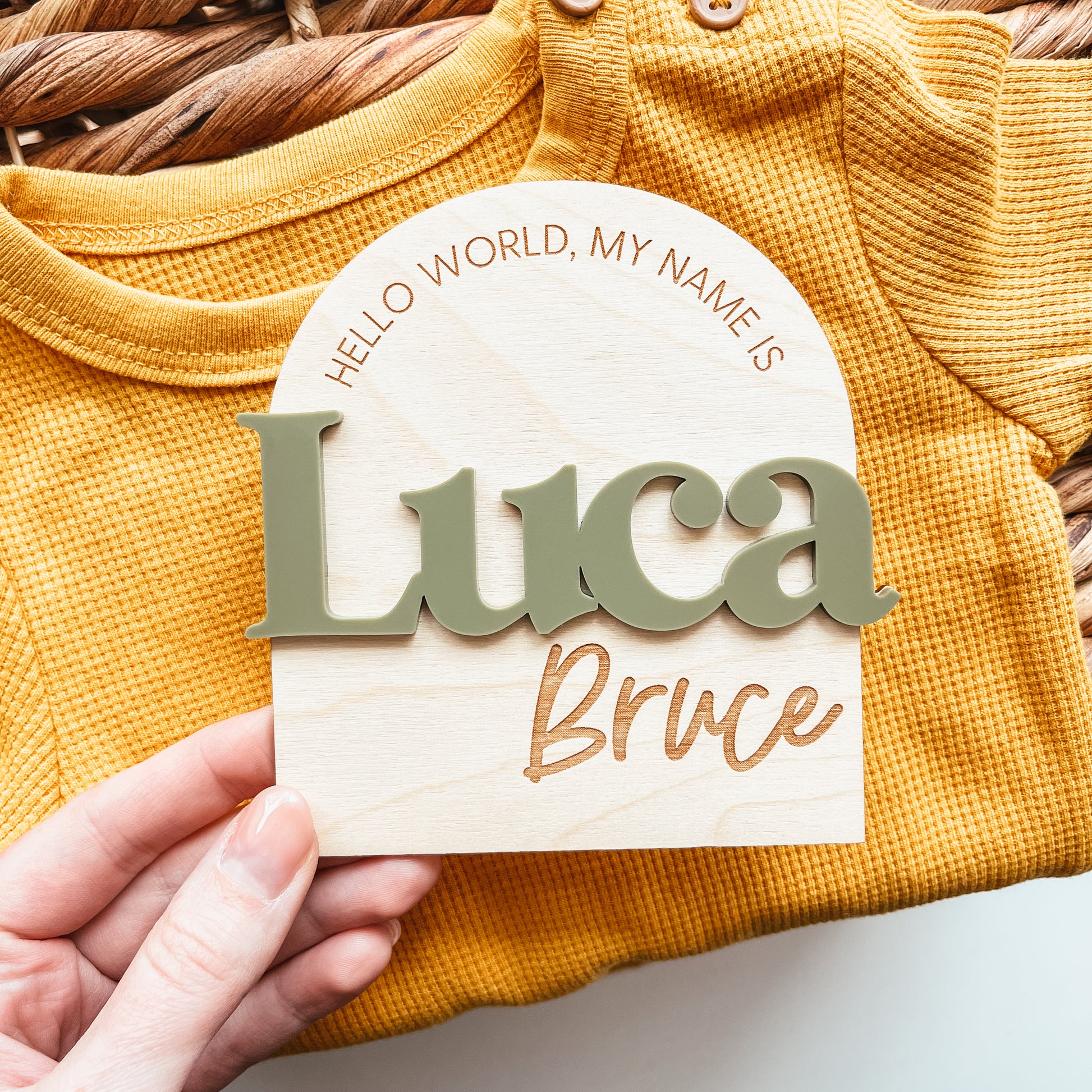 This birth announcement sign features 3D lettering for the first name in the colour of your choice. The remainder of the design is engraved.