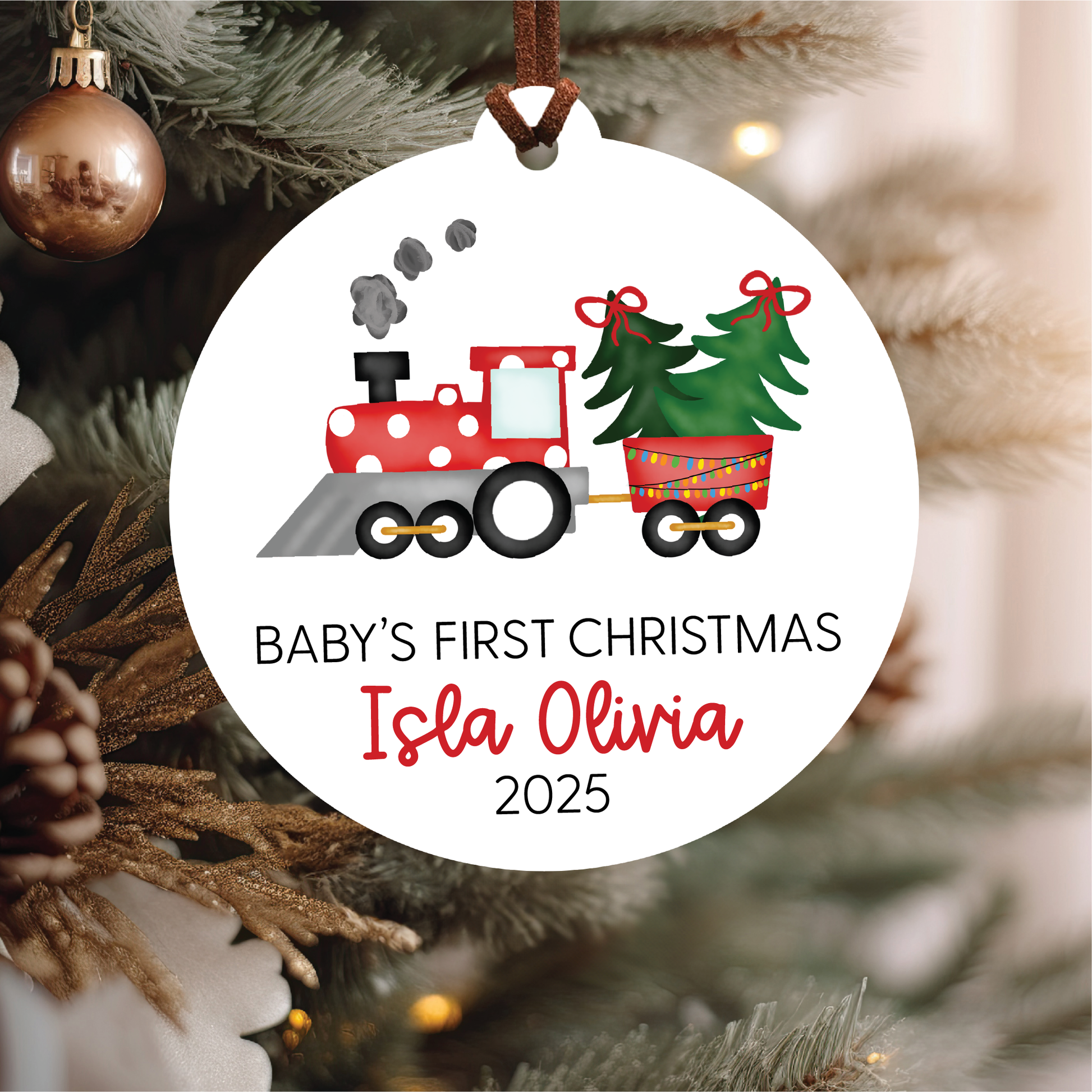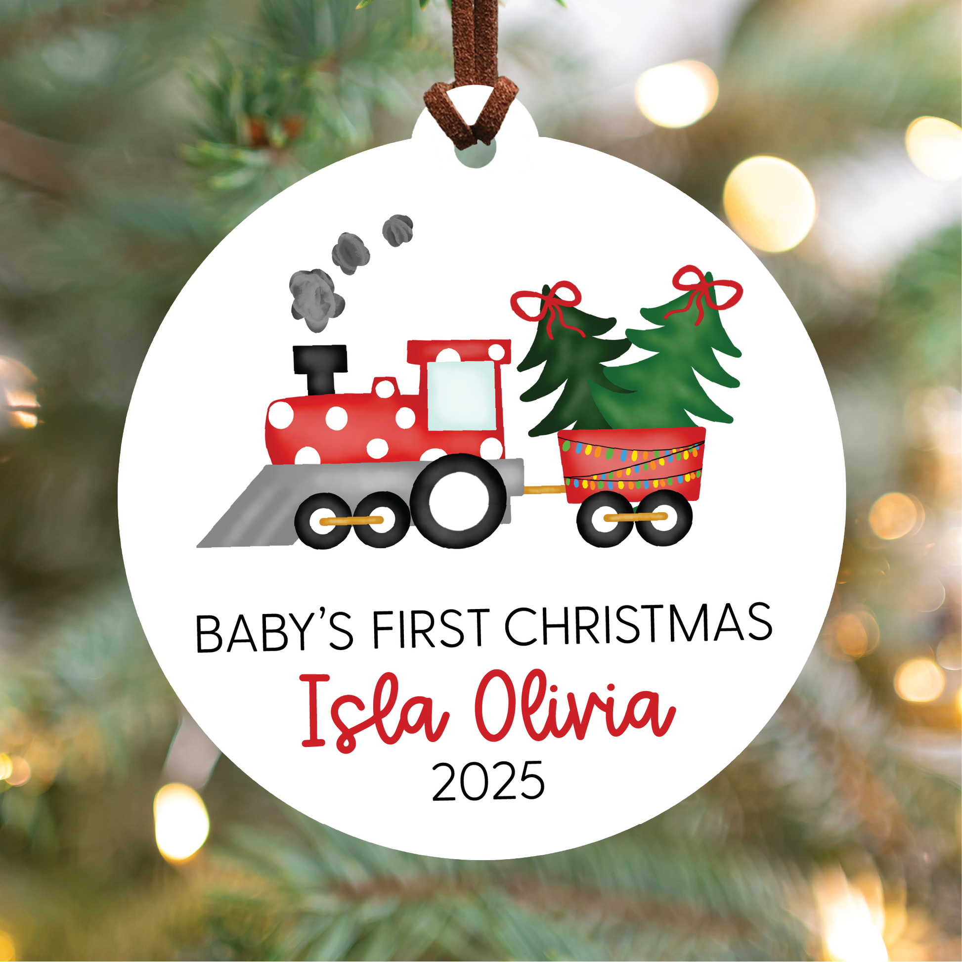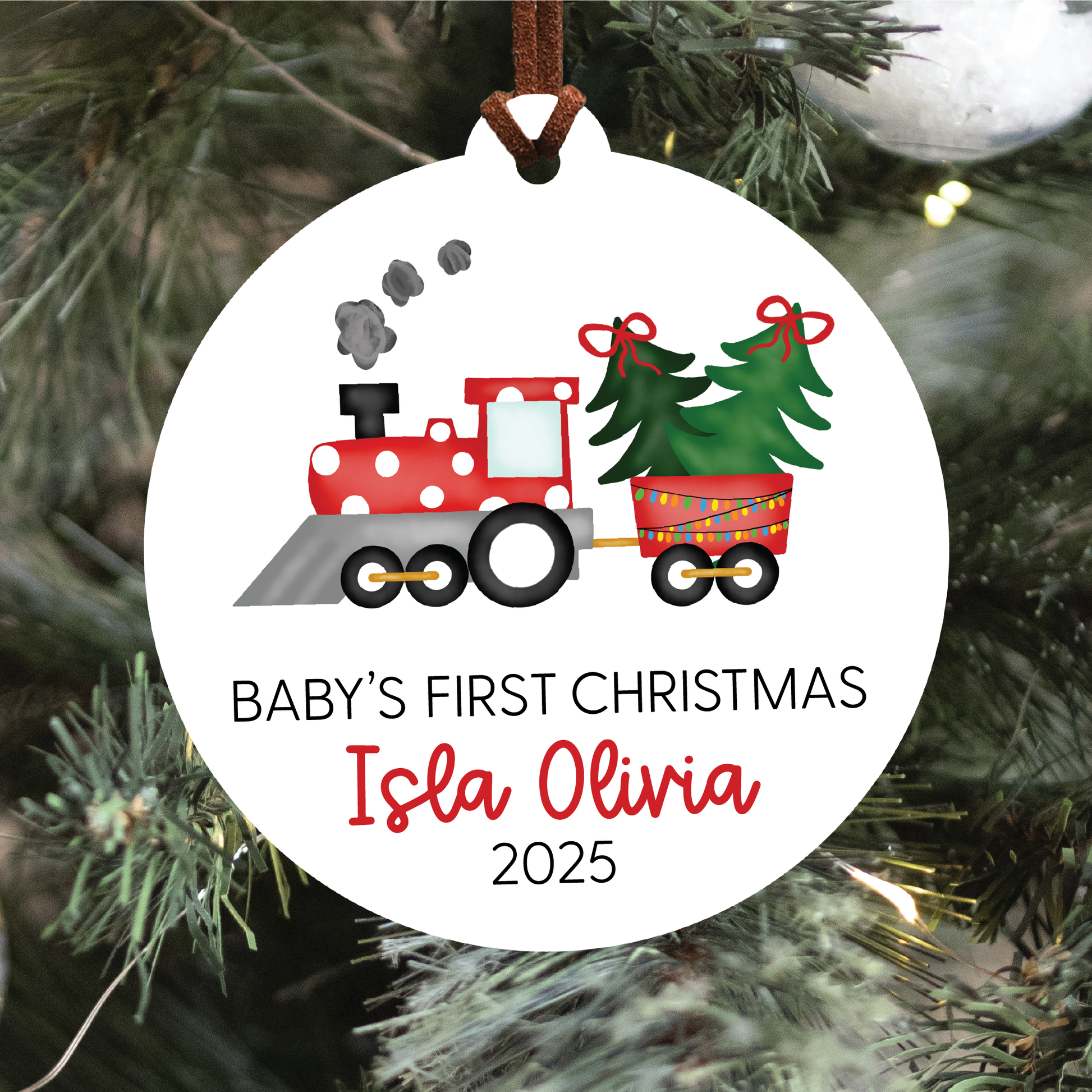 Each ornament is laser cut from 1/8" white acrylic and then printed with permanent ink. They are finished with a brown suede string for a modern look. The back of the ornament will be white.