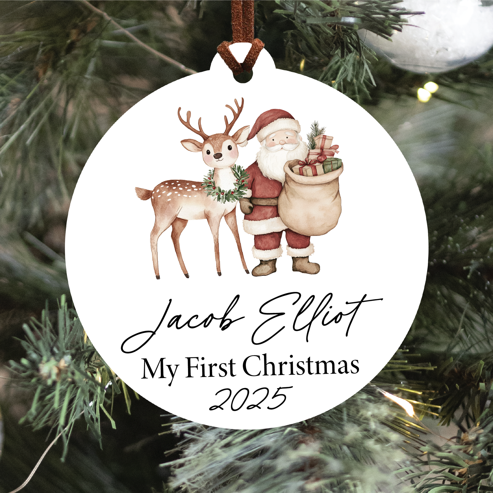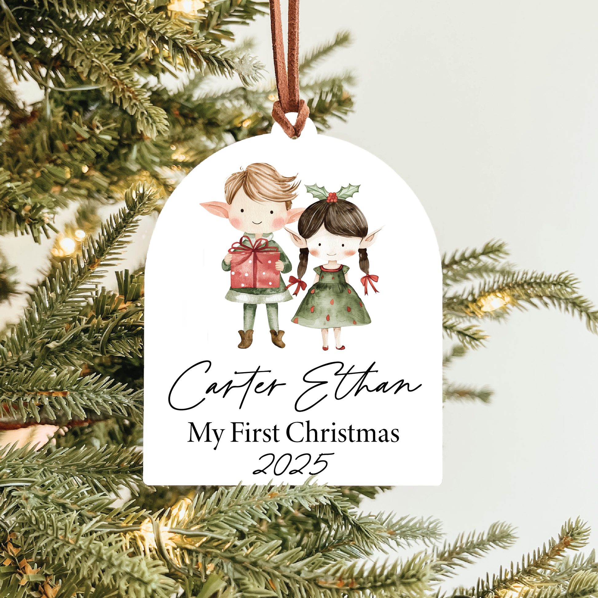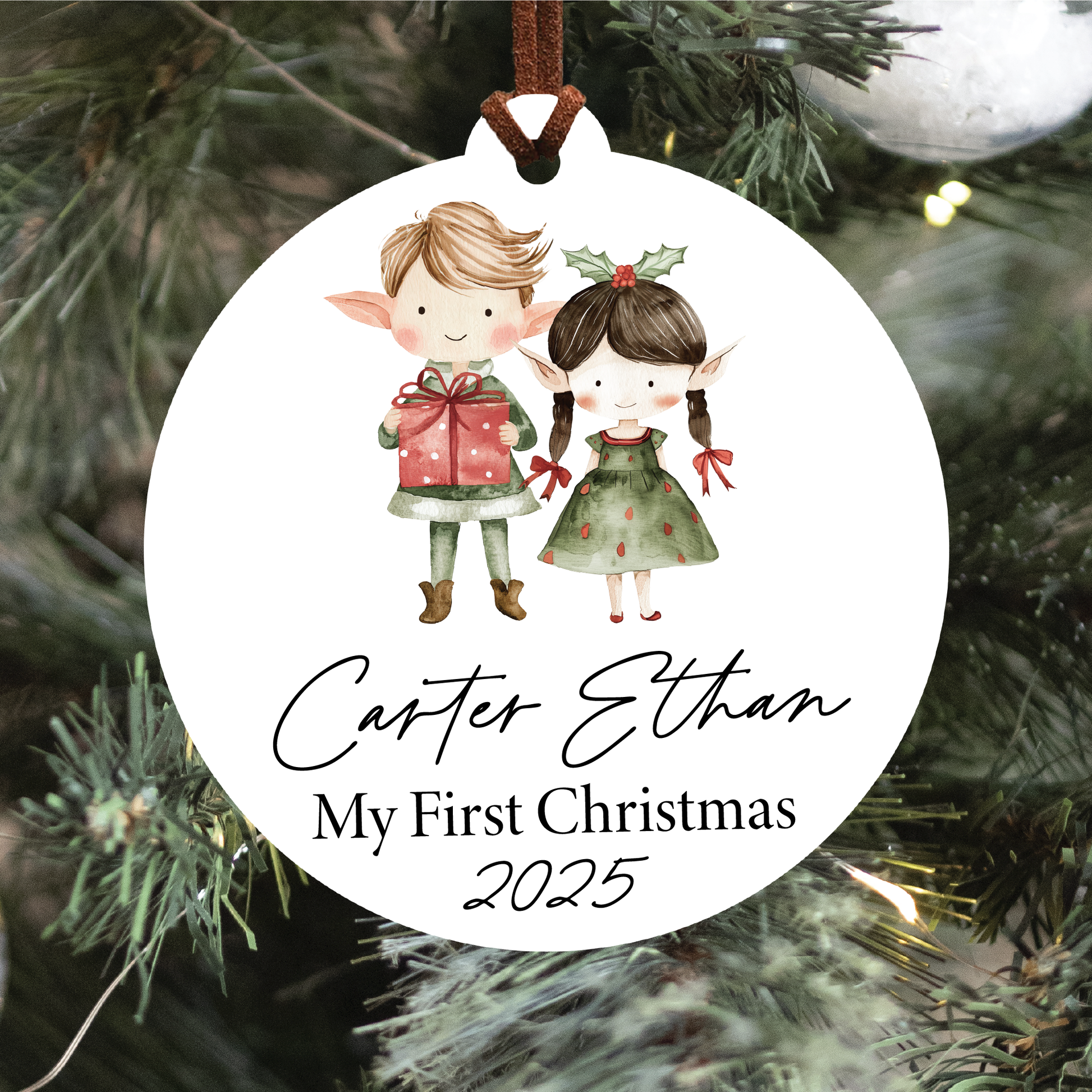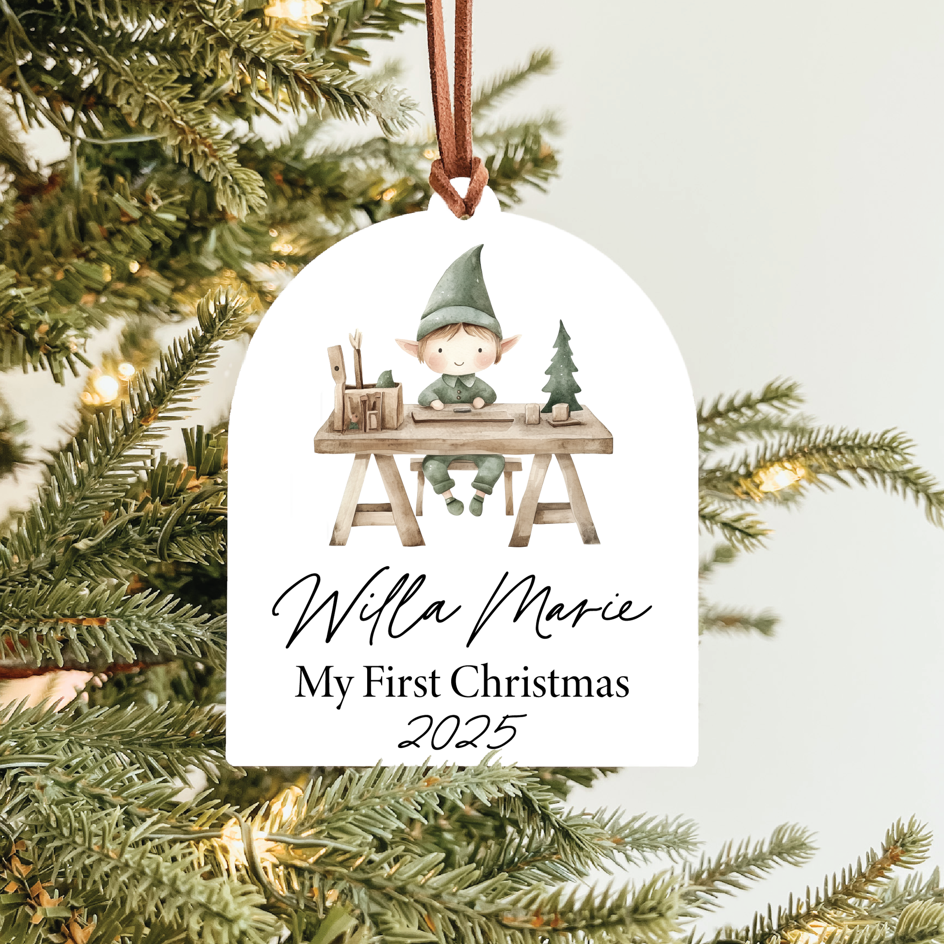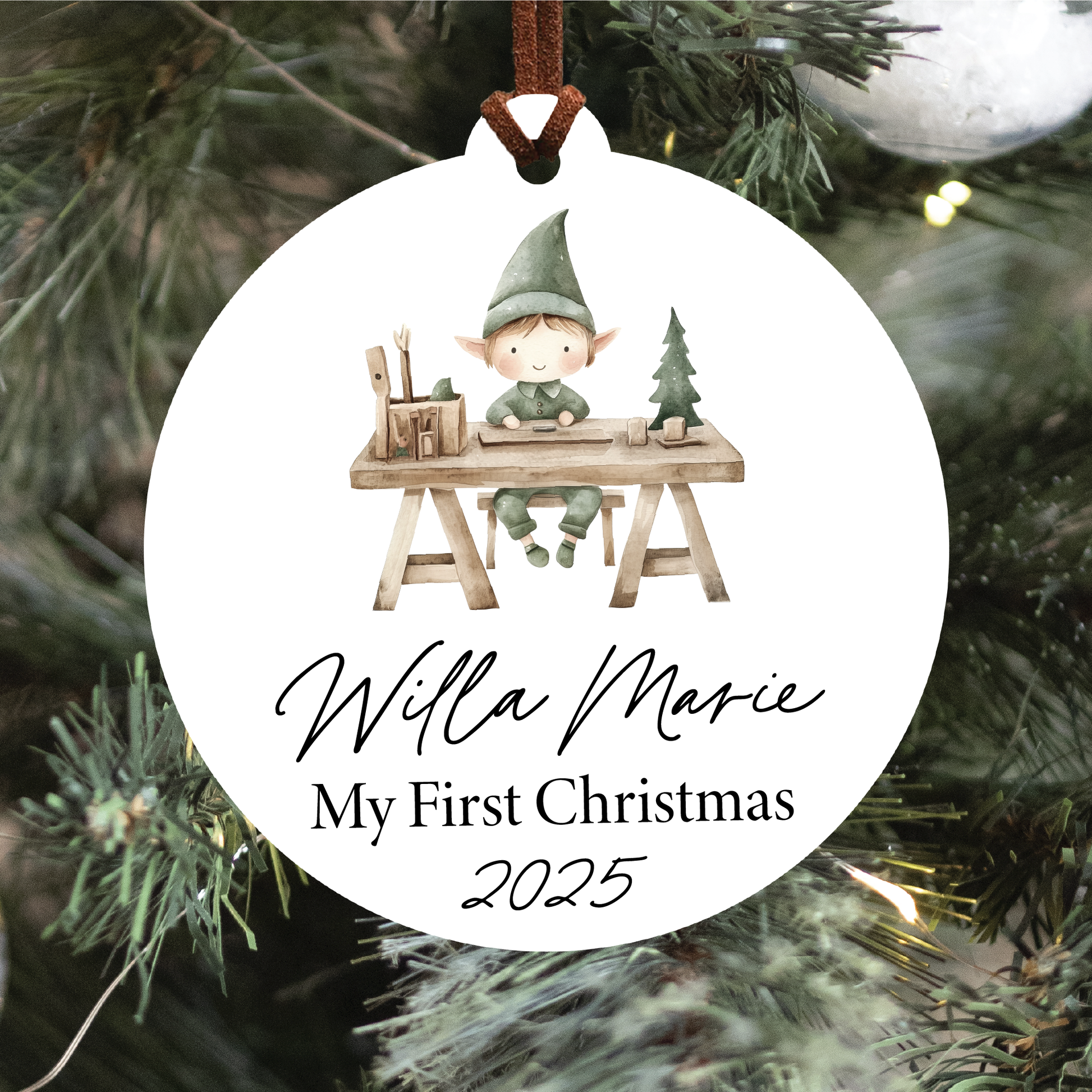 Personalize your Christmas ornament by choosing from three images (Two Elves, Santa and Reindeer, or Elf at Workbench) and adding your baby's name and birth year!