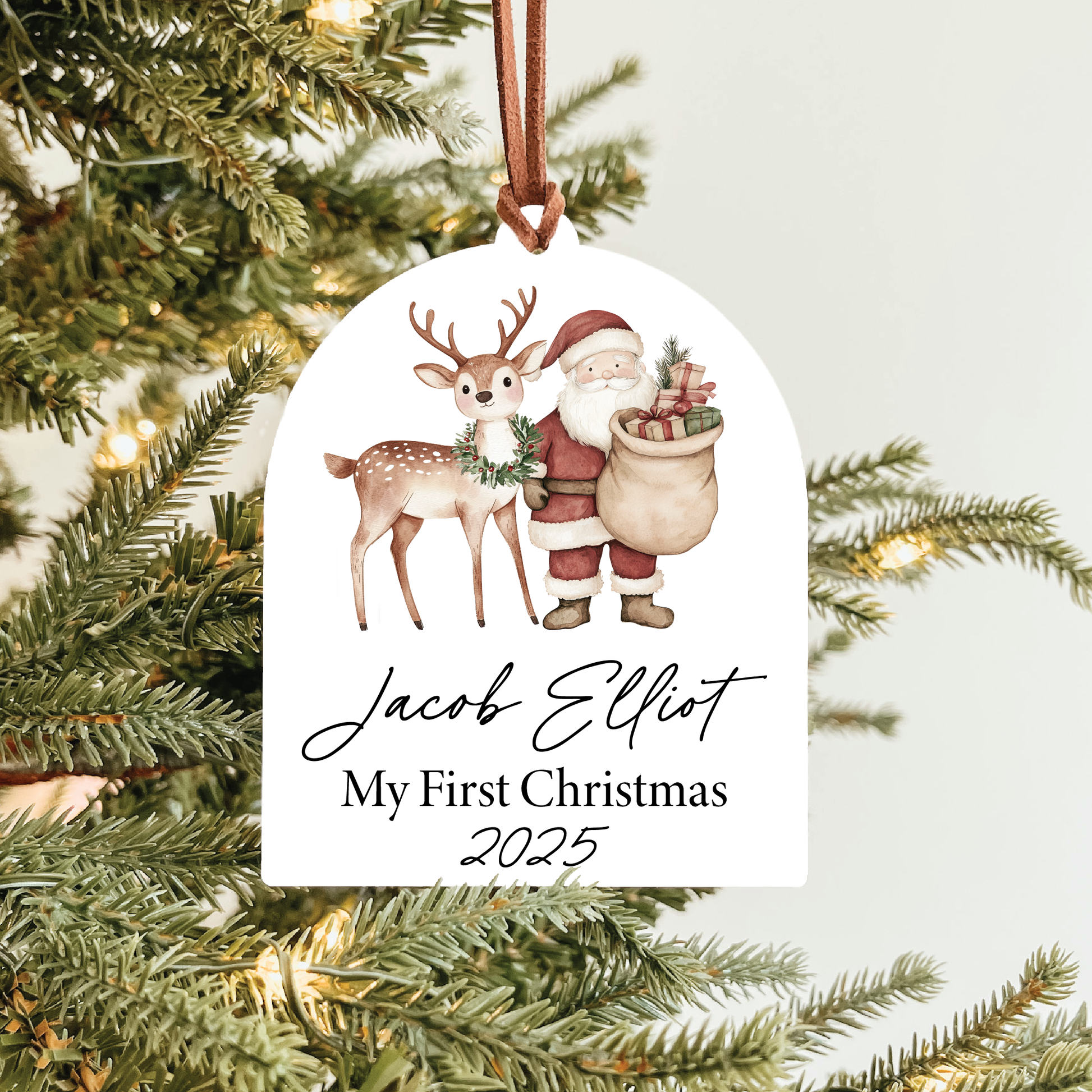 Each first Christmas ornament is individually packaged and ready for gifting. Each ornament is laser cut from white acrylic and then printed in studio with permanent, cured ink for a timeless finish. They are completed with a brown suede string for a modern look.