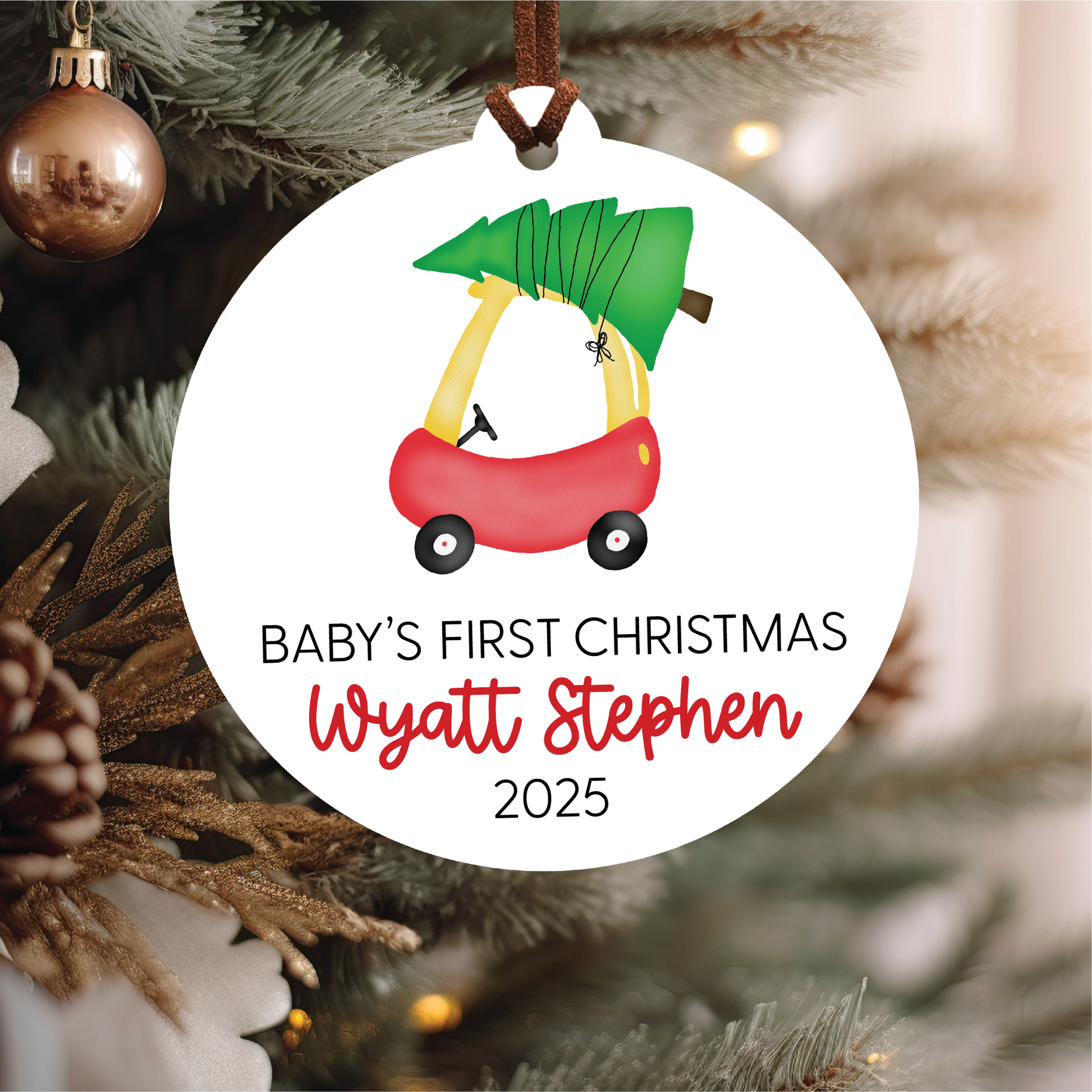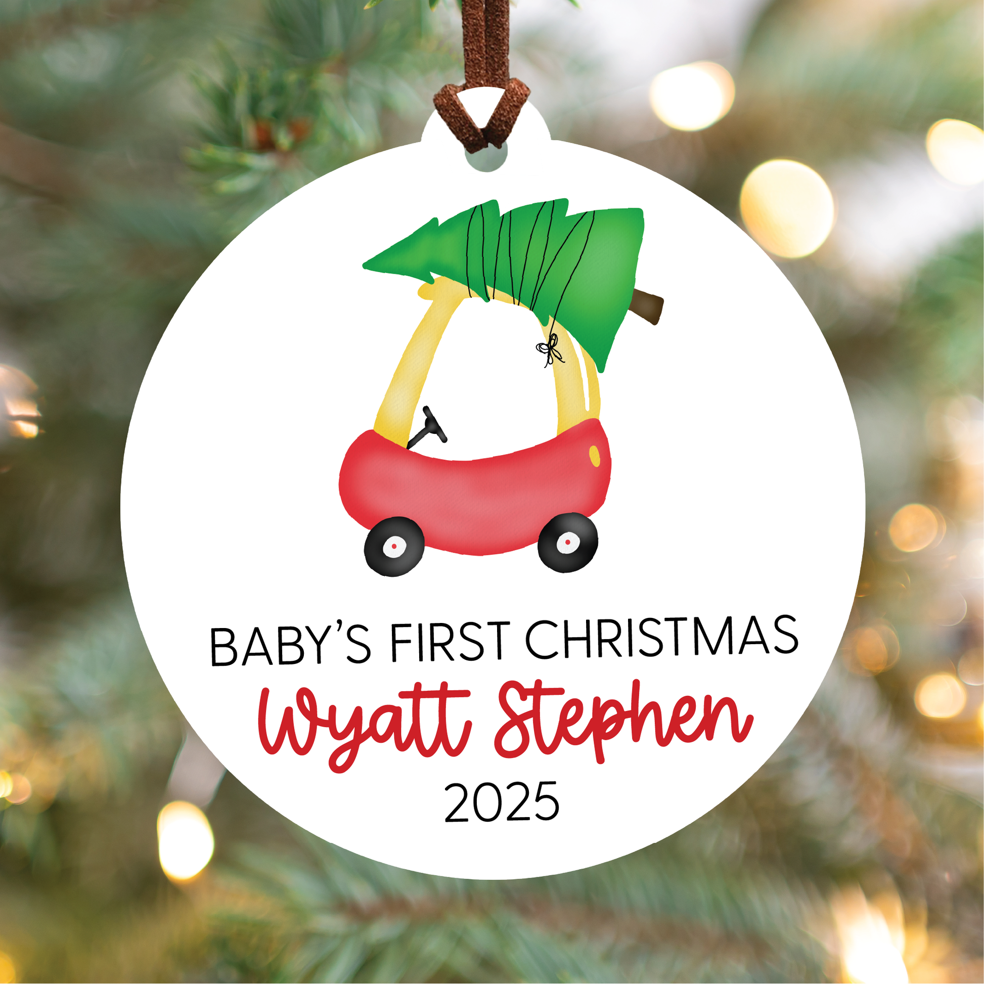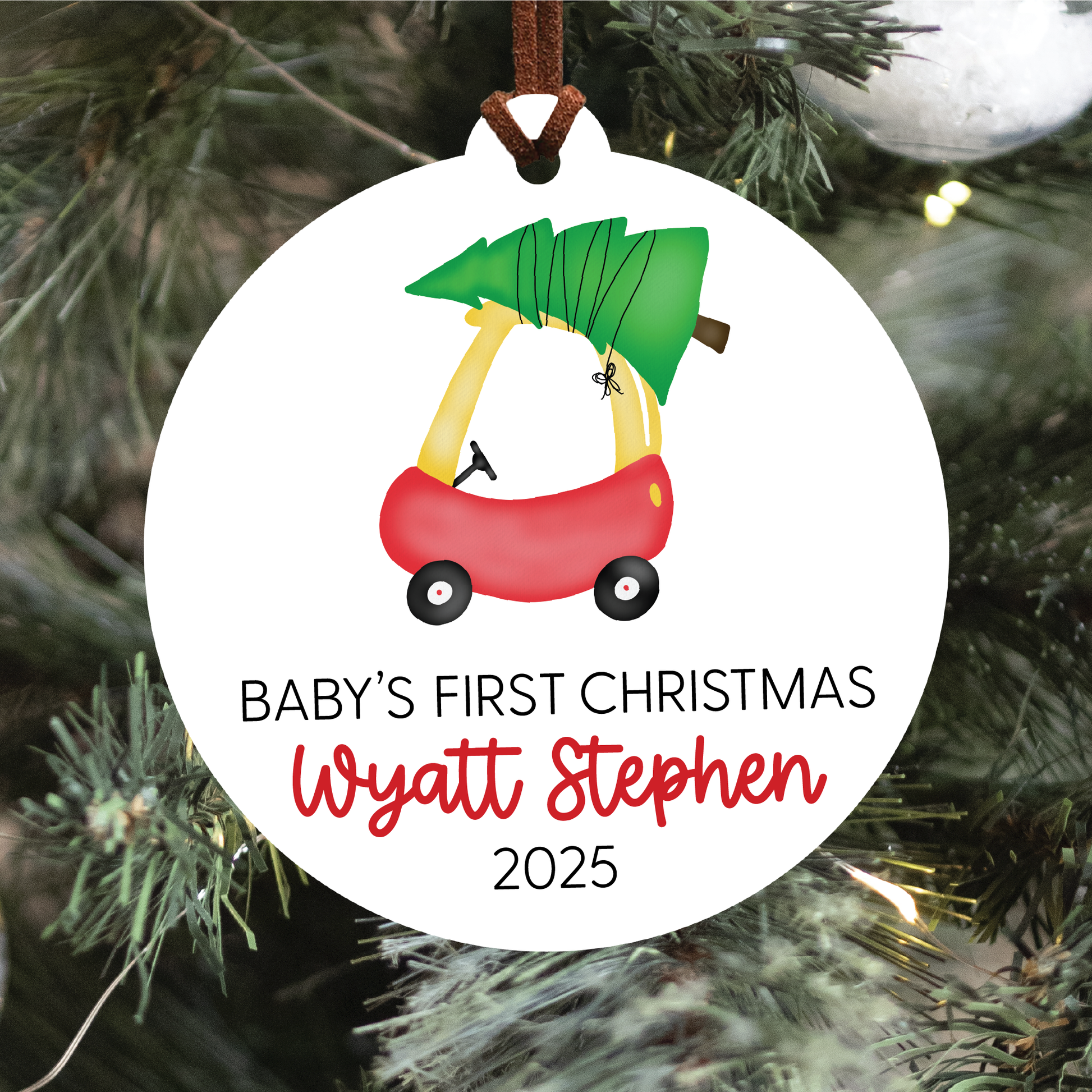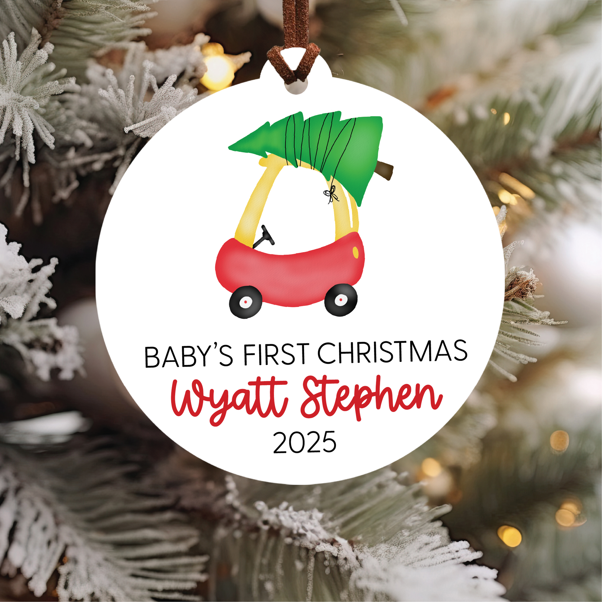 Each ornament is laser cut from 1/8" white acrylic and then printed with permanent ink. They are finished with a brown suede string for a modern look. The back of the ornament will be white.