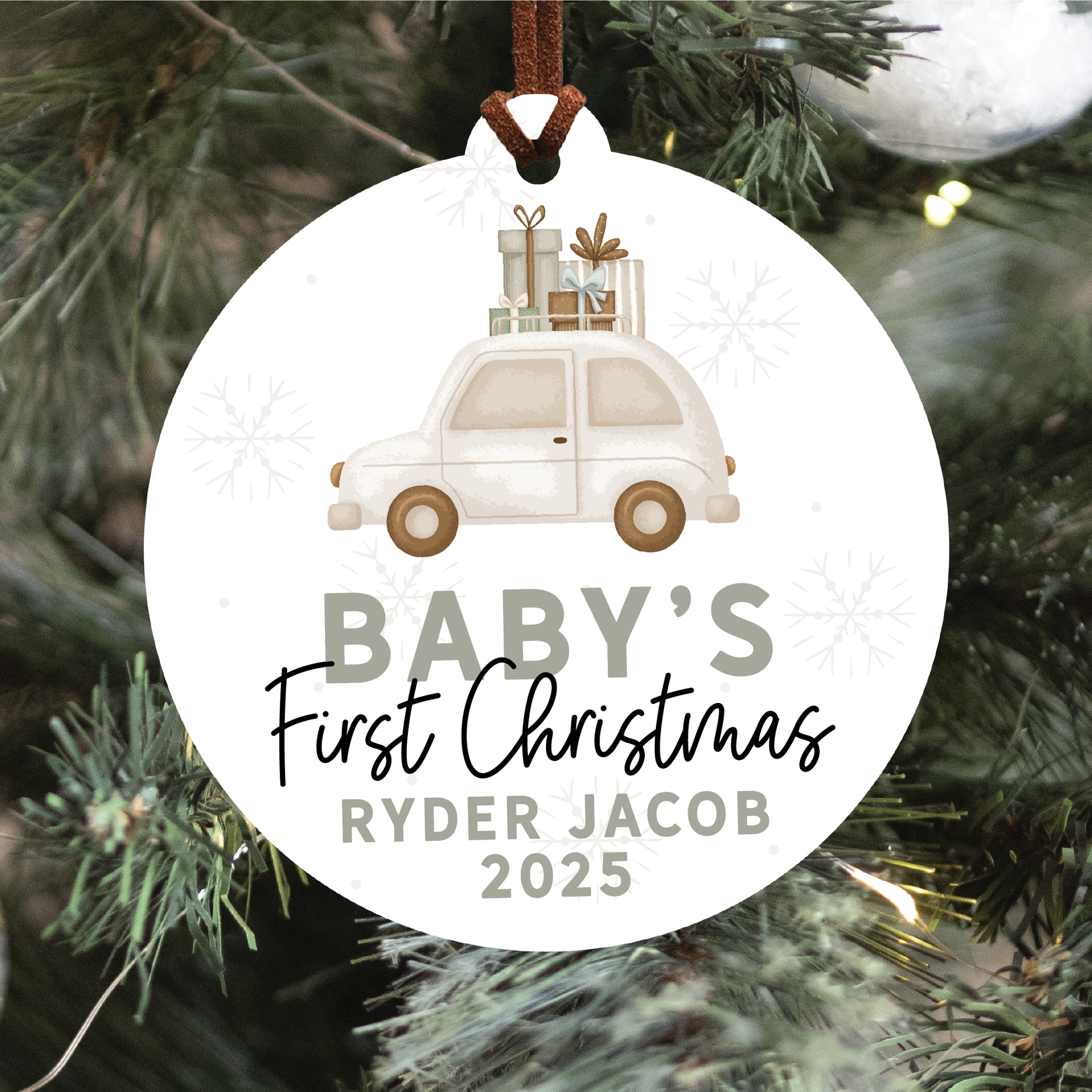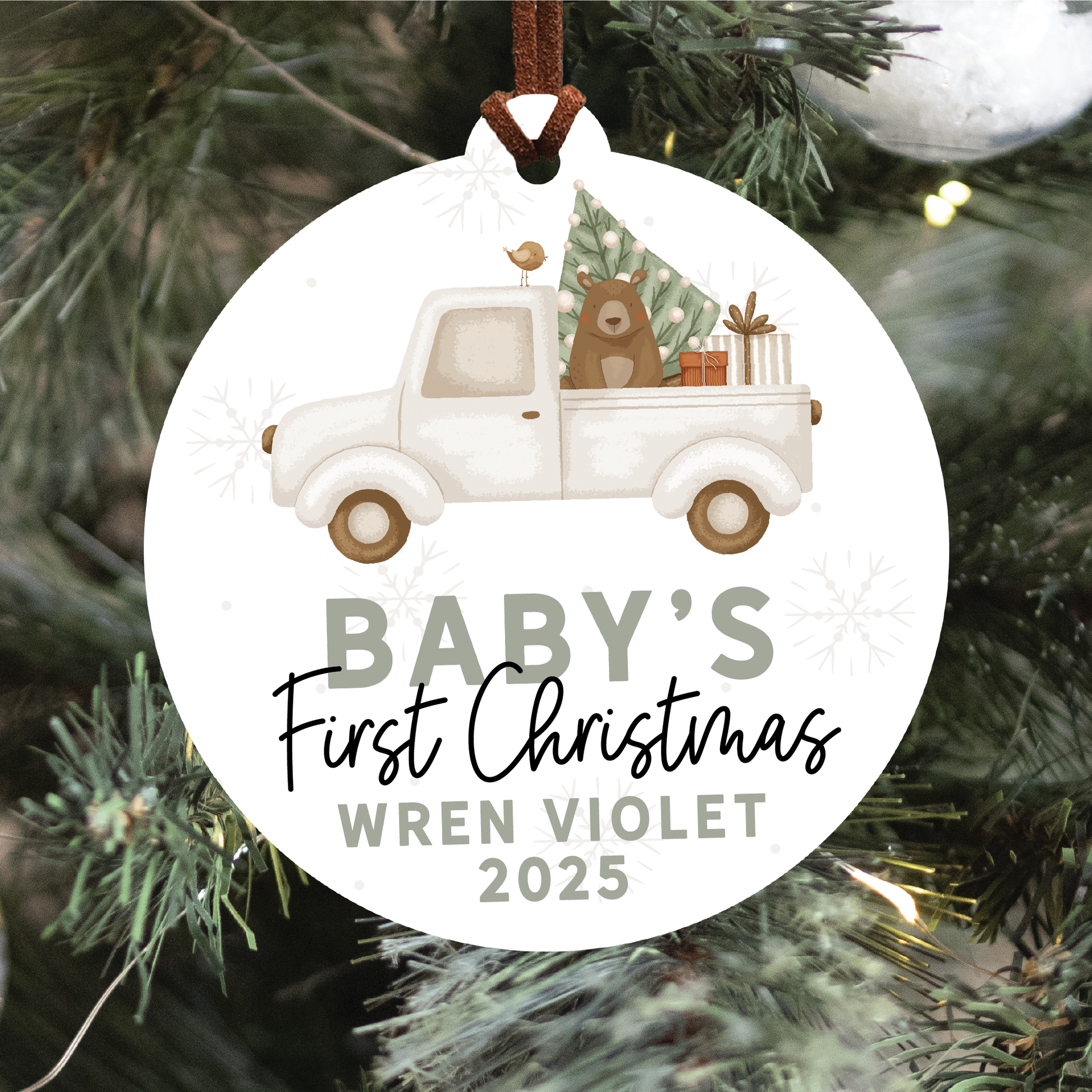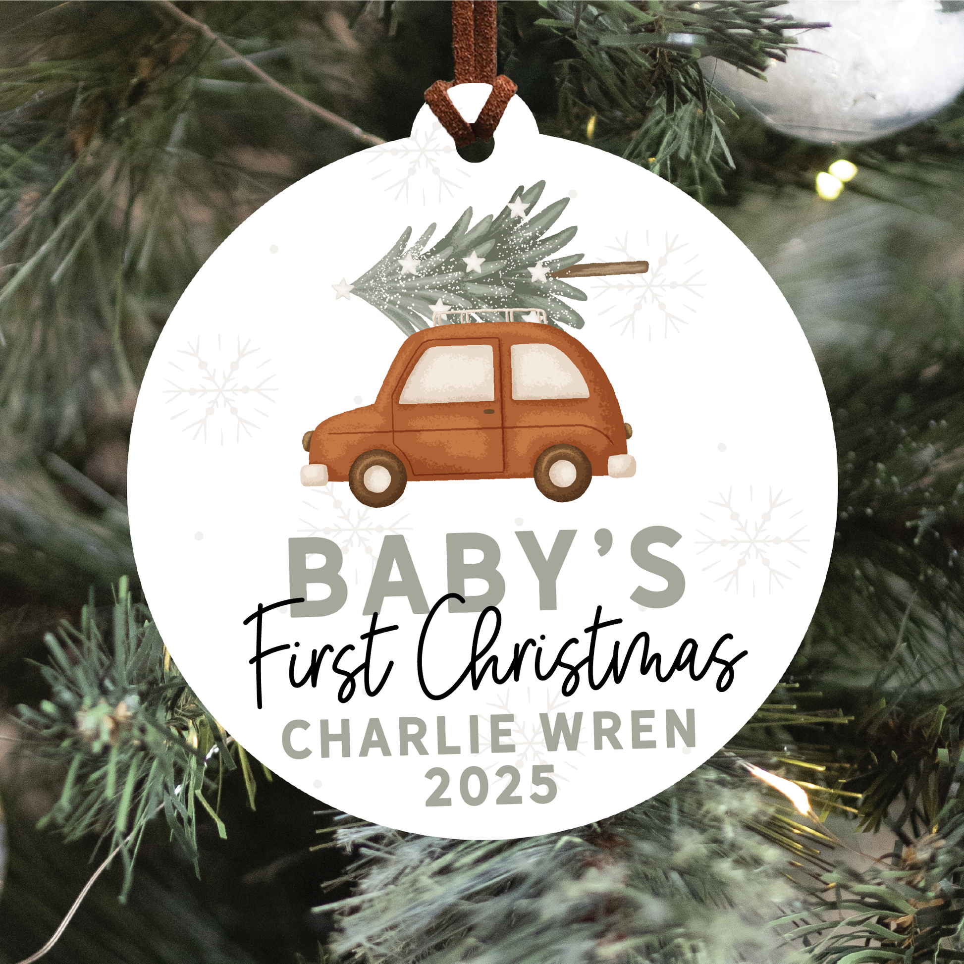 Each ornament is laser cut from 1/8" white acrylic and then printed with permanent ink. They are finished with a brown suede string for a modern look. The back of the ornament will be white.