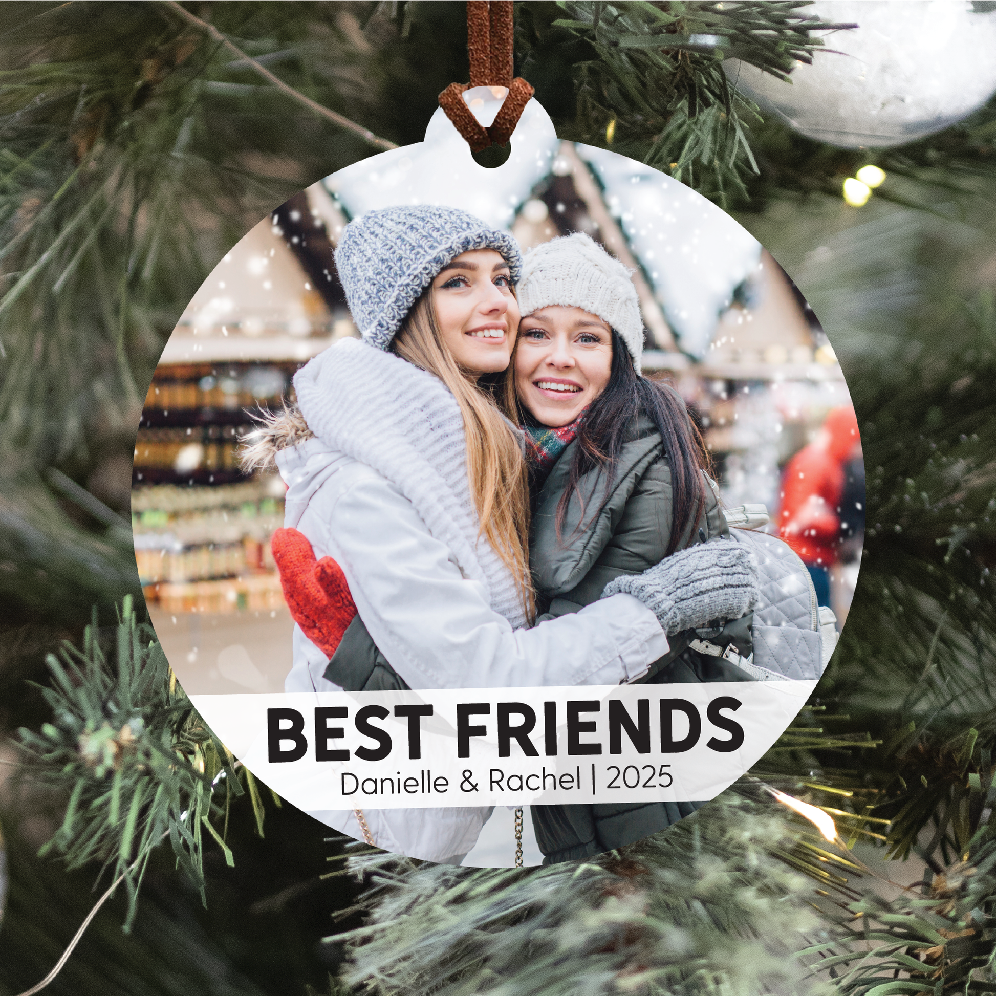 Each ornament is laser cut from 1/8" white acrylic and then printed with permanent ink. They are finished with a brown suede string for a modern look. One side will be printed with your photo and text; the other side will be white.