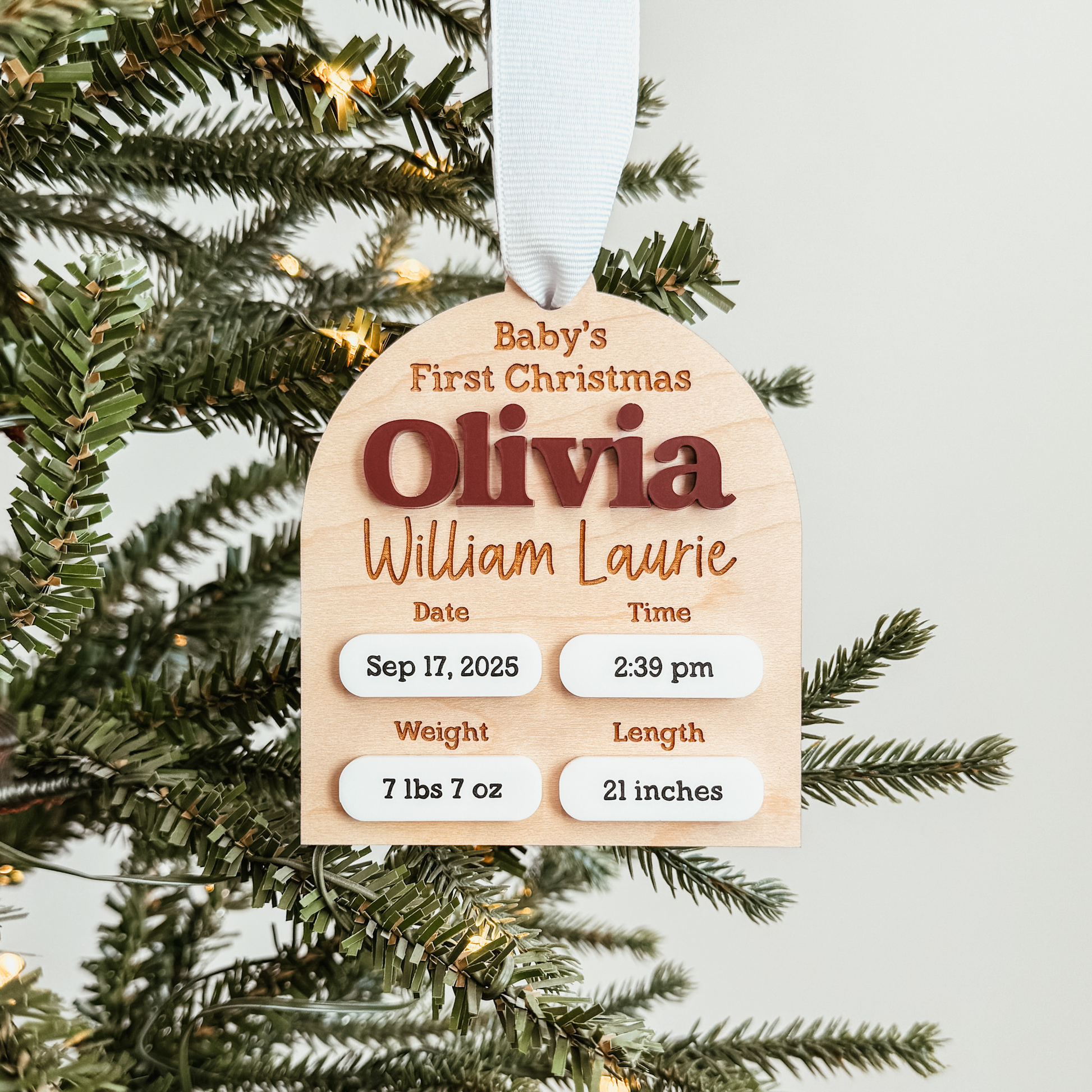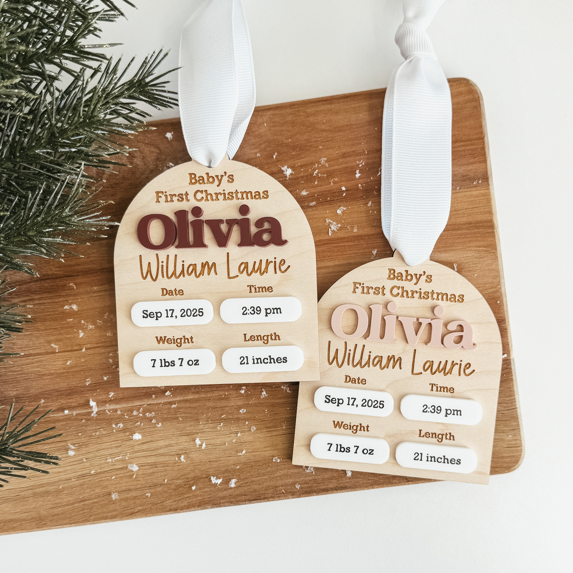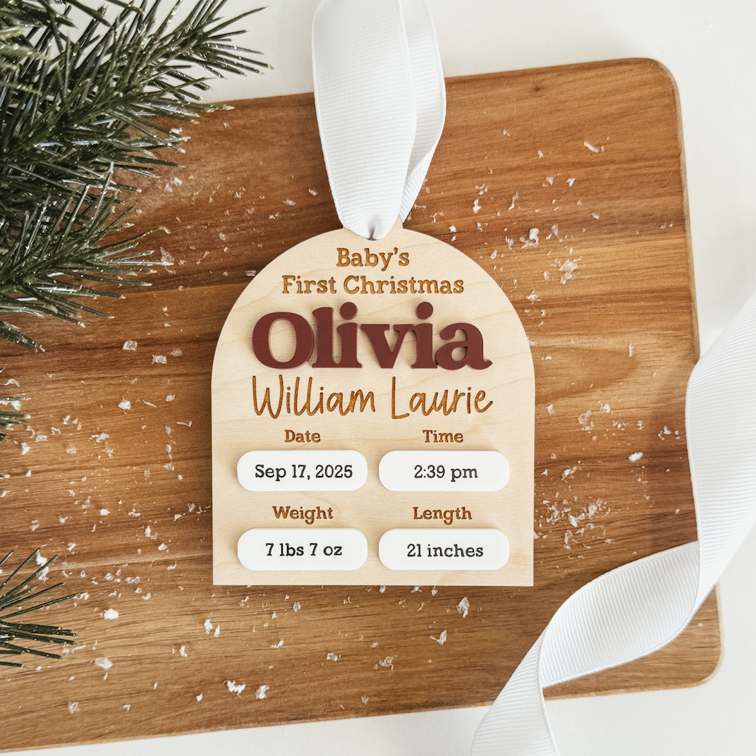 Each newborn ornament is crafted from natural maple wood and is personalized with baby’s name and birth statistics. Finished with a white ribbon for hanging, this ornament is ready to display on your Christmas tree or gift to new parents and grandparents.
