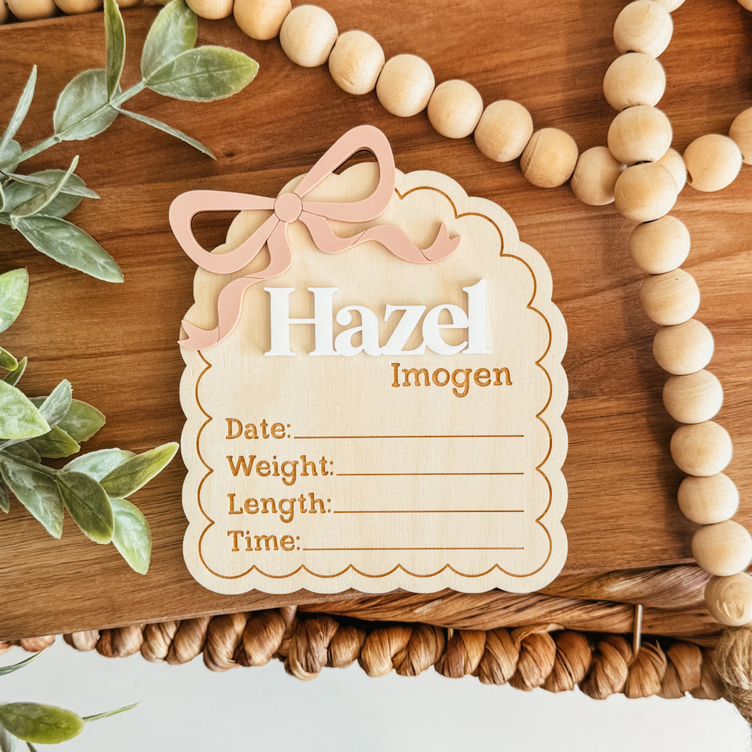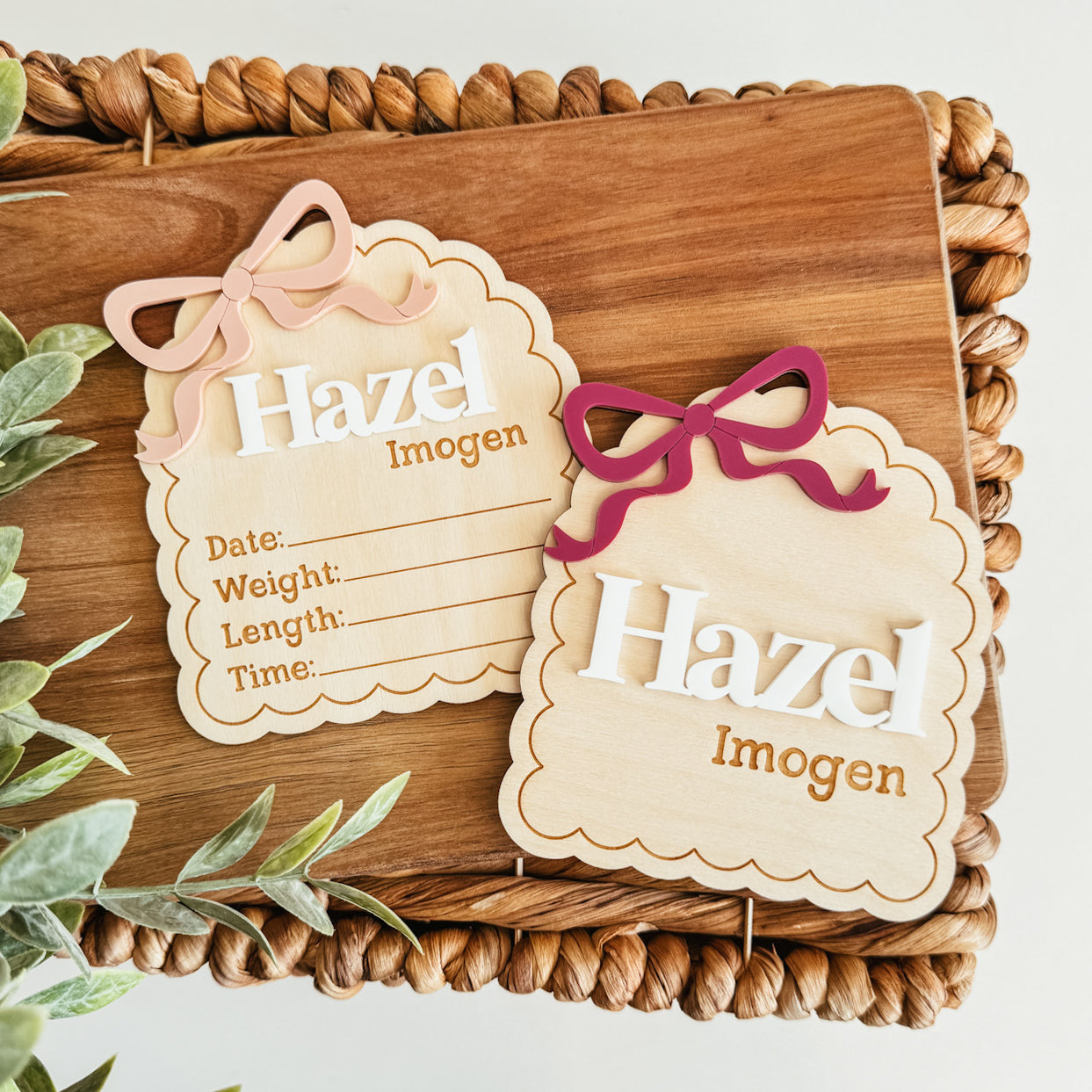 This birth announcement sign features 3D lettering for the first name and a 3D bow frame in the colour of your choice. The remainder of the text/design are engraved into the wood.