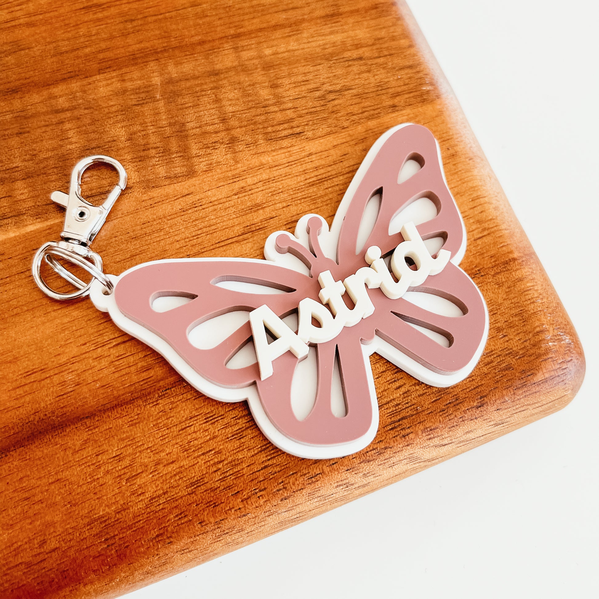 Each bag tag is cut from three layers of acrylic. The base layer is white acrylic and staked on top is the butterfly and name in your choice of colours.