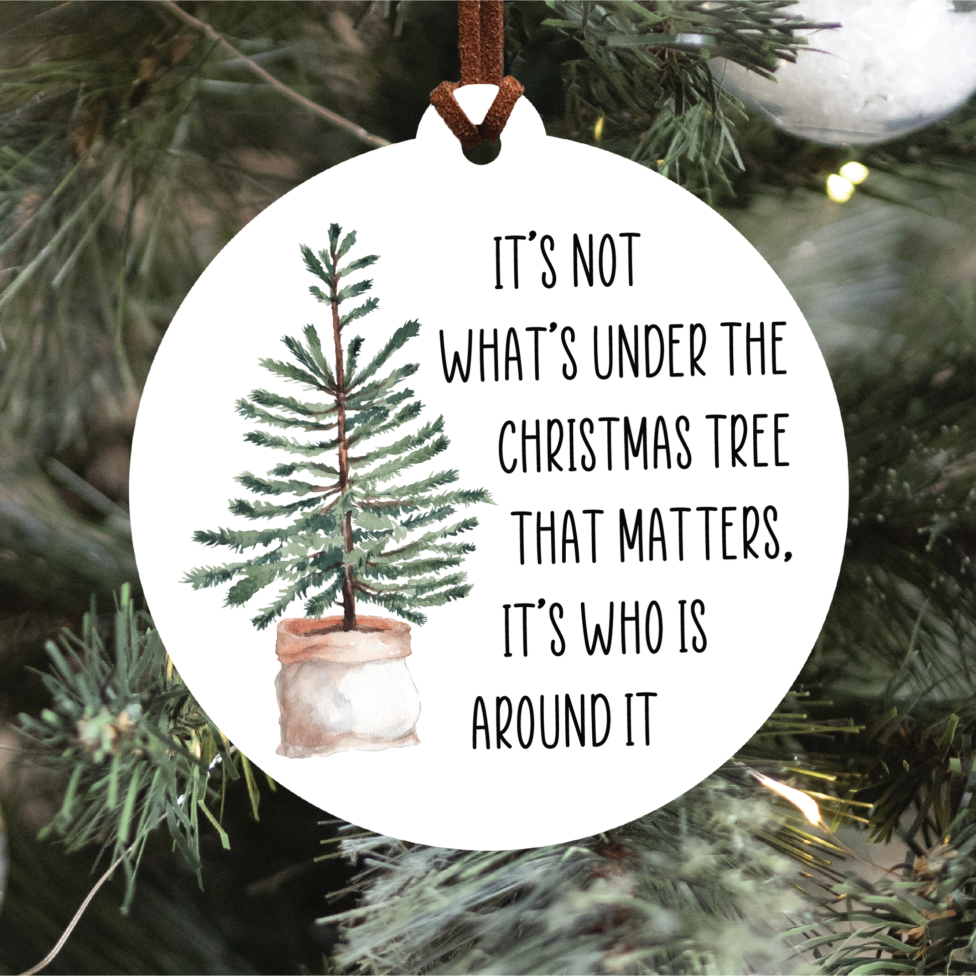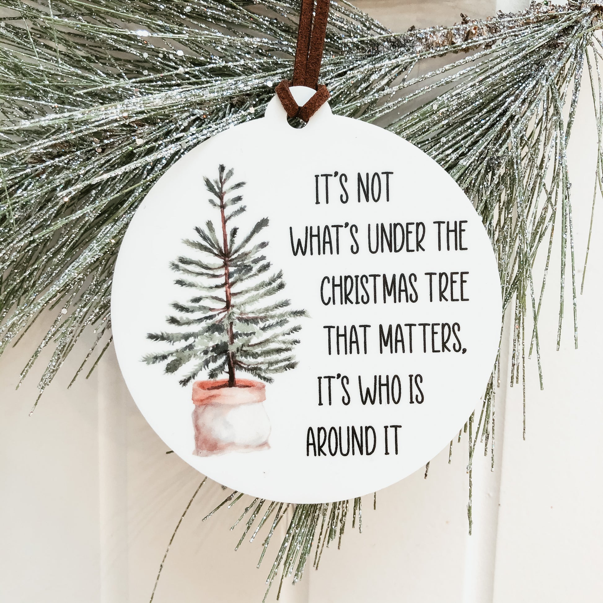 Each ornament is laser cut from 1/8" white acrylic and then printed with permanent ink. They are finished with a brown suede string for a modern look. The back of the ornament will be white.