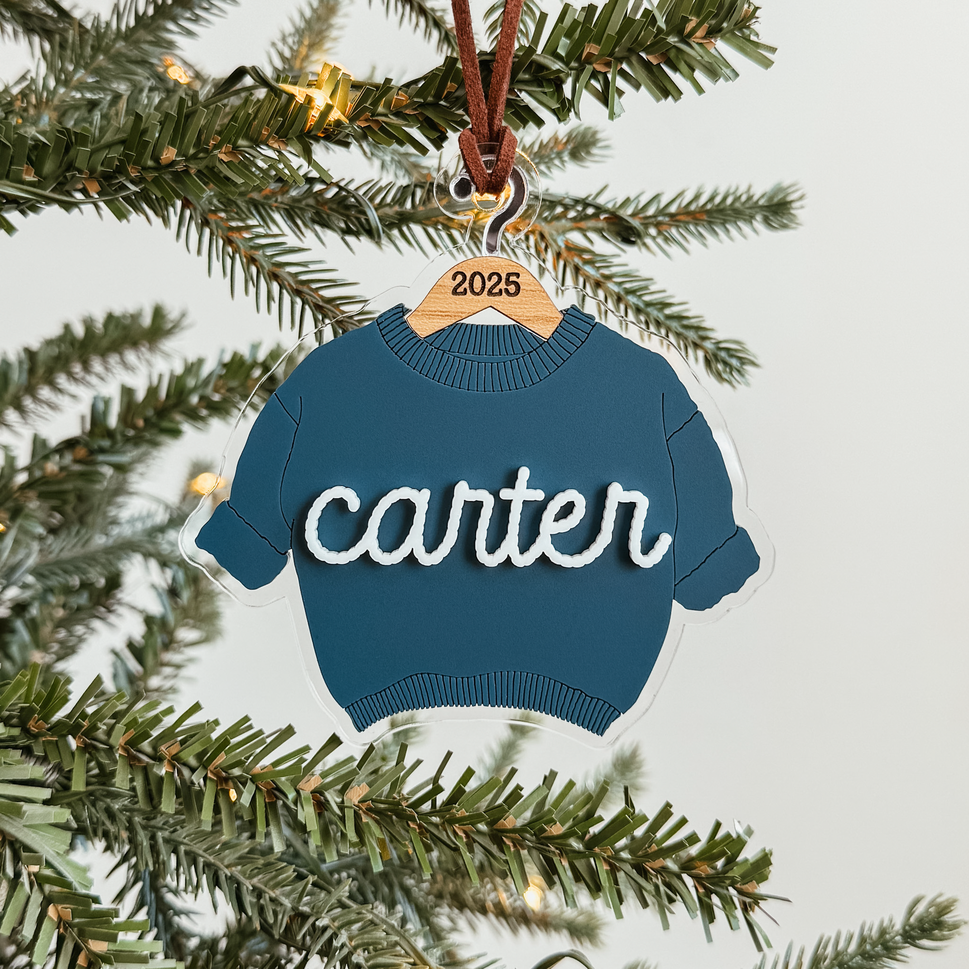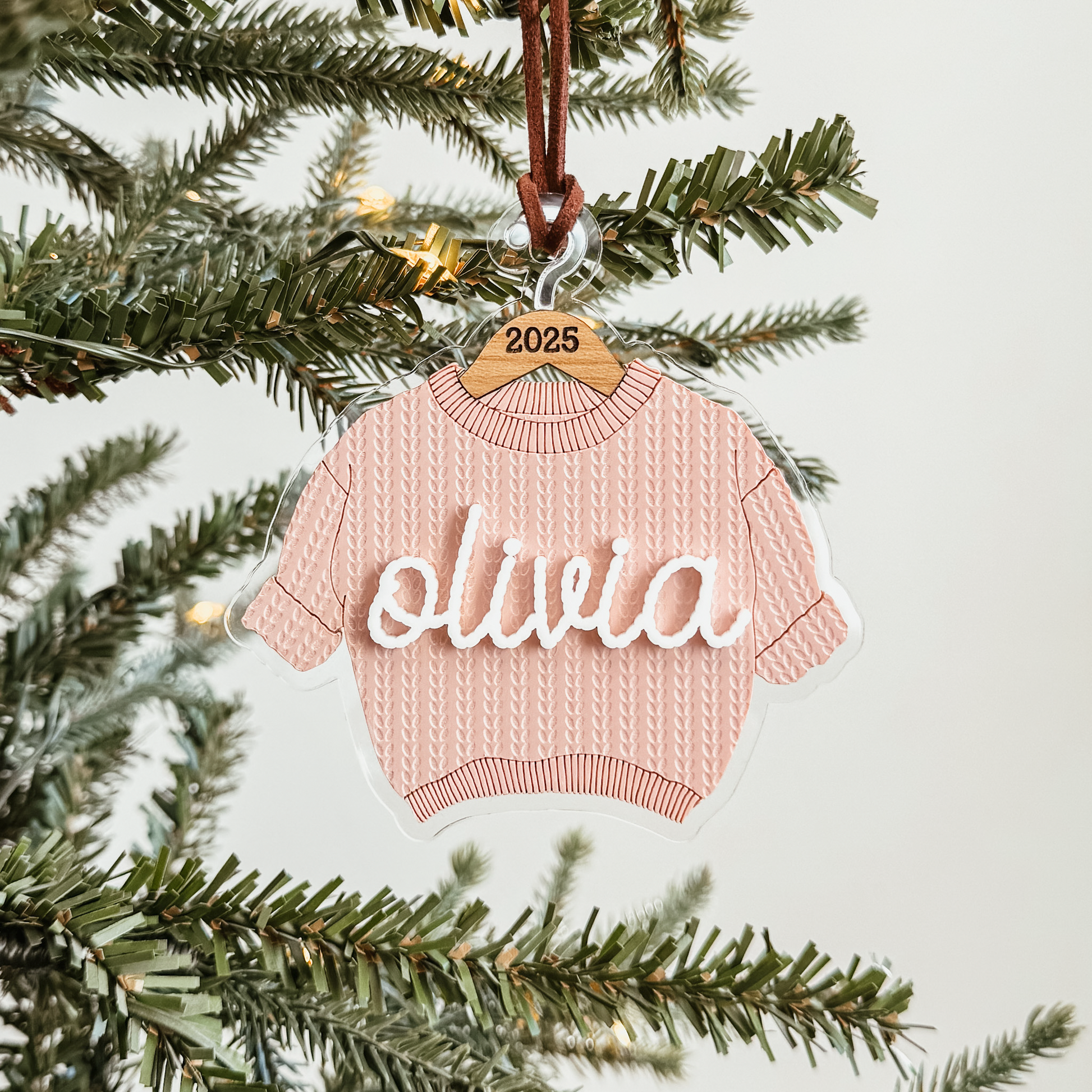 Each ornament features a clear acrylic base topped with a textured cable knit sweater in your choice of colour to match your holiday decor. The 3D name is in white acrylic, styled in a stitching-inspired font to match the sweater theme. The year is included on the hanger, making it a wonderful way to remember a special Christmas, whether it’s for your little one, a child’s first Christmas, or a thoughtful gift for family and friends.