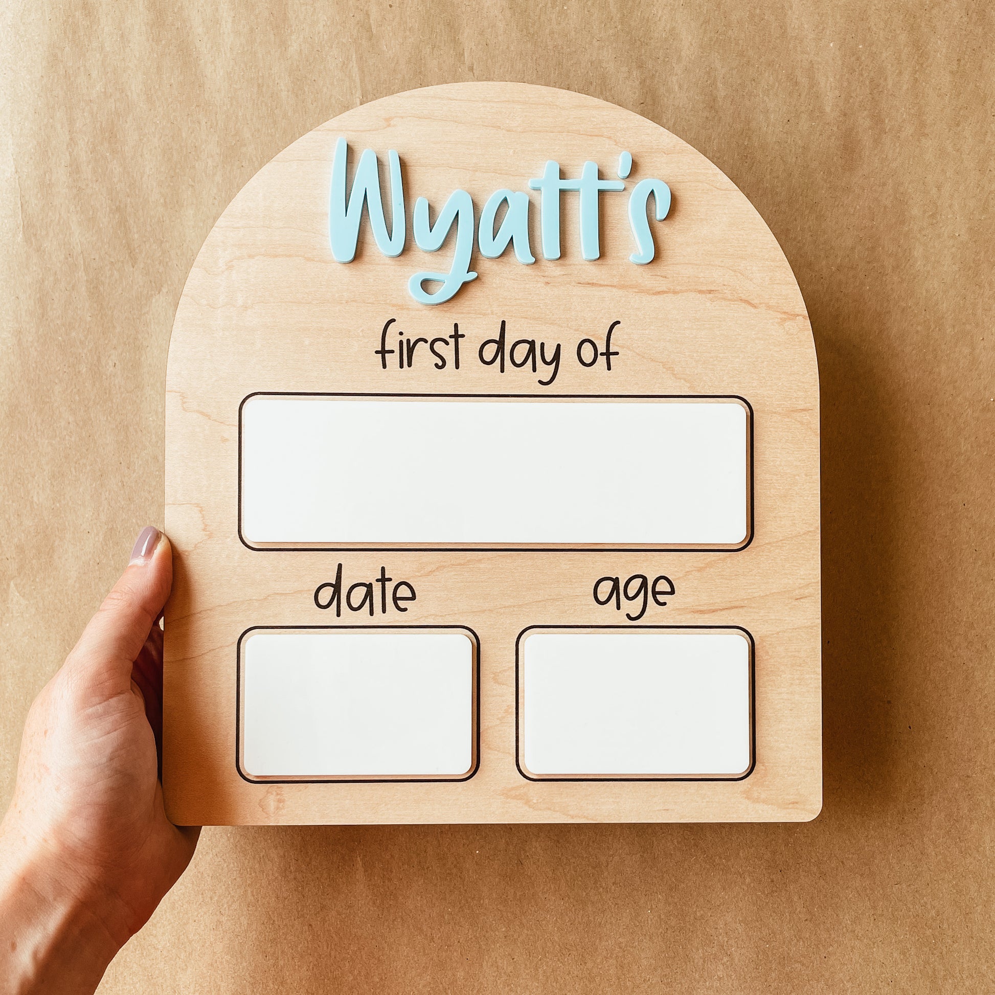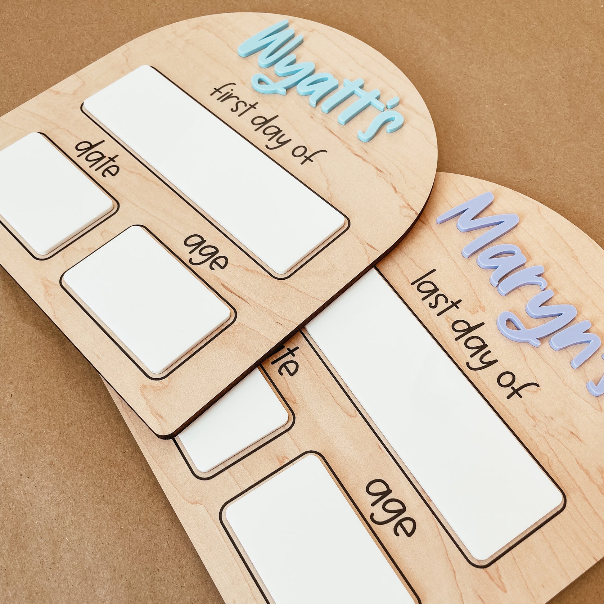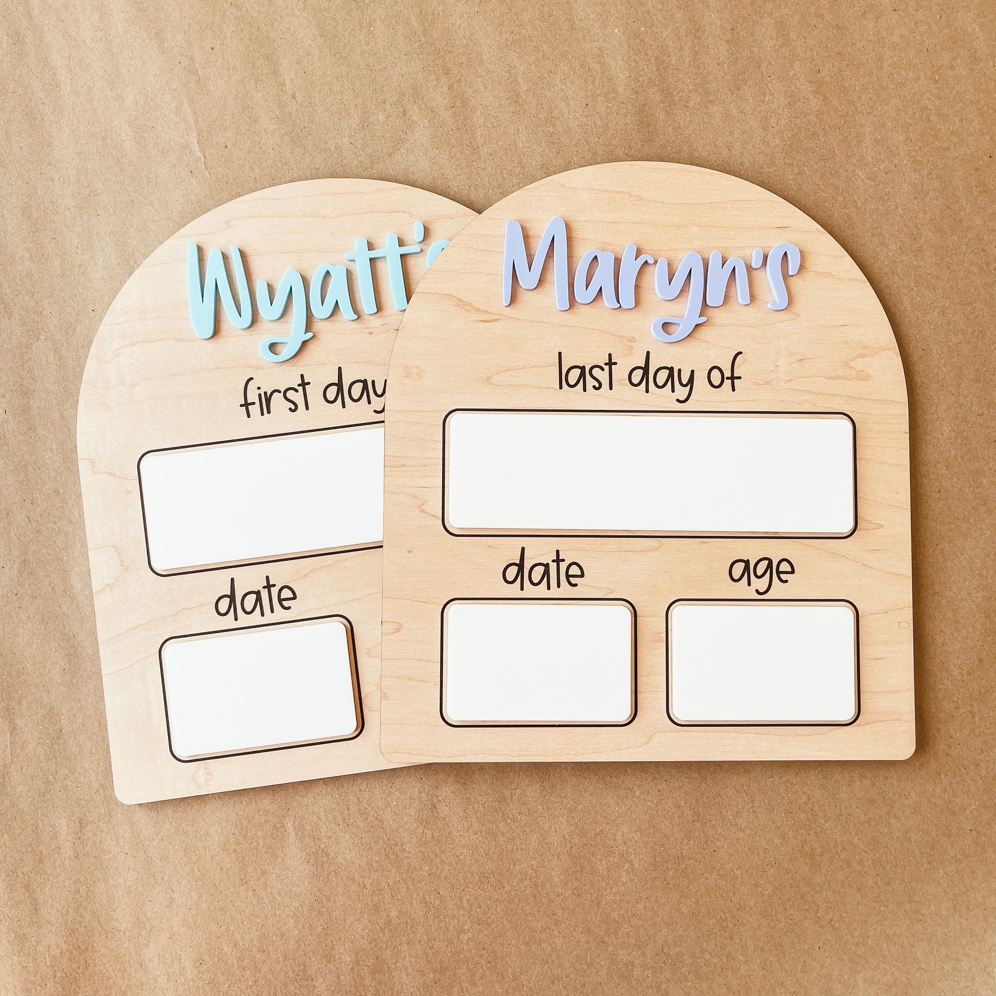 Personalize with your child's name and choose from first day of school, last day of school, or double-sided. 's will be added to the end of the name, including names ending with s. Please specify if a different spelling is preferred.