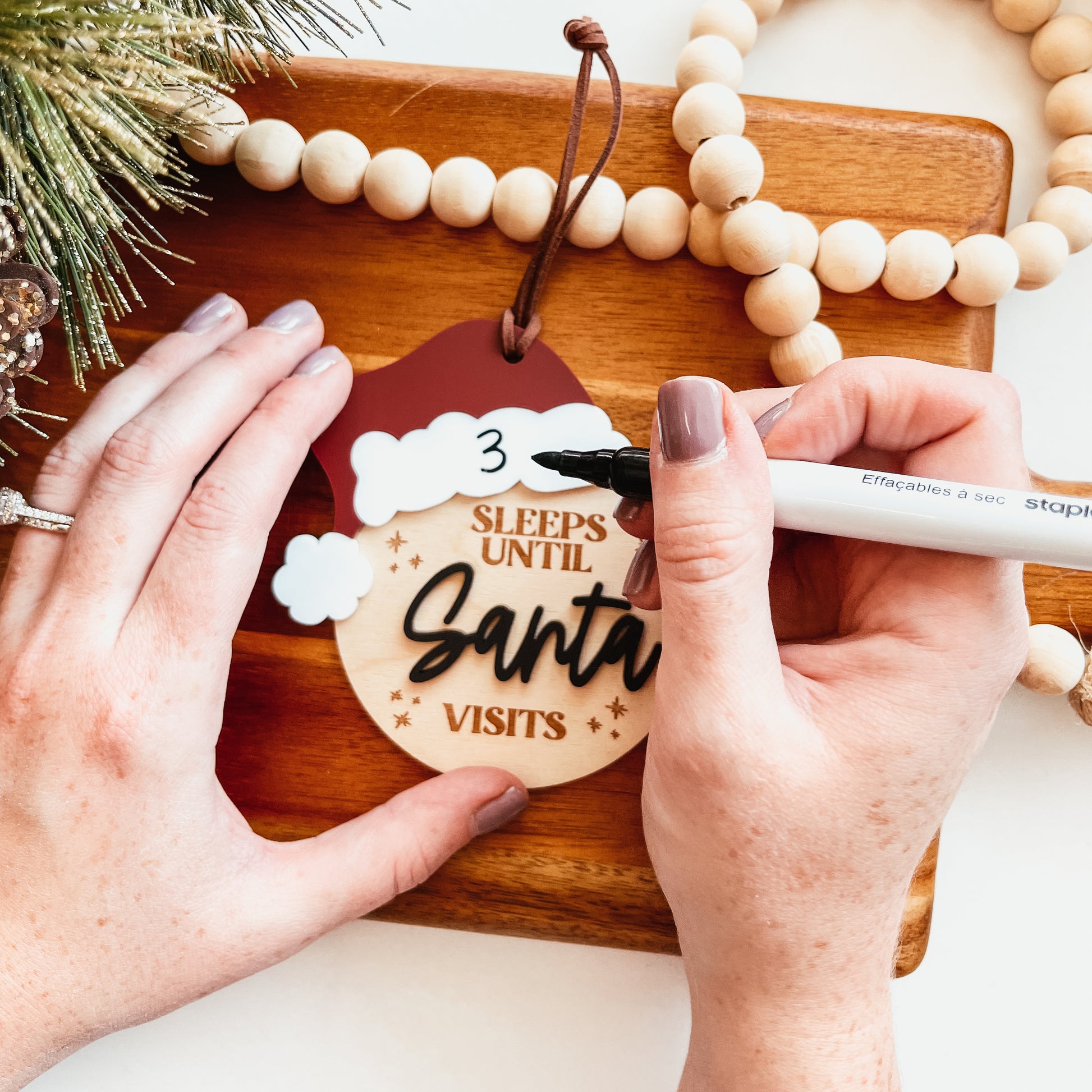 Engraved onto natural birch wood and features a 3D Santa hat. The white trim and pom on the hat are dry-erase and can be written on with a standard dry-erase marker (not included). Finished with a brown suede string and individually packaged.