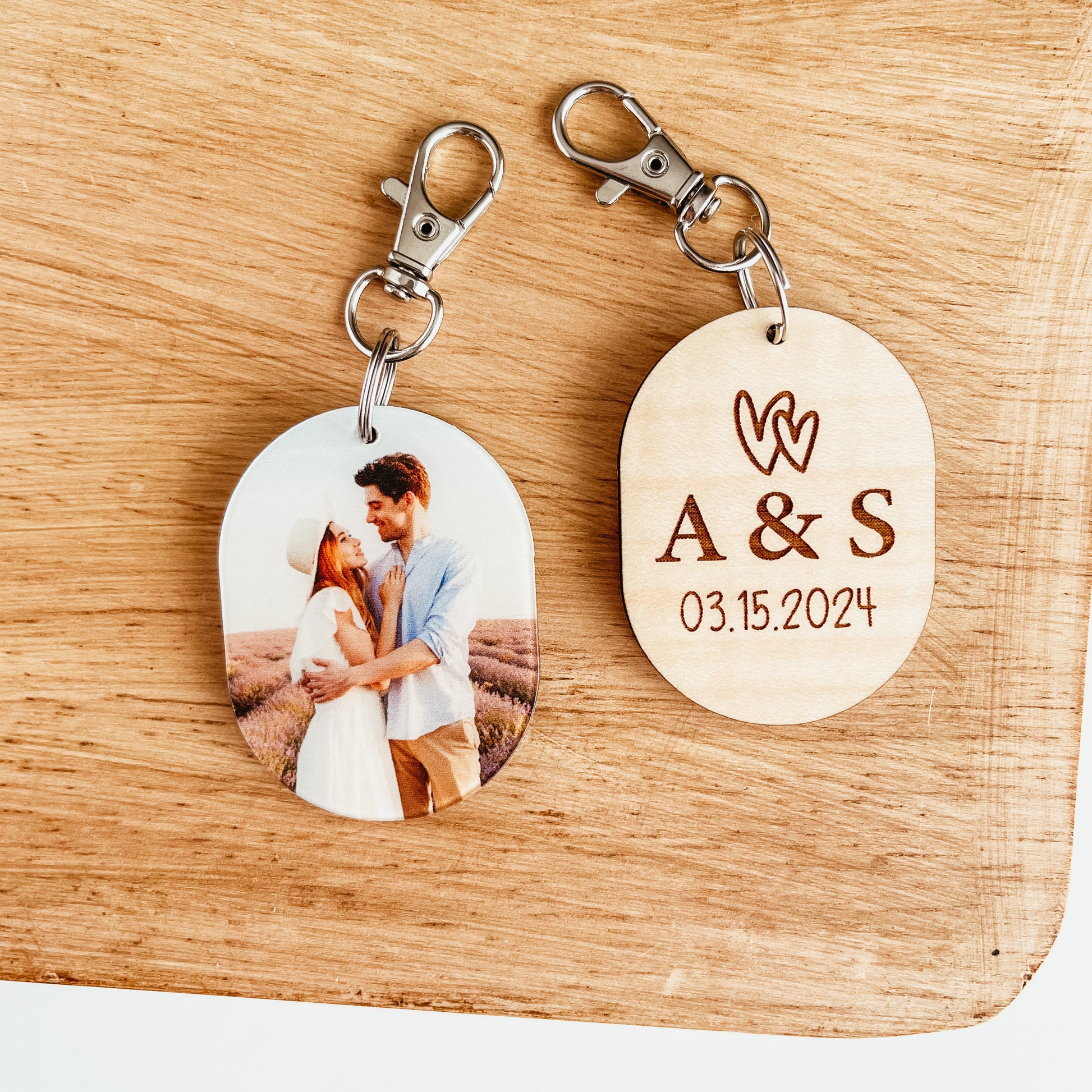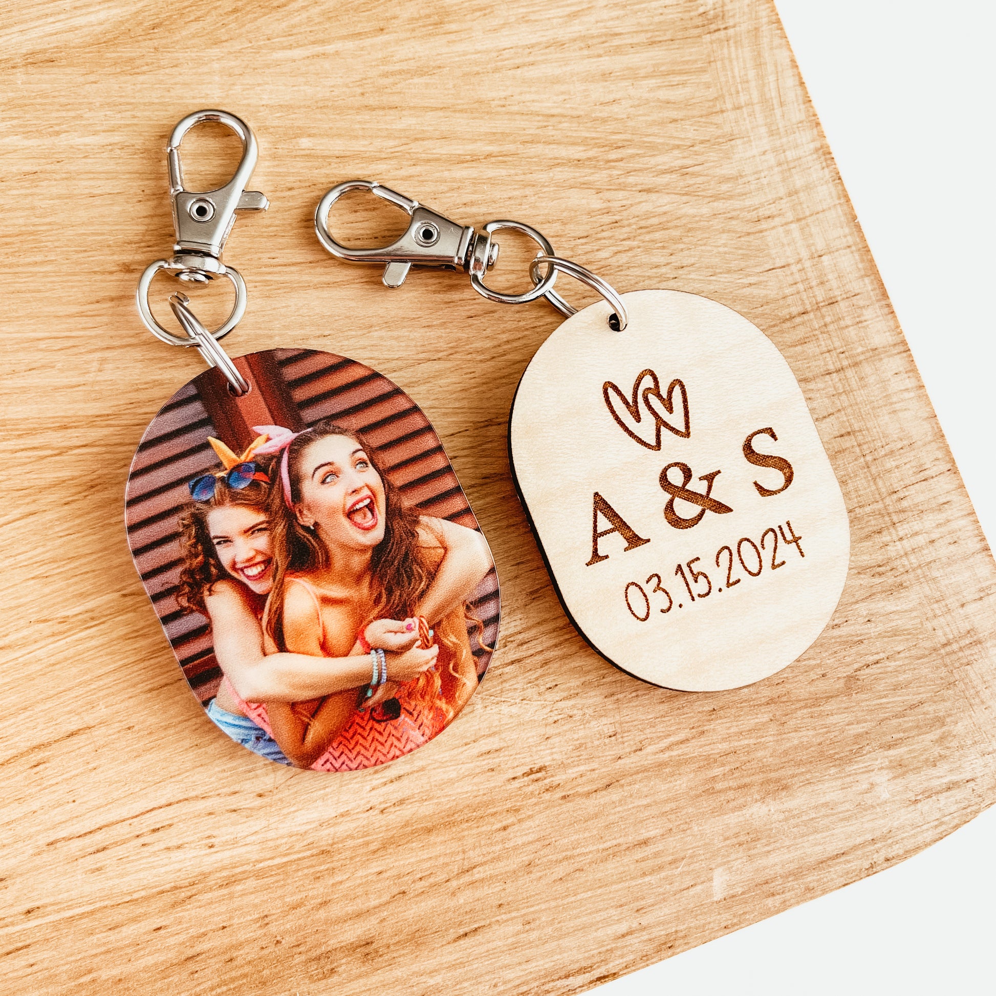 Celebrate your other half with this double-sided monogram photo keychain! This style from our collection of custom photo keyrings makes a great gift for an anniversary. Personalized with a photo on the front and date/initials on the back.