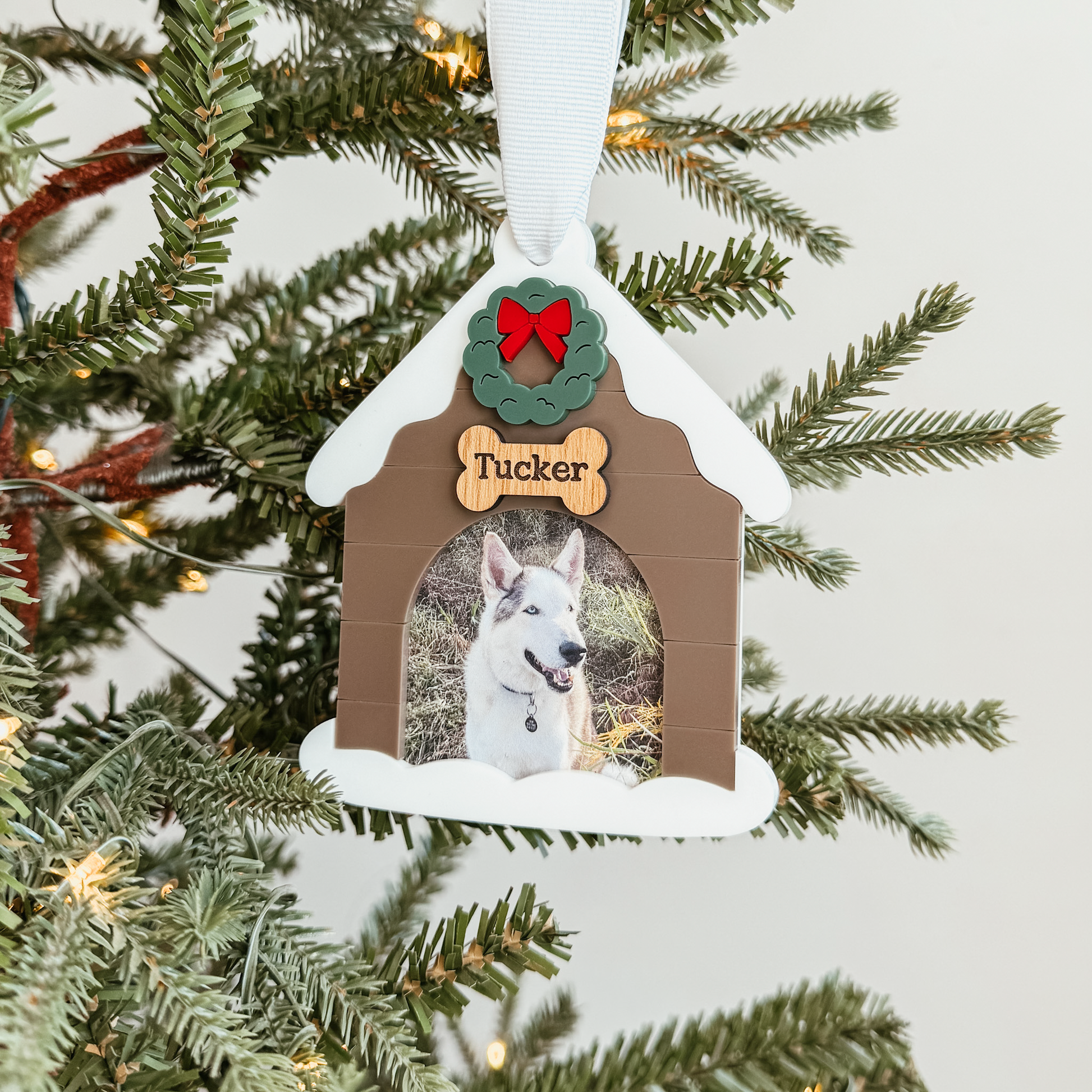 Shaped like a dog house, each ornament features a photo of your pet printed directly onto the acrylic surface for a high-quality, lasting finish. A 3D wreath detail adds festive charm, and the wooden bone doorplate is personalized and engraved with your pet’s name (we can add the name here as well if you'd like). The dog house comes in your choice of colour, so you can match it perfectly to your decor or your pup’s personality!