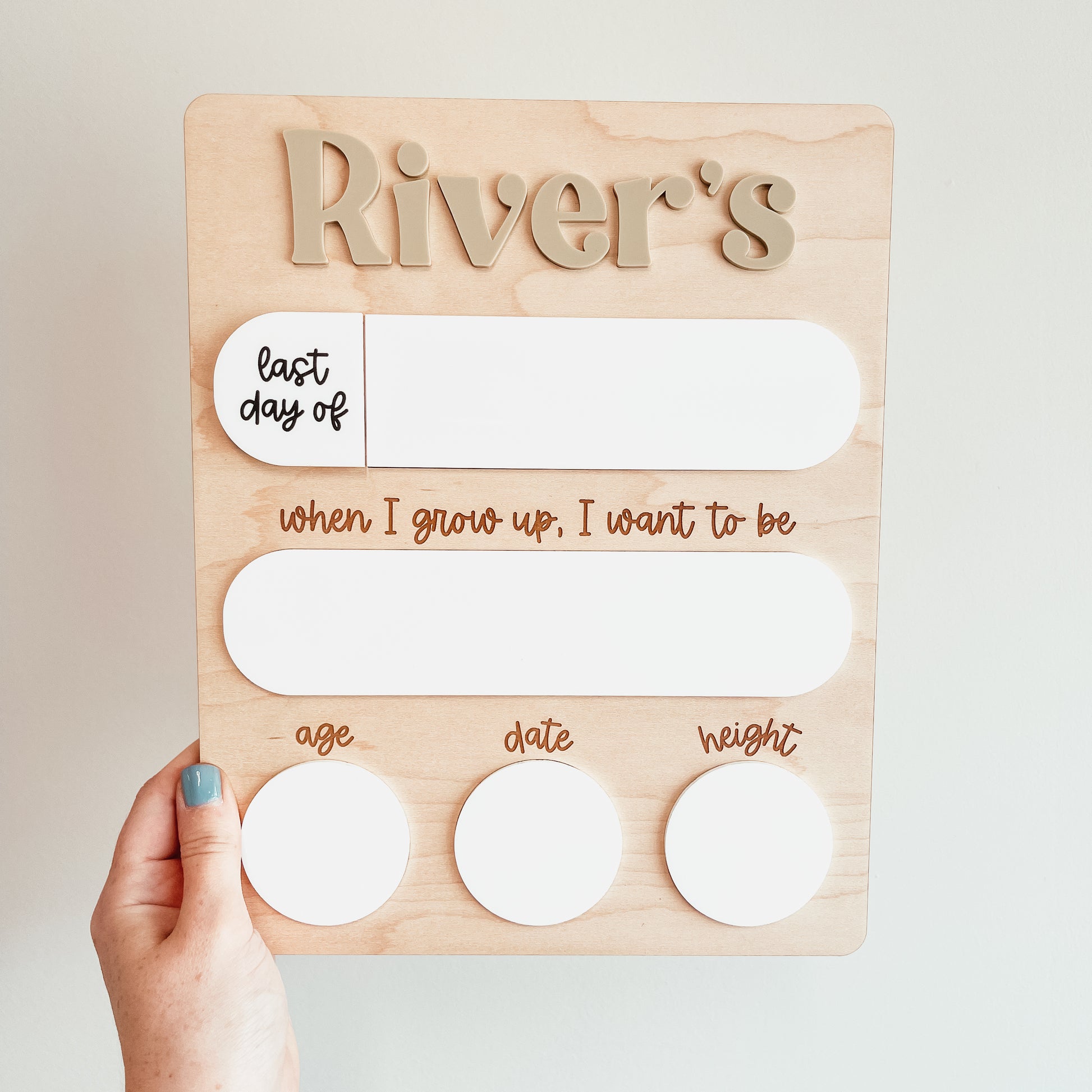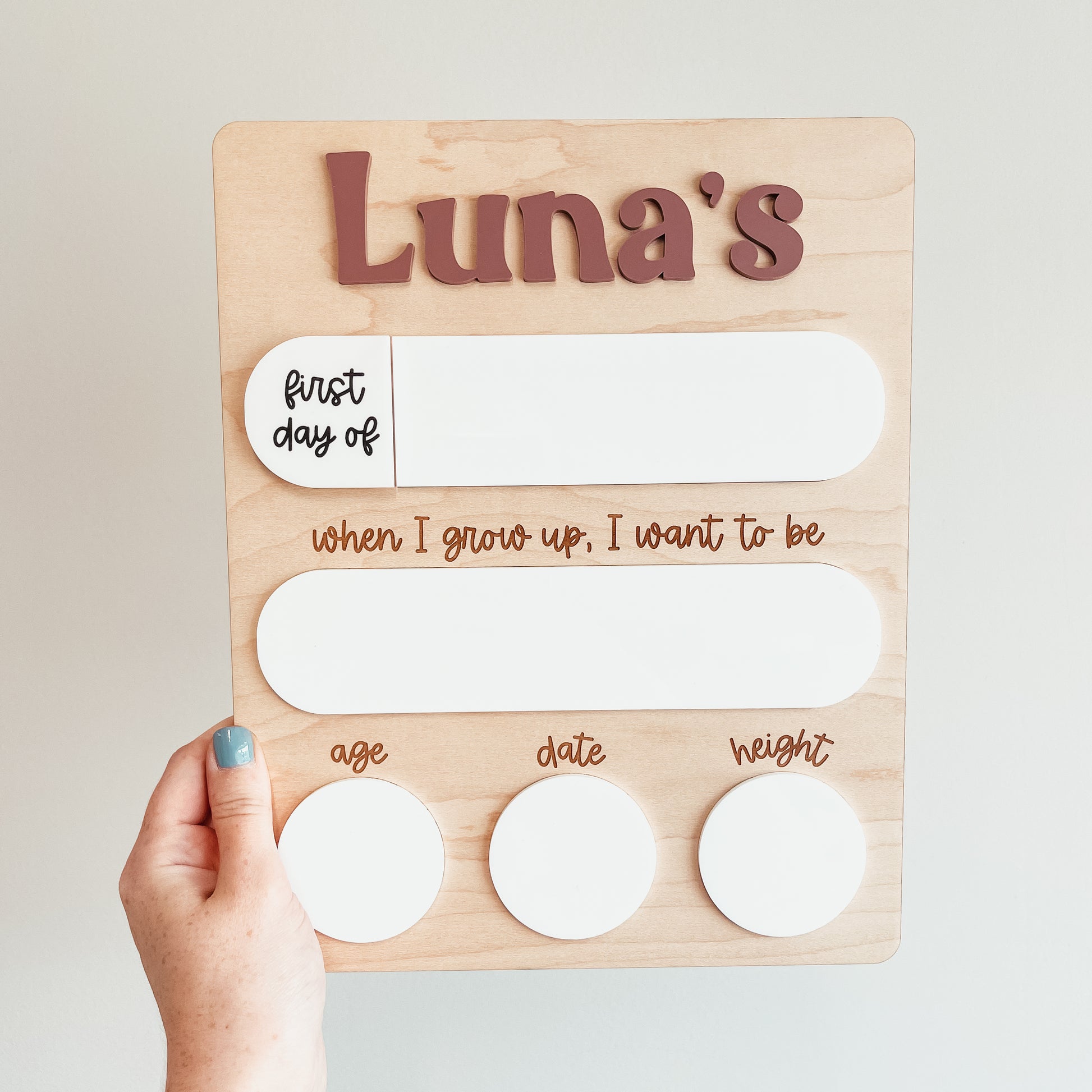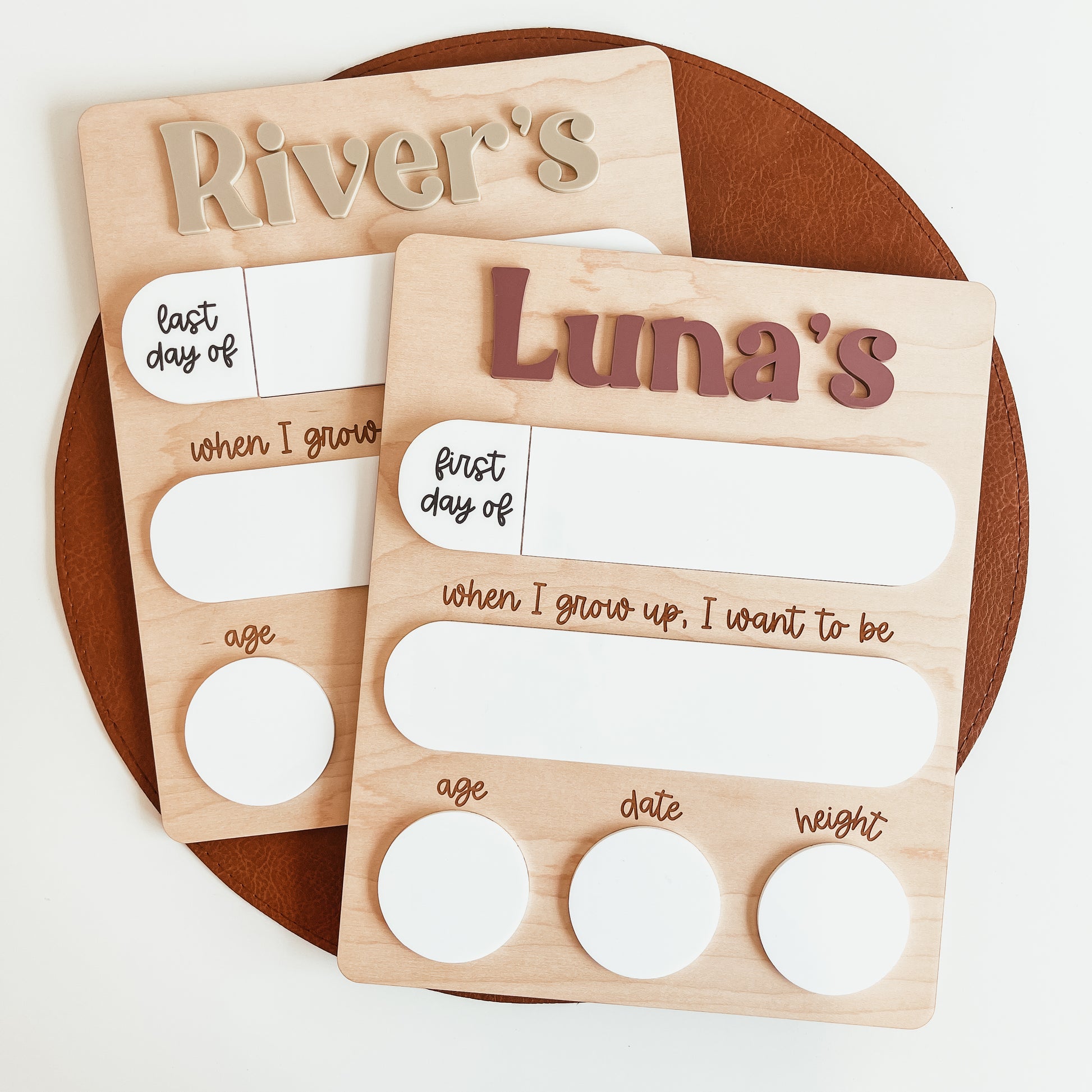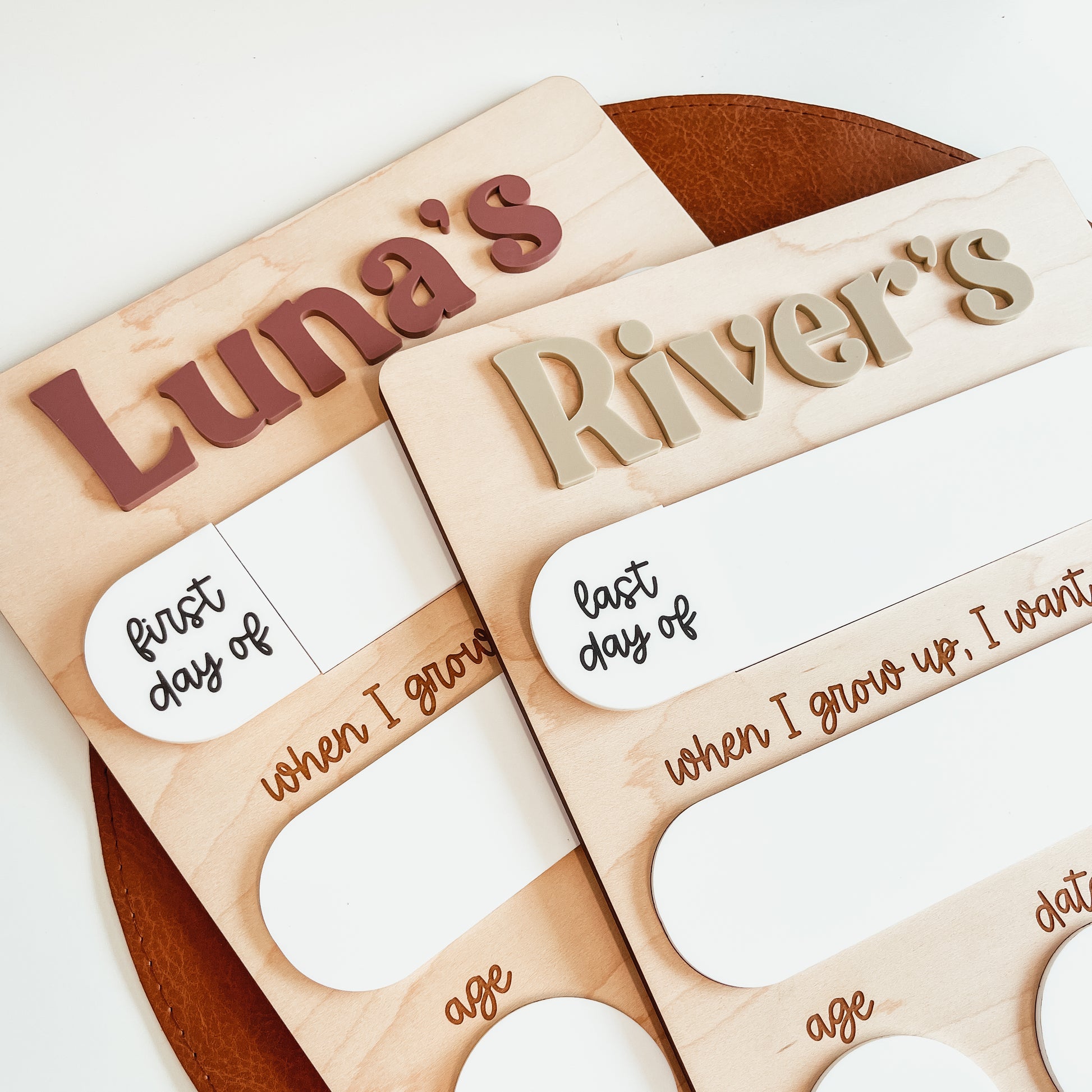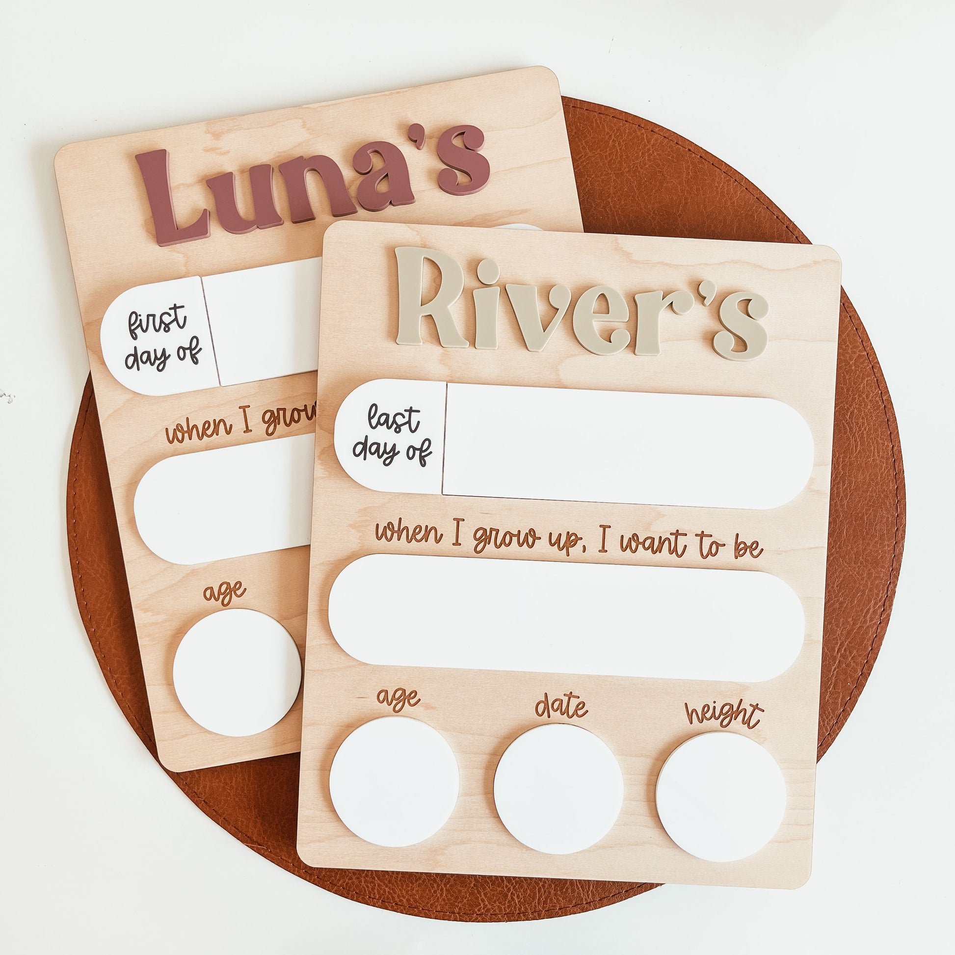 Personalize with your child's name in the colour of your choice. Your purchase includes the interchangeable pieces for first day and last day. 's will be added to the end of the name, including names ending with s. Please specify if a different spelling is preferred.