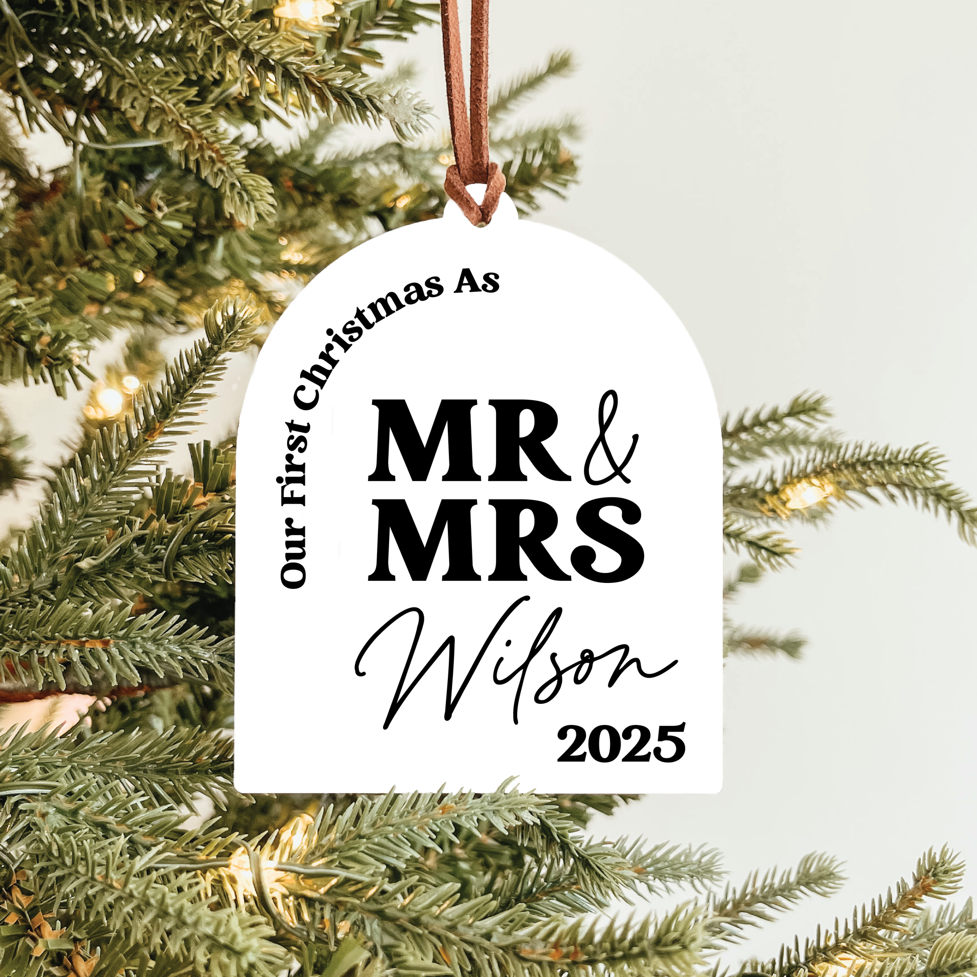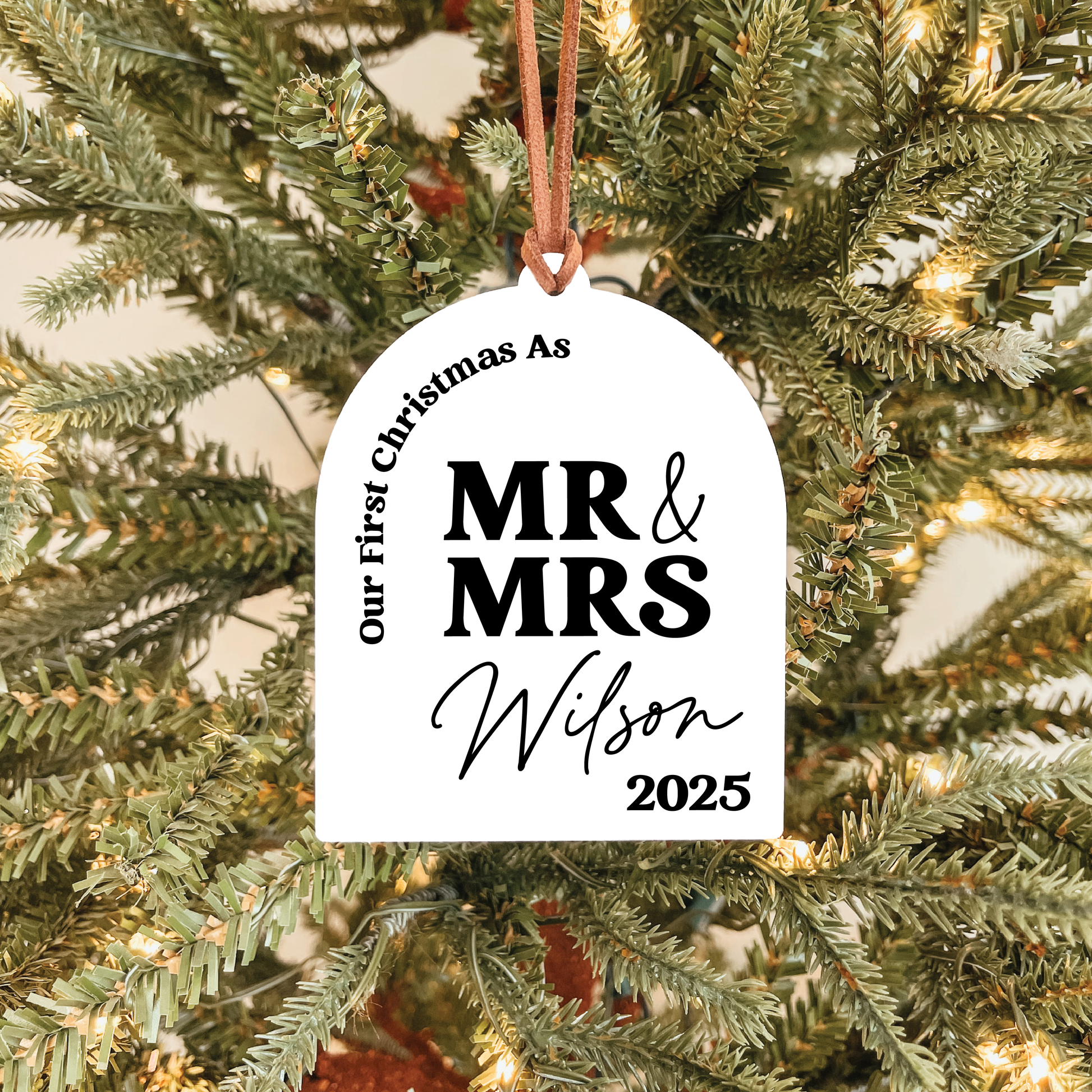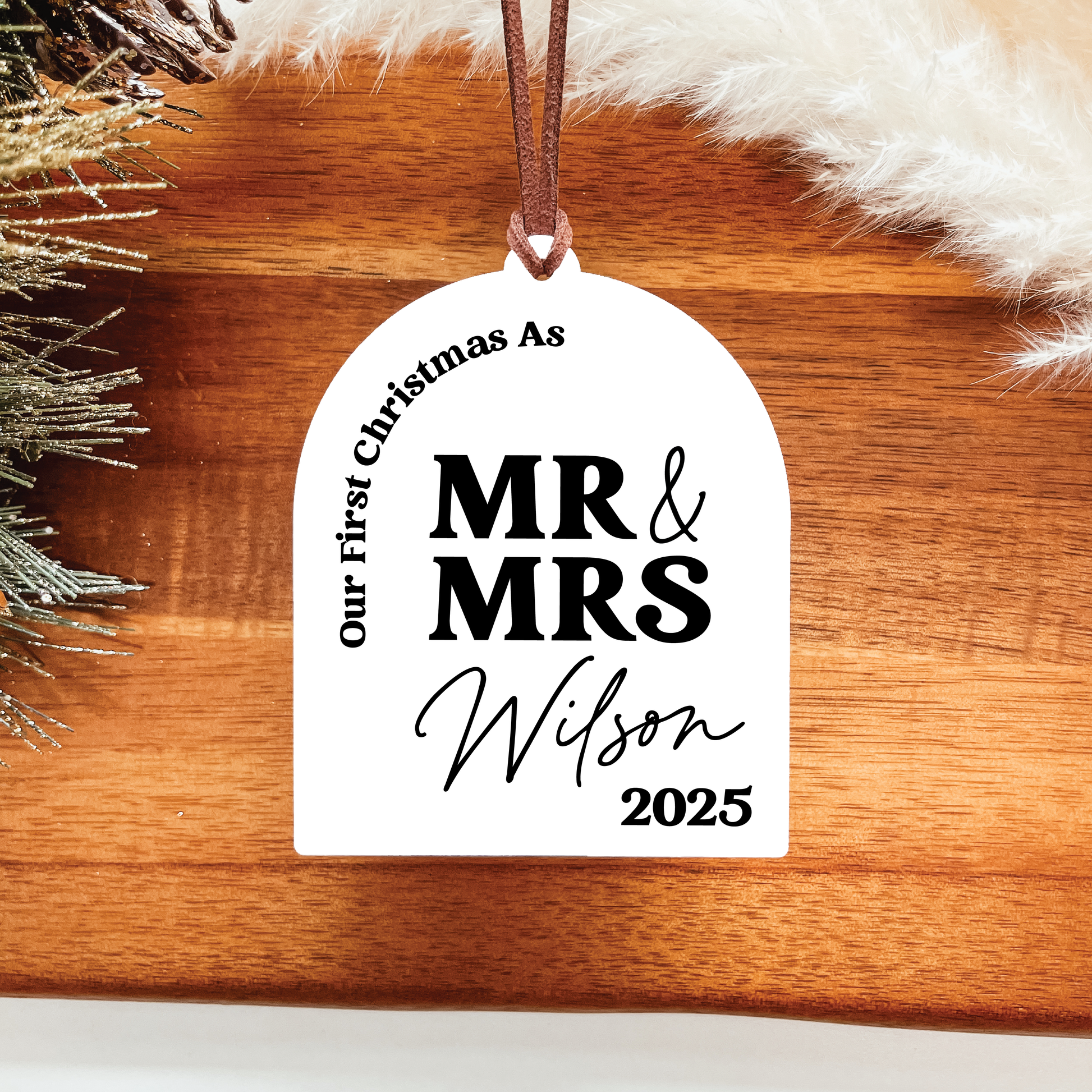 Each ornament is laser cut from 1/8" white acrylic and then printed with permanent ink. They are finished with a brown suede string for a modern look. One side will be printed with your photo and text; the other side will be white.