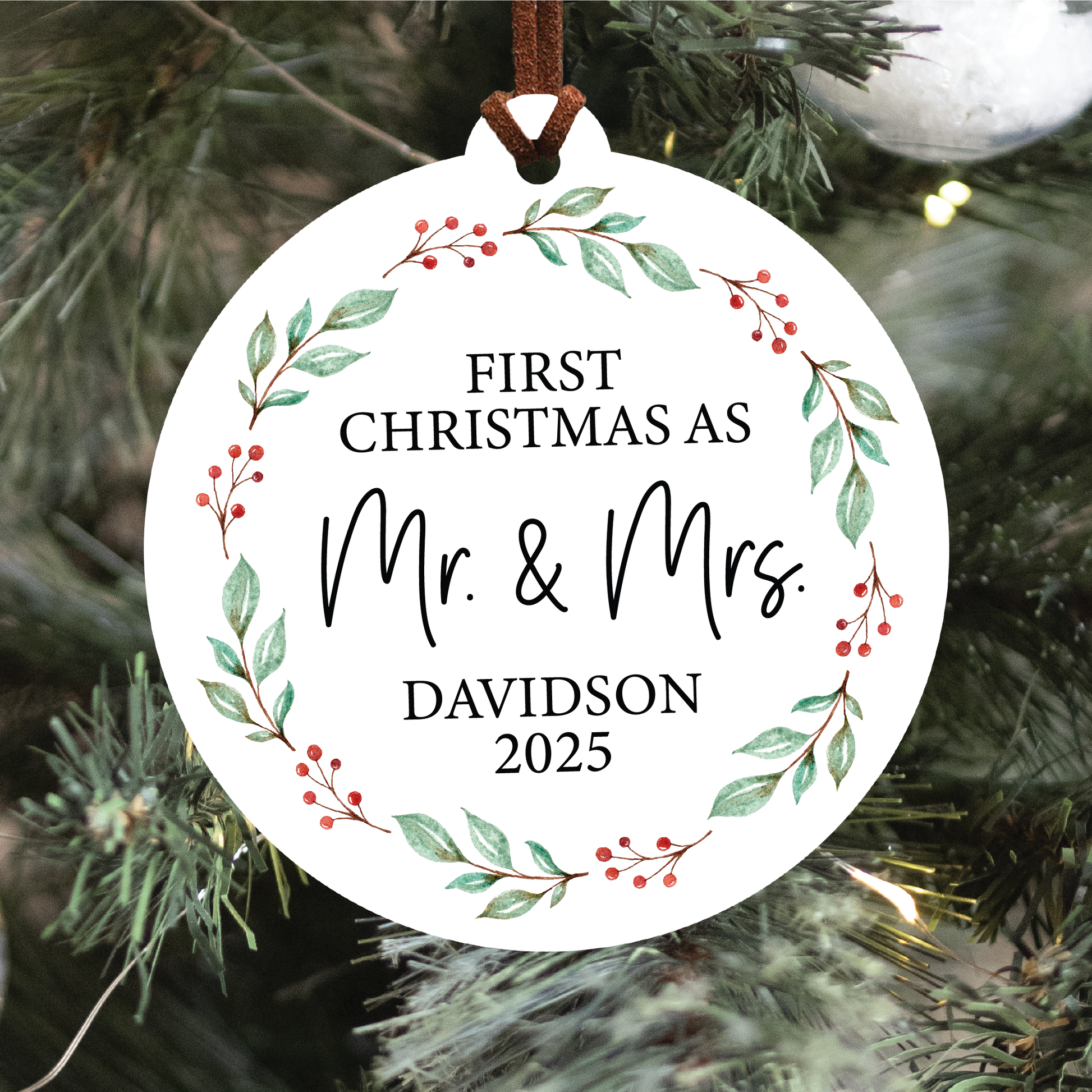 Each ornament is laser cut from 1/8" white acrylic and then printed with permanent ink. They are finished with a brown suede string for a modern look. One side will be printed with your photo and text; the other side will be white.