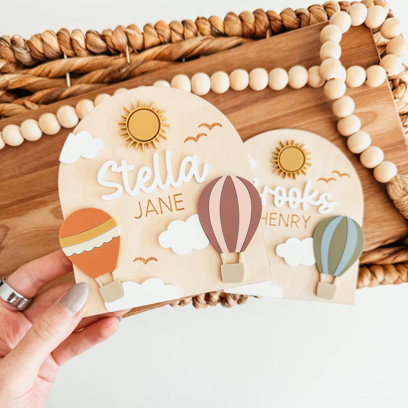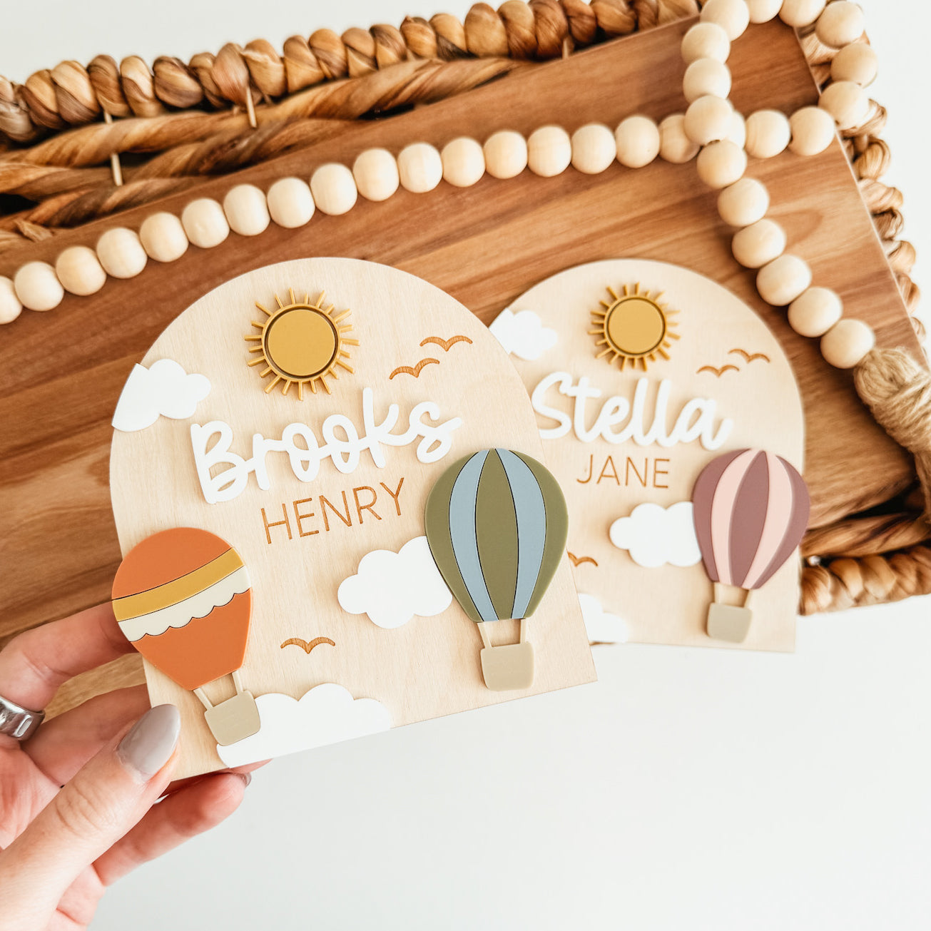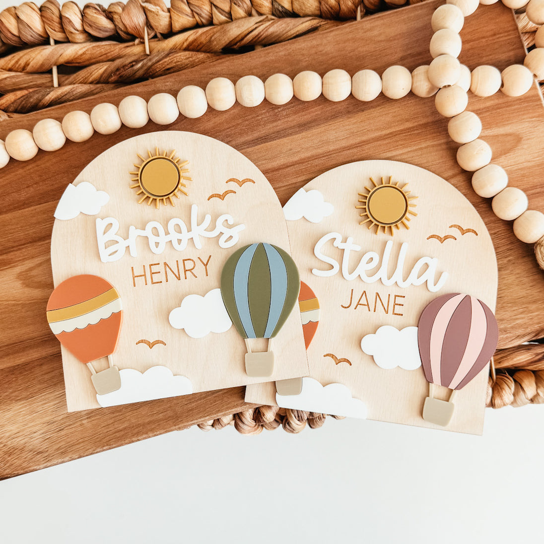 Each baby name sign is cut from 1/8 inch thick baltic birch and measures 5 inches tall x 4.7 inches wide. This style features 3D elements, including hot air balloons!