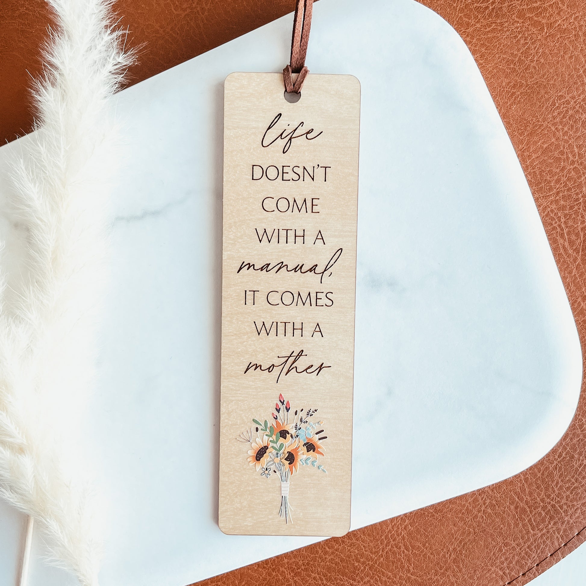 Each bookmark is cut from 1/8 inch thick maple veneer and engraved. The florals are printed with ink.