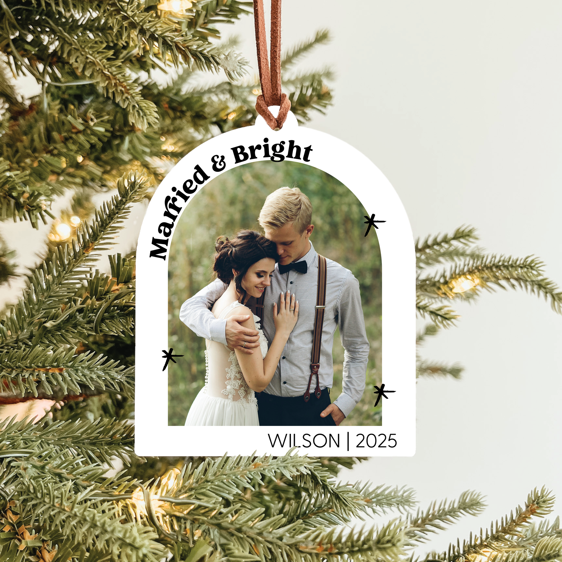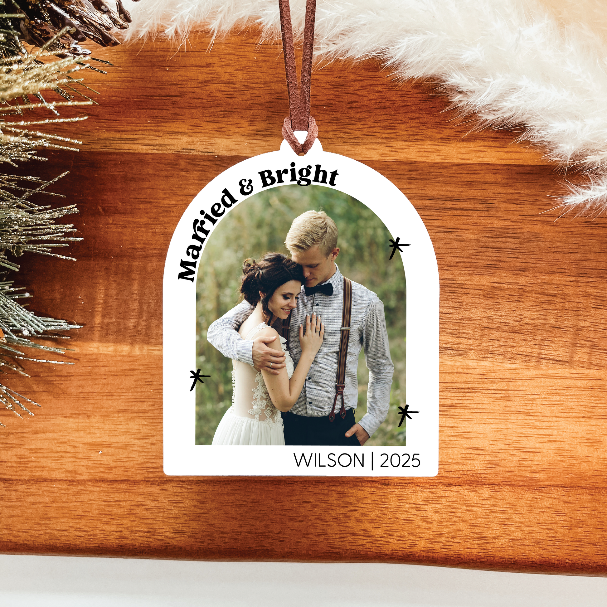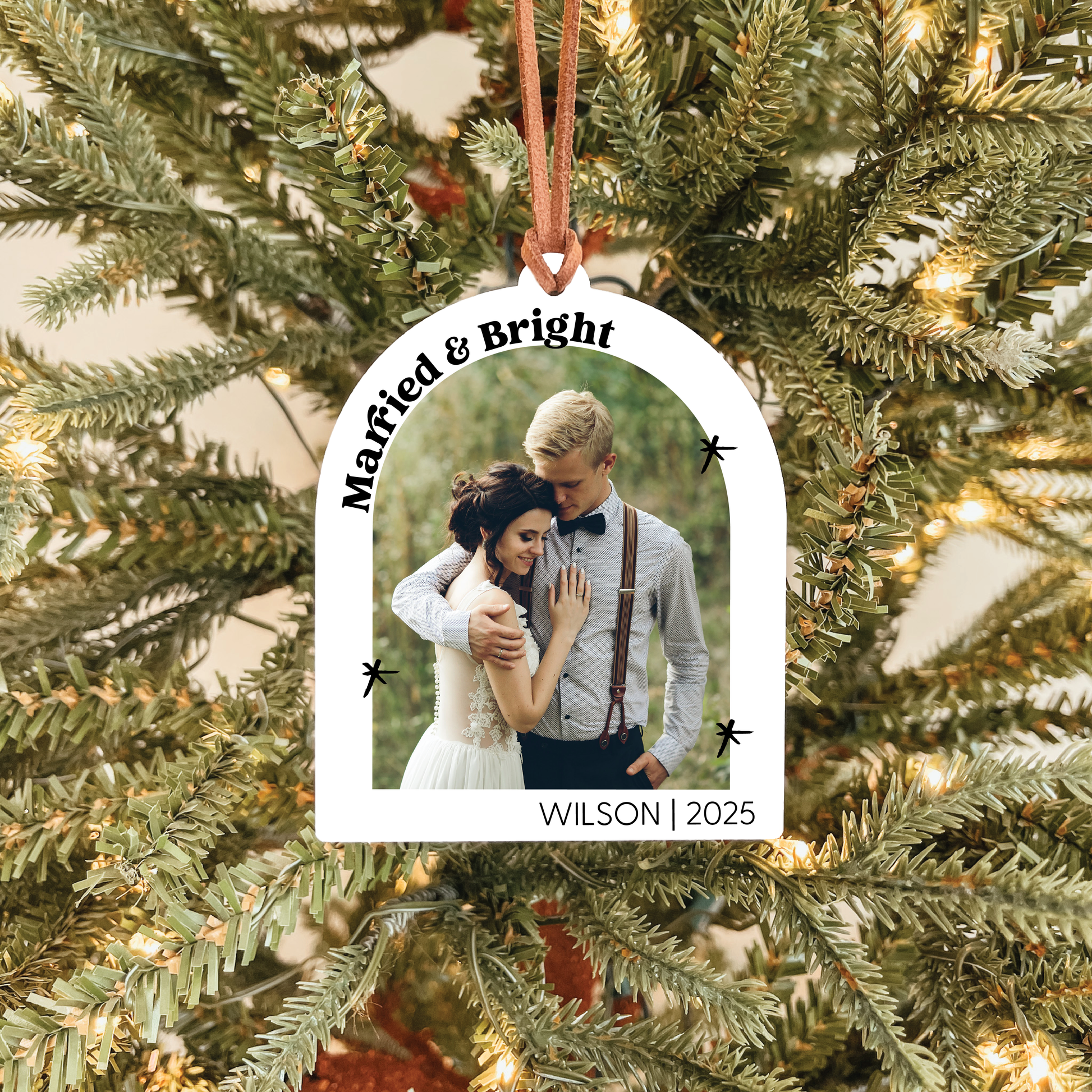 Each ornament is laser cut from 1/8" white acrylic and then printed with permanent ink. They are finished with a brown suede string for a modern look. One side will be printed with your photo and text; the other side will be white.
