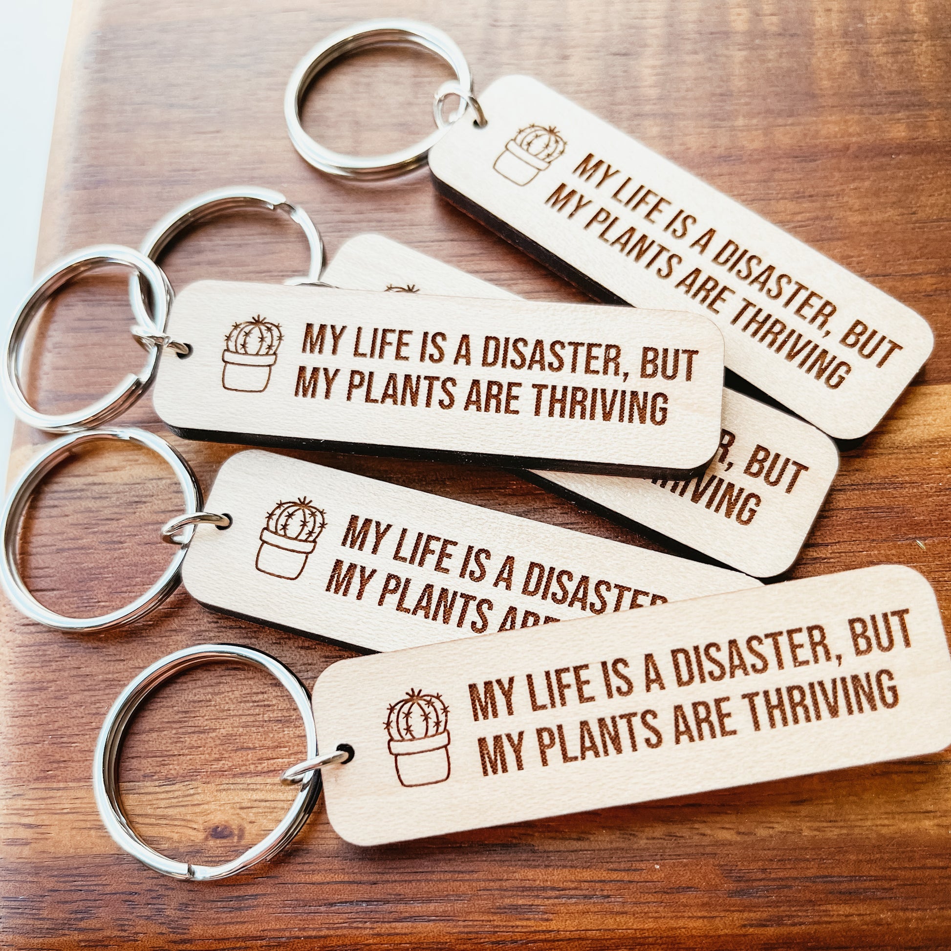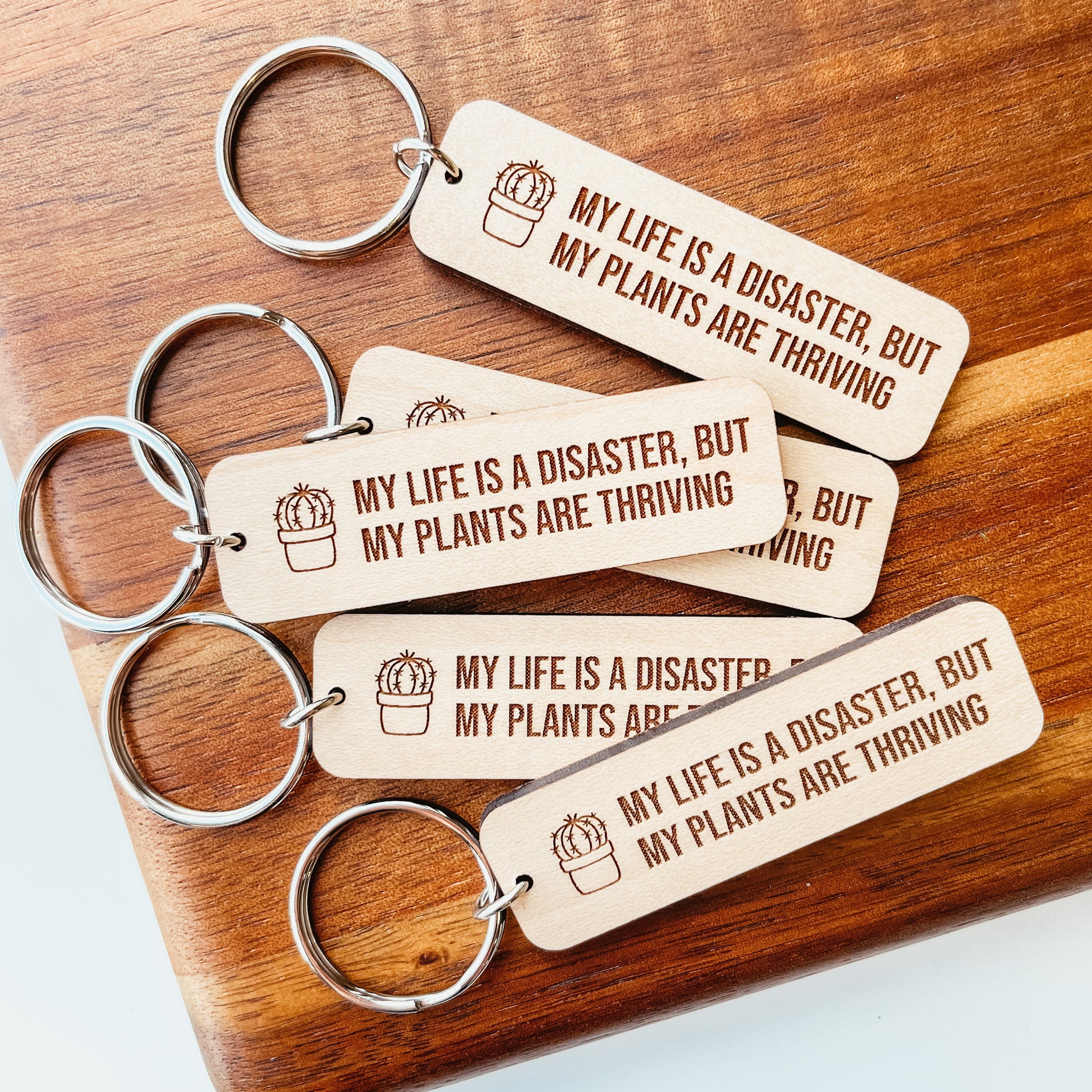 Our wooden keychains are cut from premium-grade, laminated maple and engraved with our studio laser.
