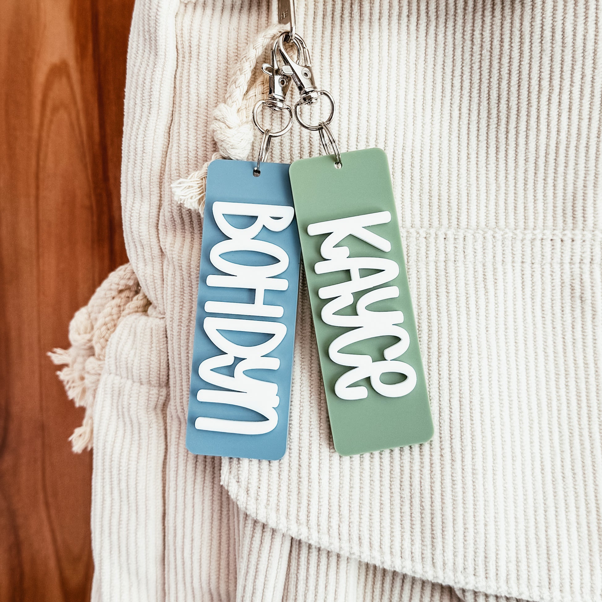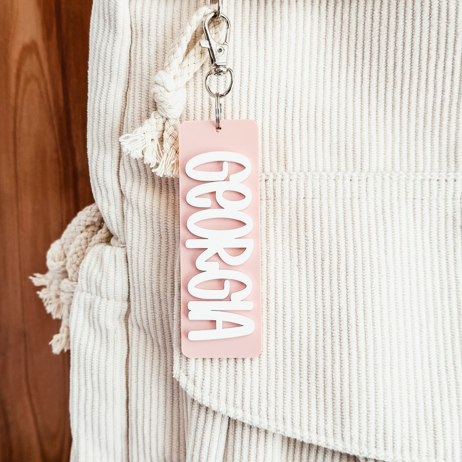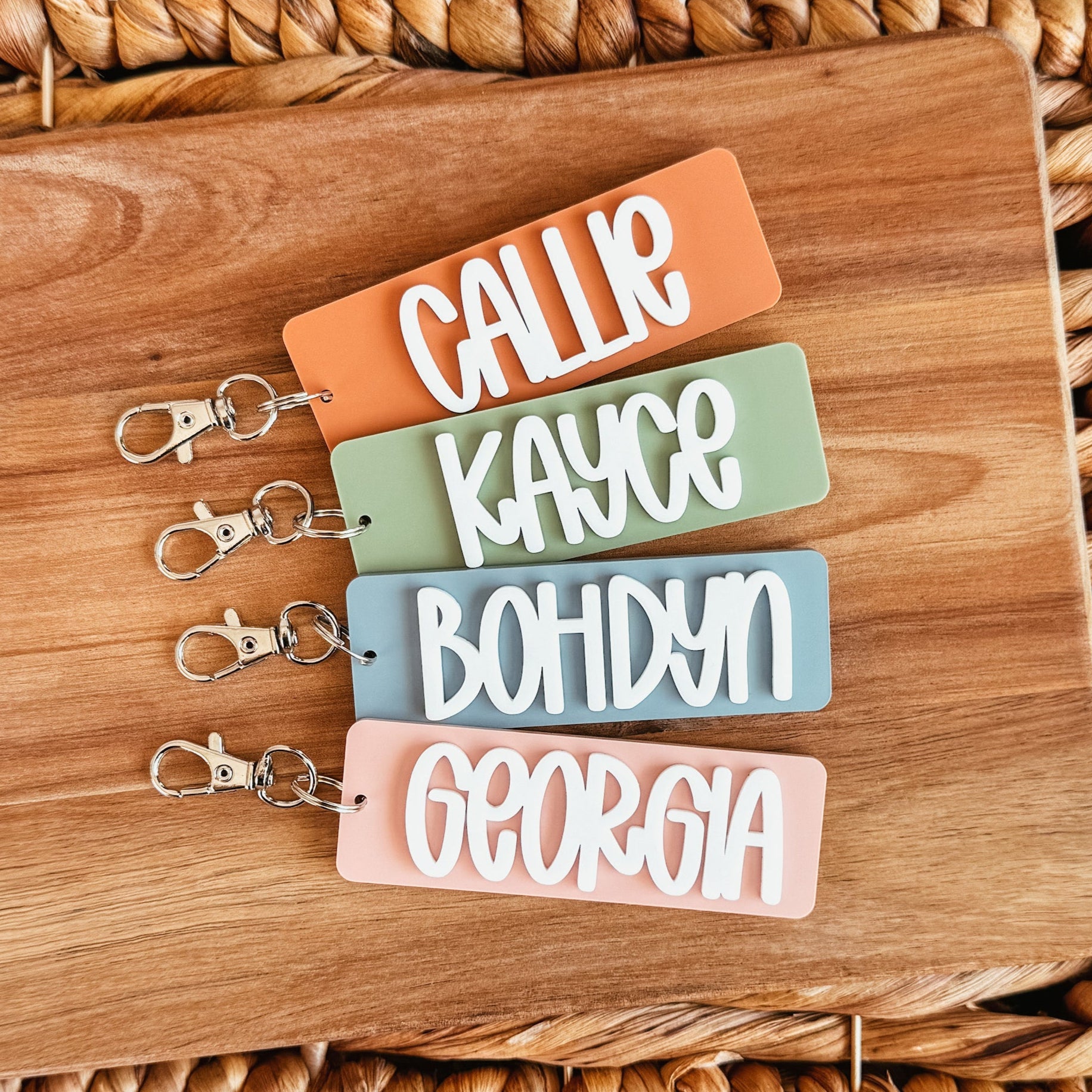 Each name keychain is cut from two layers of coloured acrylic. Choose from our selection of 30 colours and personalize with the name of your choice!