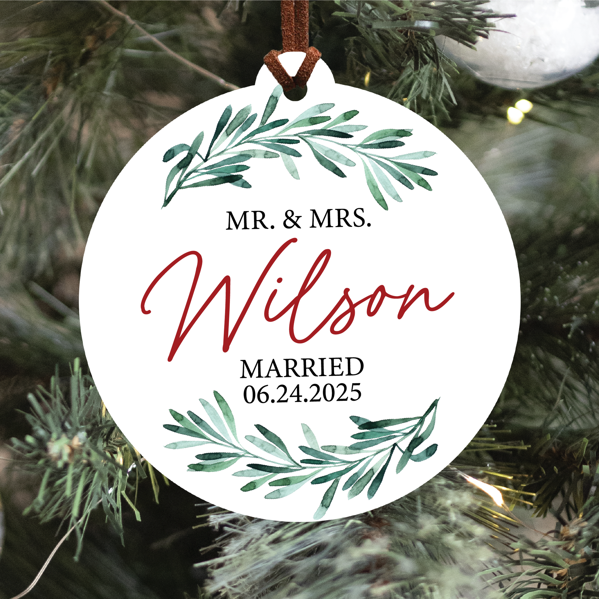 Each ornament is laser cut from 1/8" white acrylic and then printed with permanent ink. They are finished with a brown suede string for a modern look. The back of the ornament will be white.