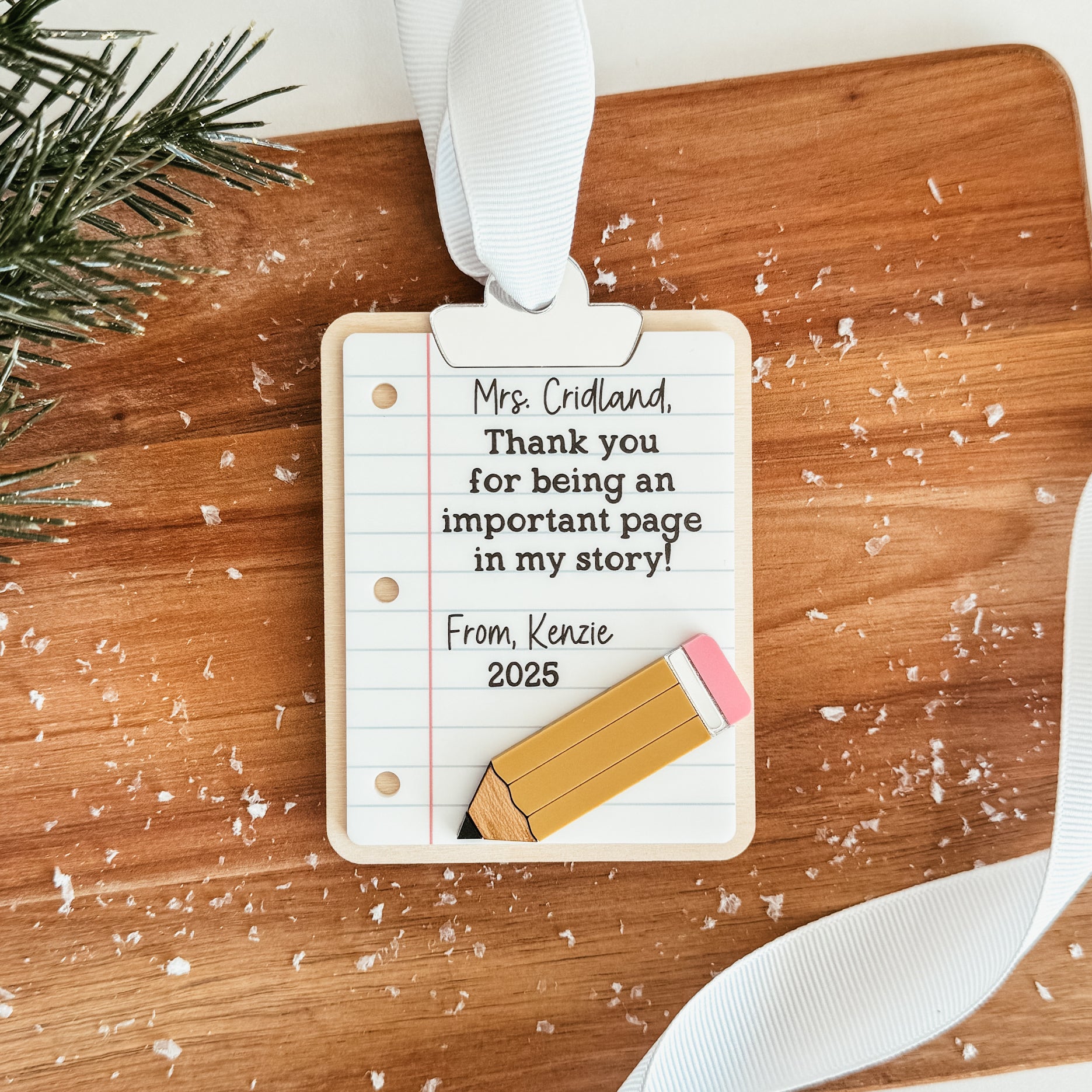 - Shaped like the cutest clipboard and features a printed message with the teacher's name and year