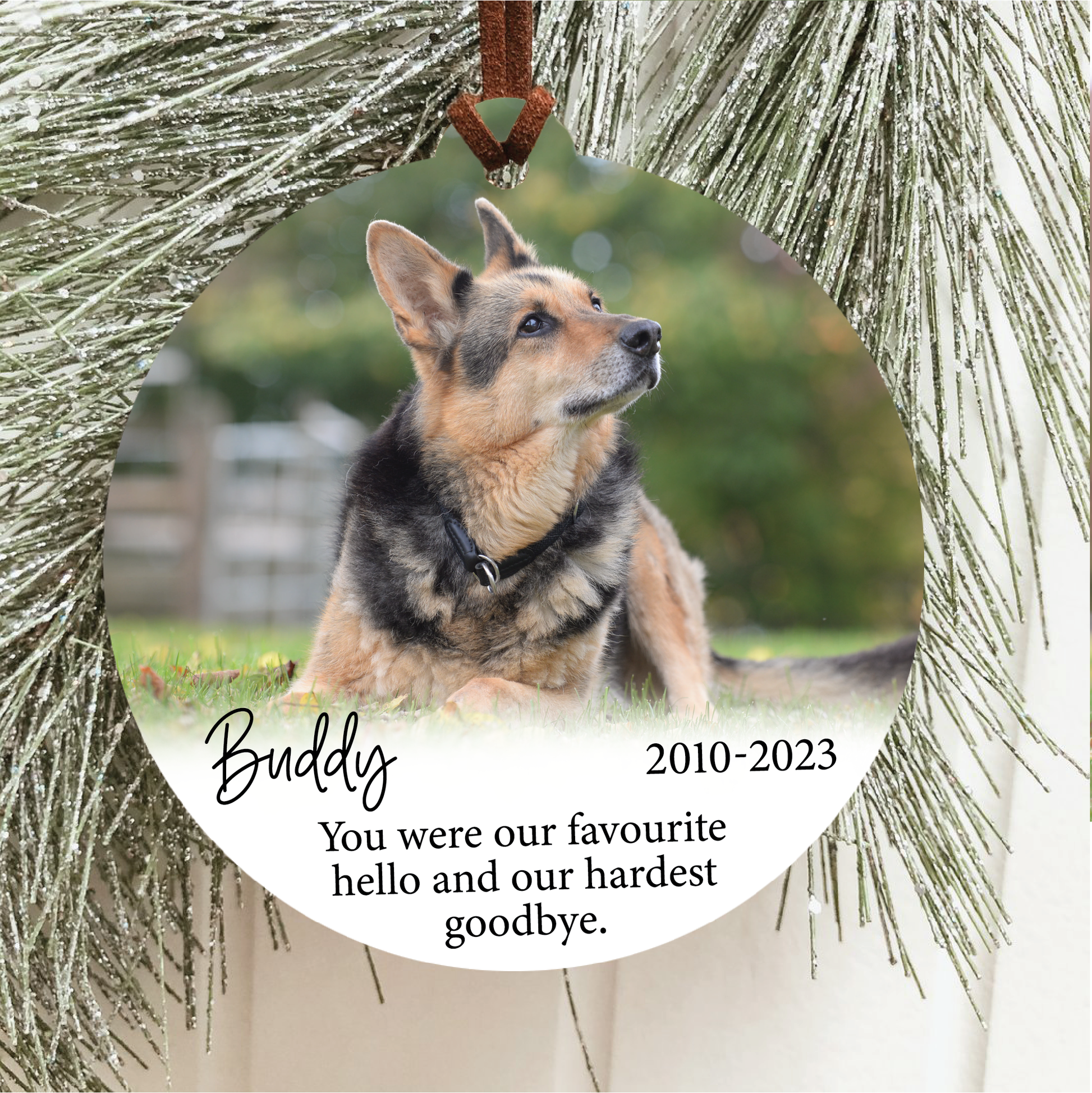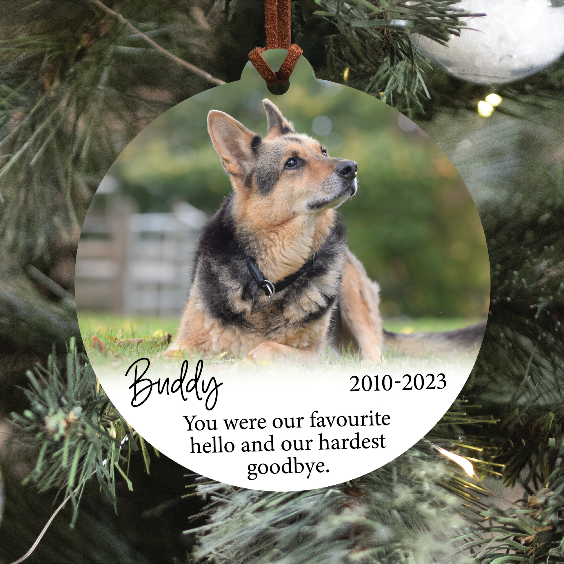 Each ornament is laser cut from 1/8" white acrylic and then printed with permanent ink. They are finished with a brown suede string for a modern look. One side will be printed with your photo and text; the other side will be white.