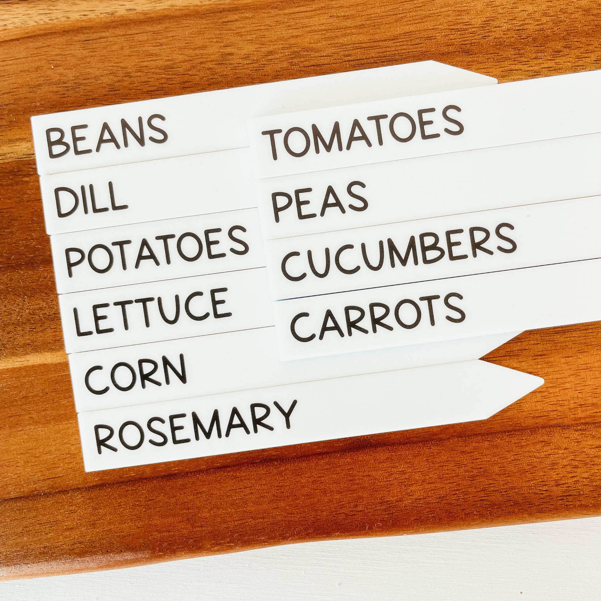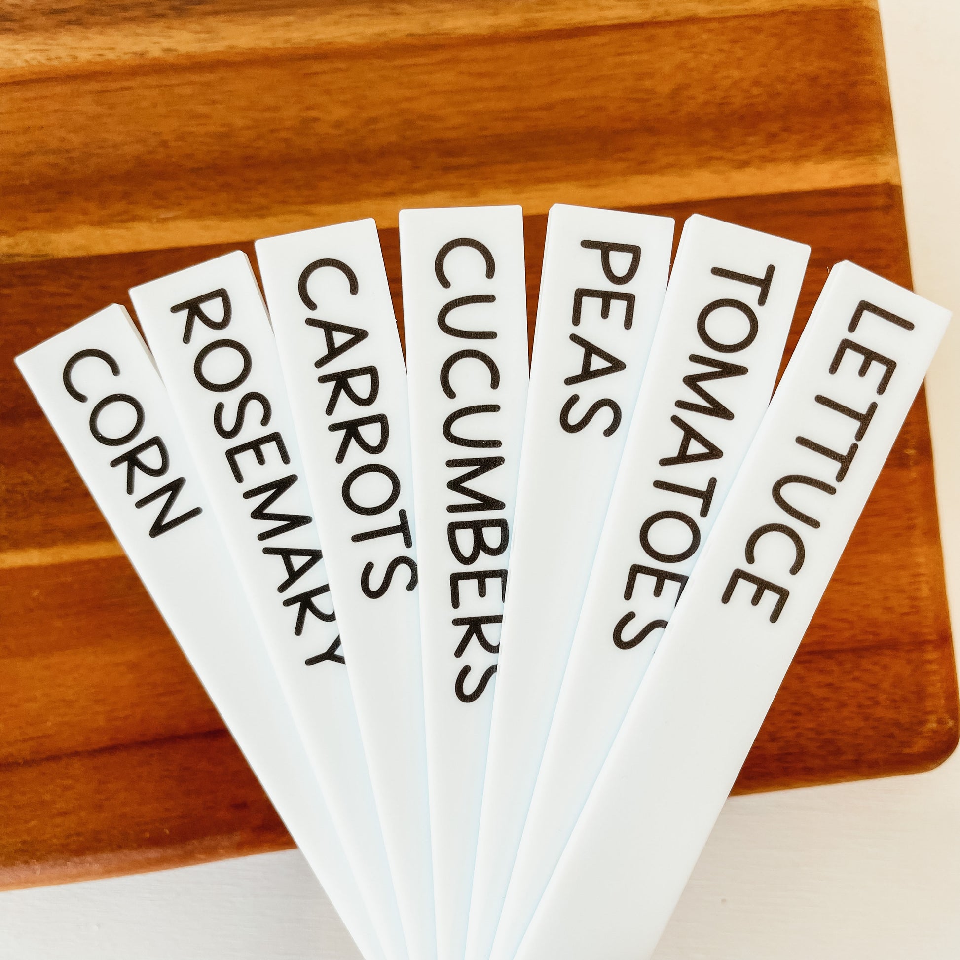 Laser cut from 1/8" thick white acrylic to withstand watering, and printed with permanent ink.