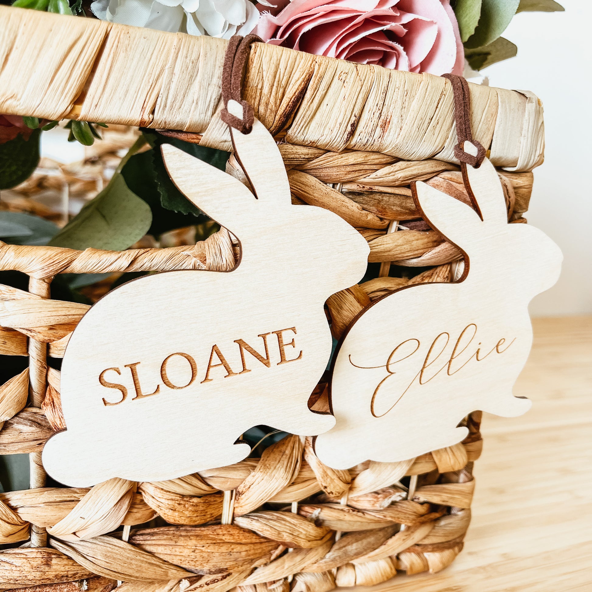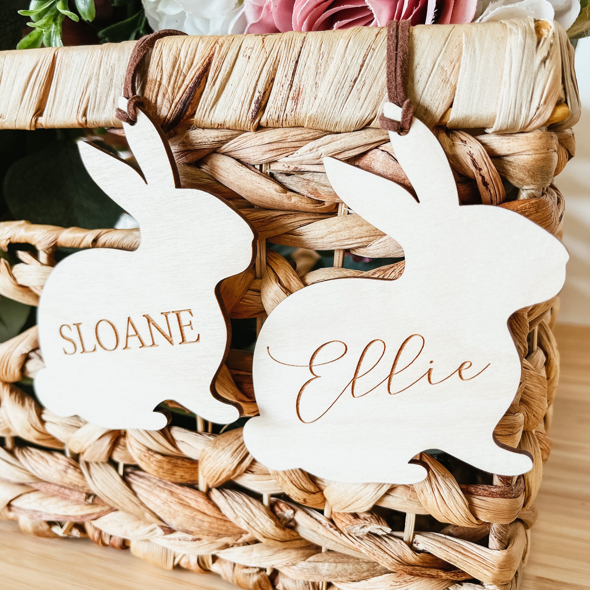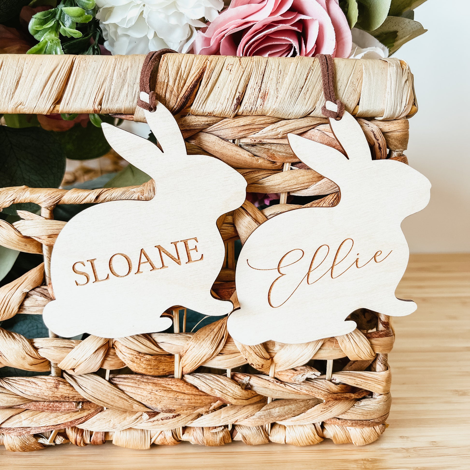 Each tag is cut from 1/8 inch high-quality baltic birch. The name is laser engraved into the wood.