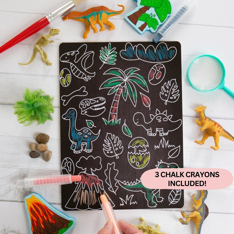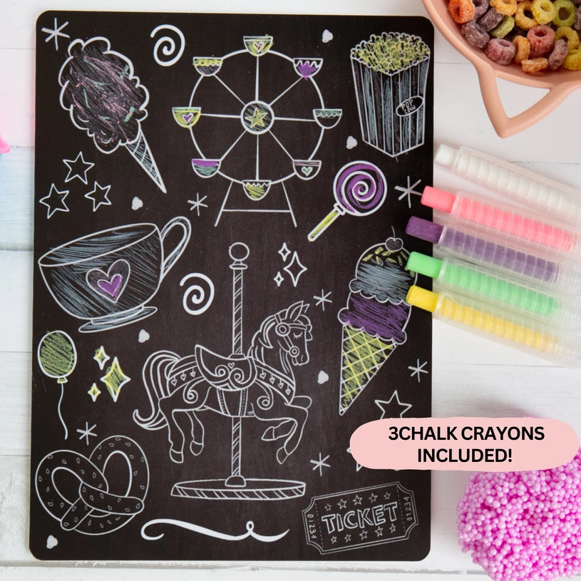 - The mat is 8" x 11" and double sided and include 3 chalk crayons