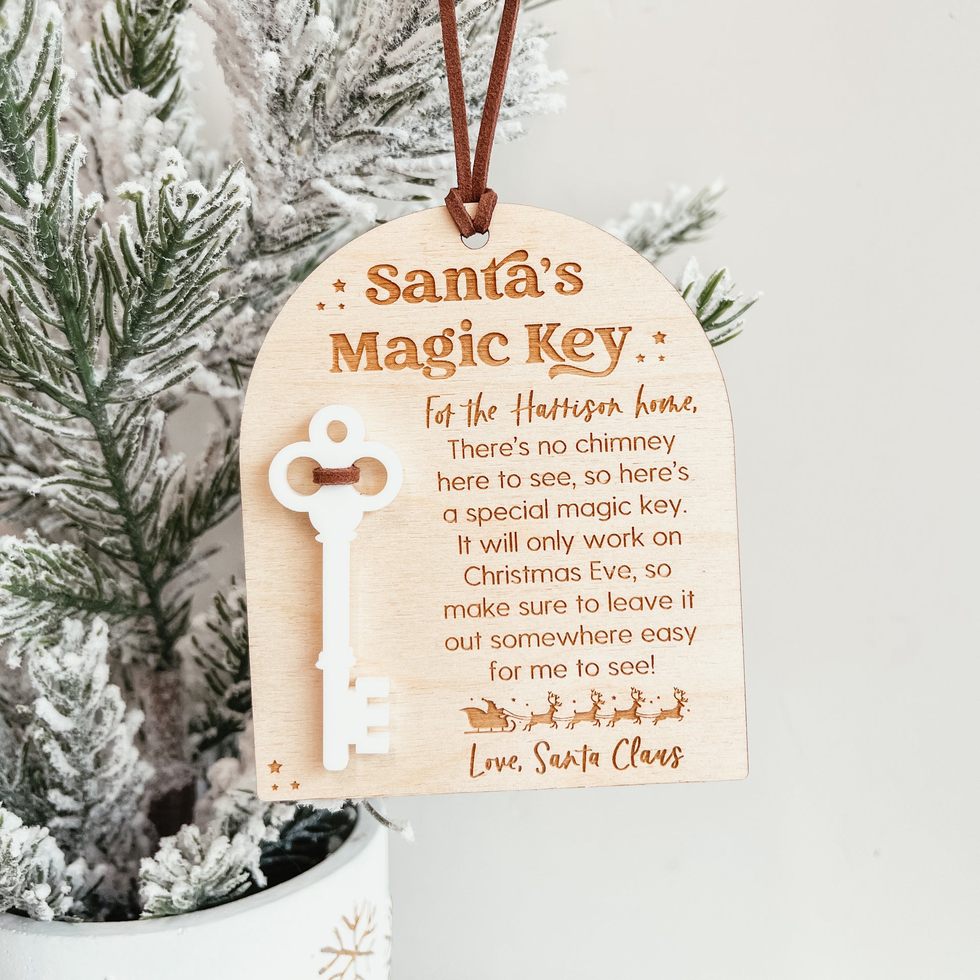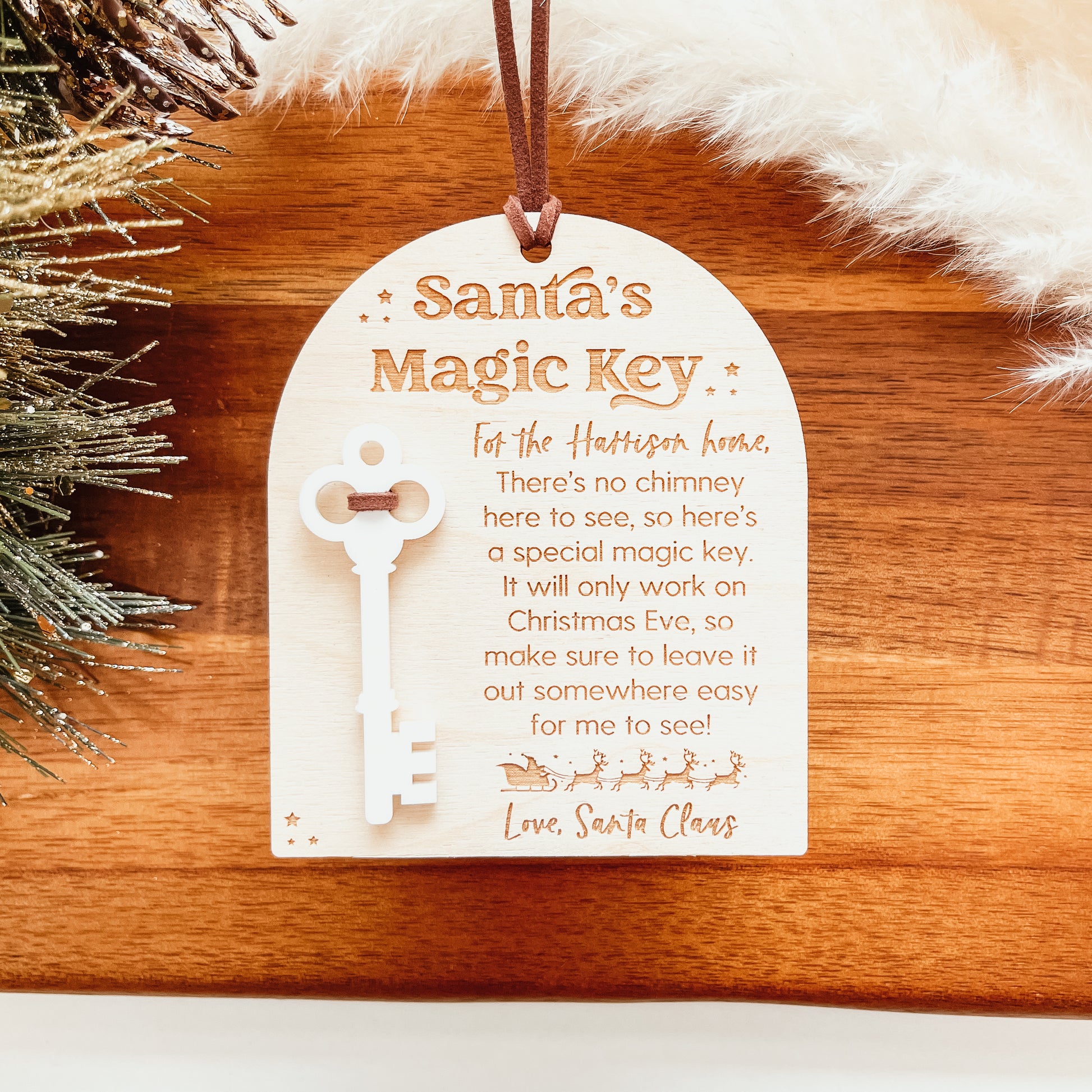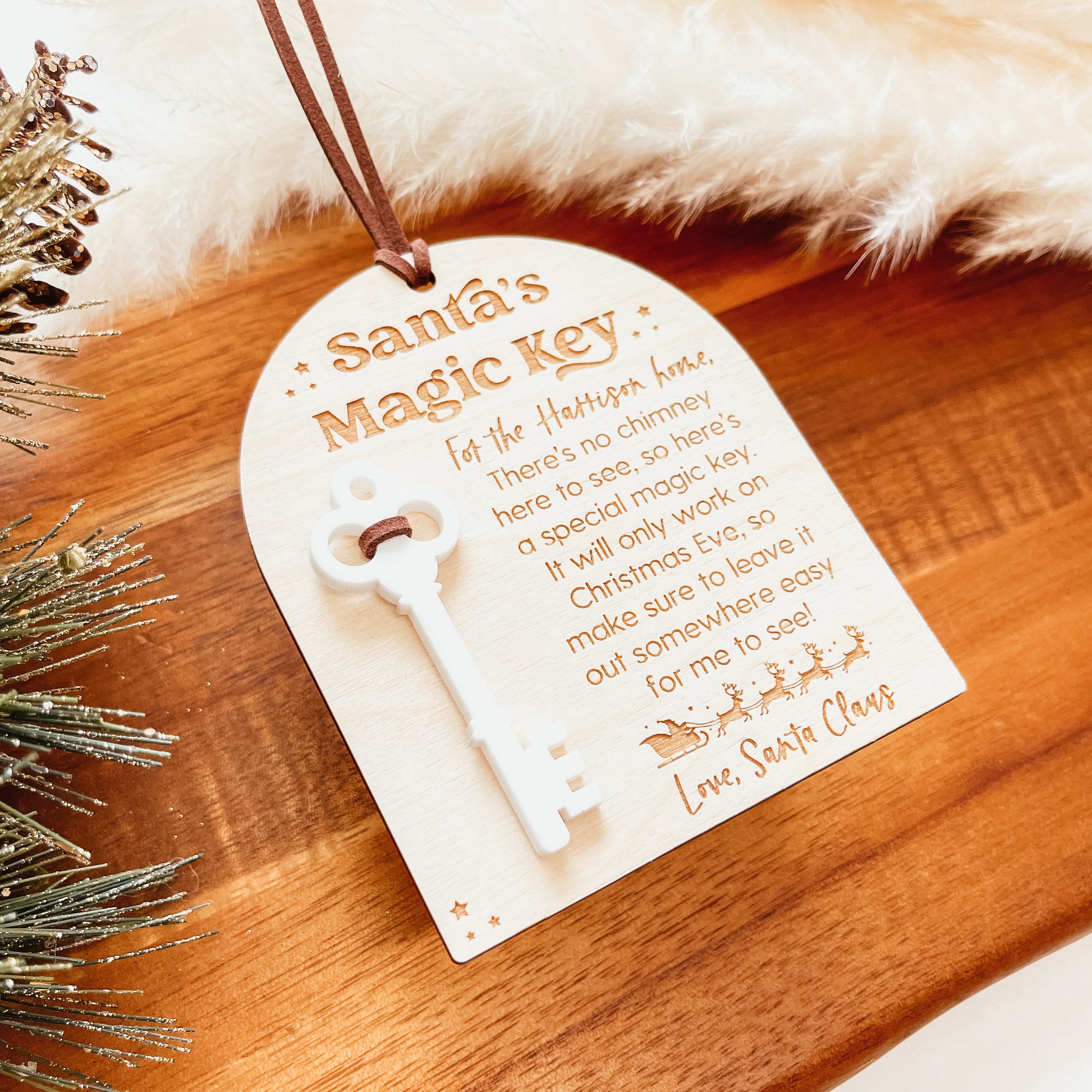 Engraved onto natural birch wood and features a white acrylic key. Finished with a brown suede string and individually packaged.