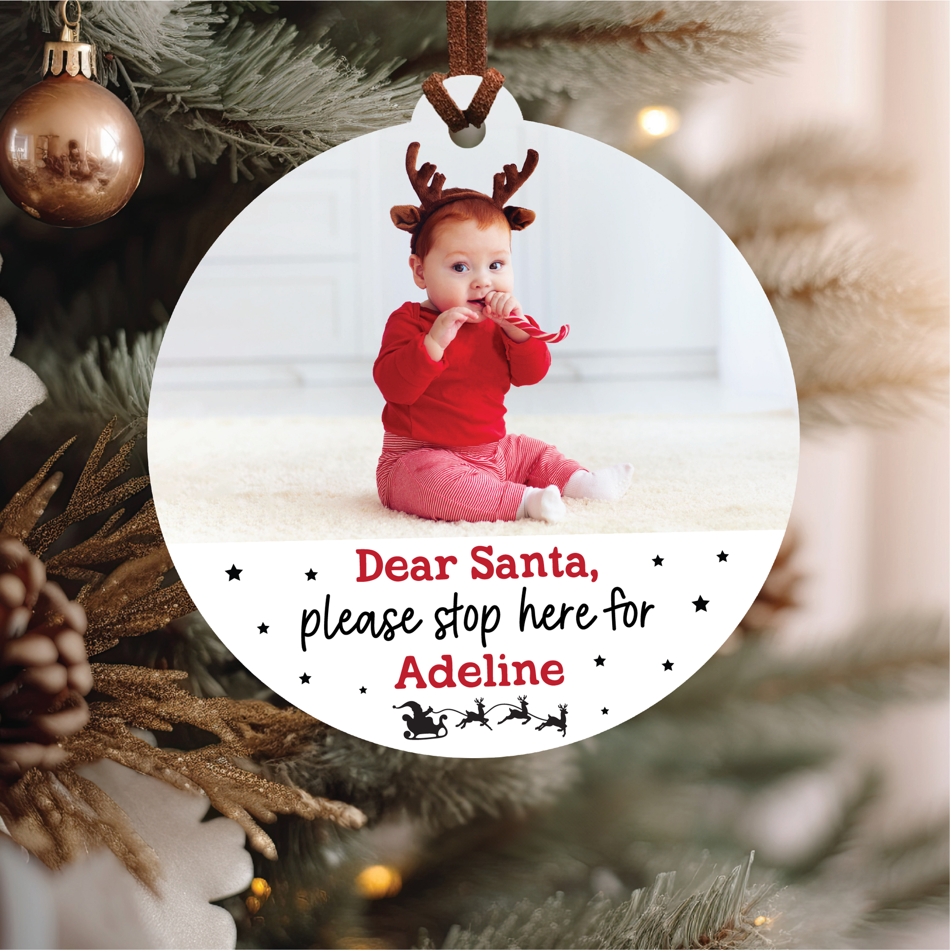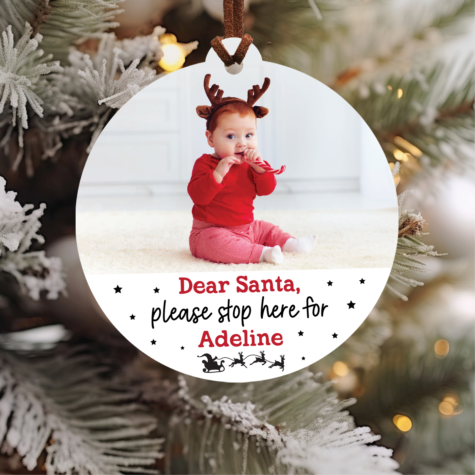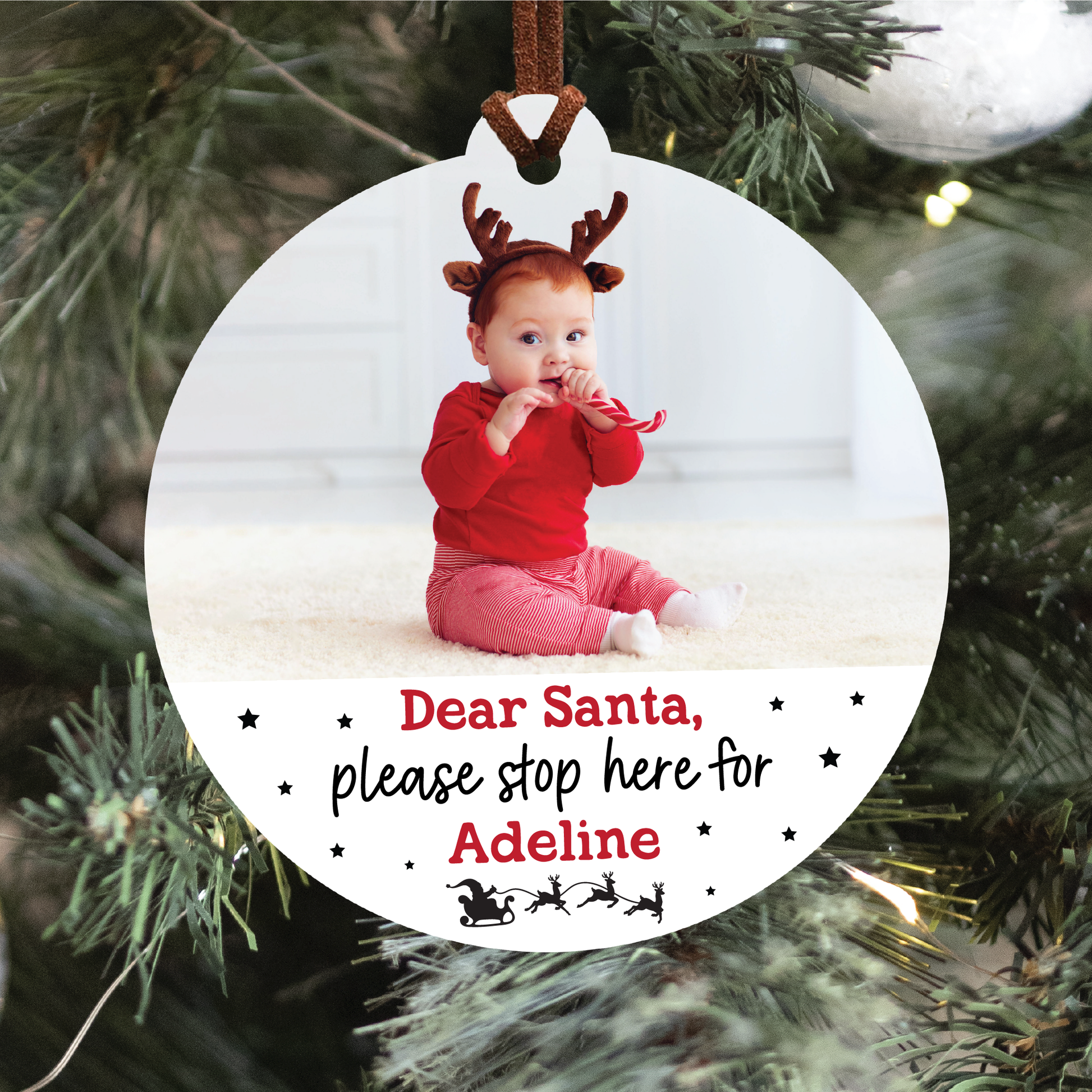Each ornament is laser cut from 1/8" white acrylic and then printed with permanent ink. They are finished with a brown suede string for a modern look. One side will be printed with your photo and text; the other side will be white.
